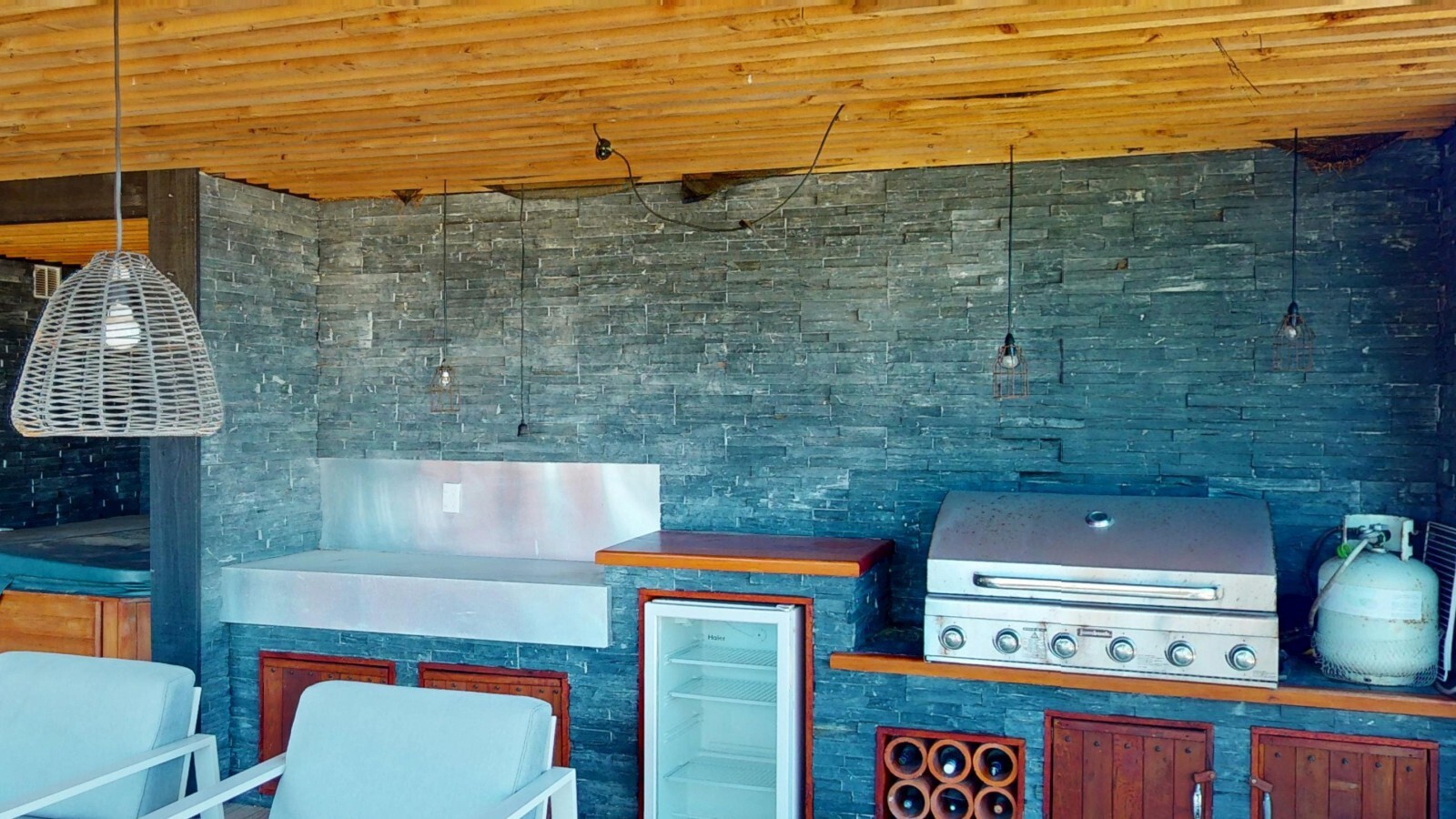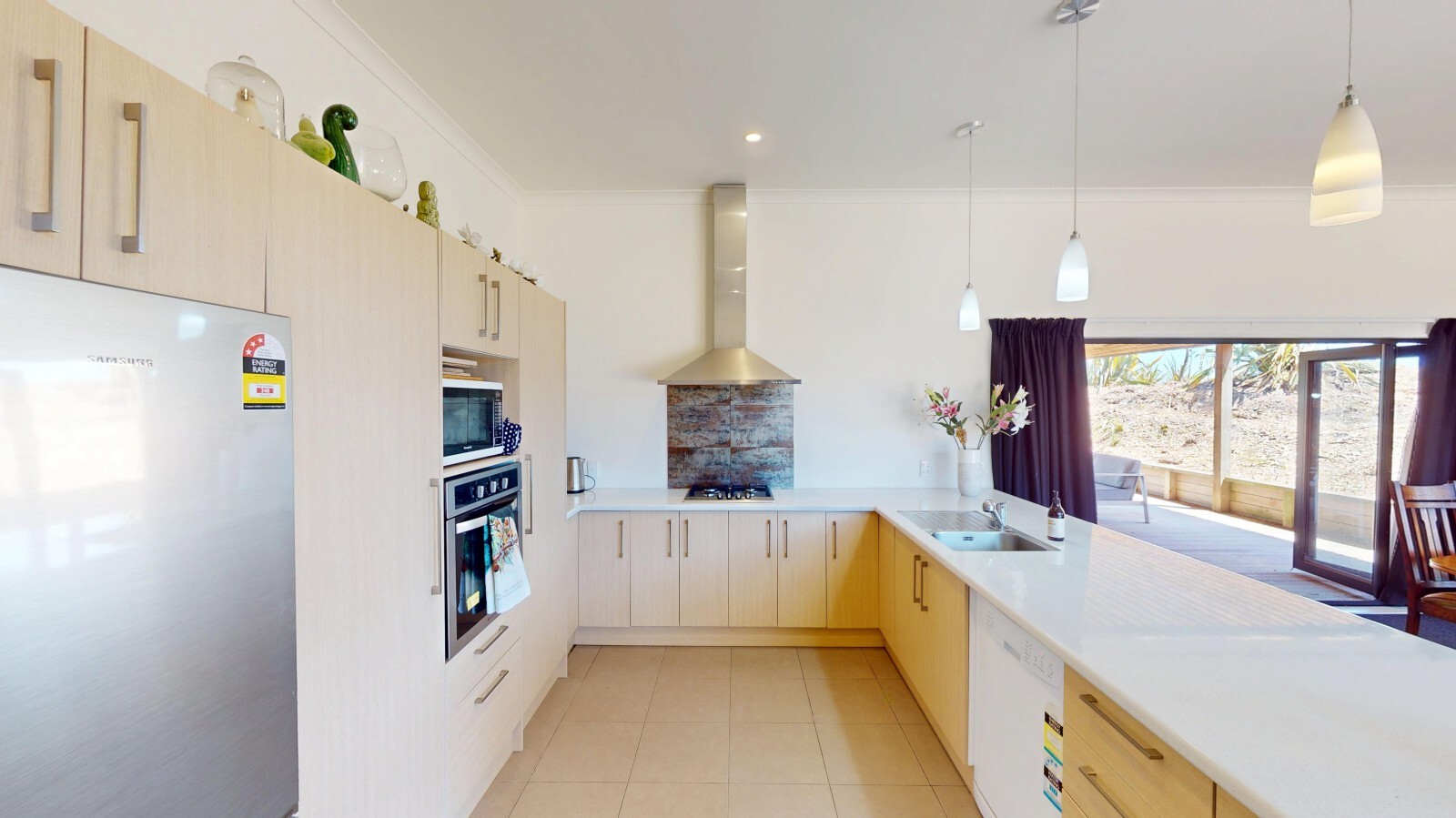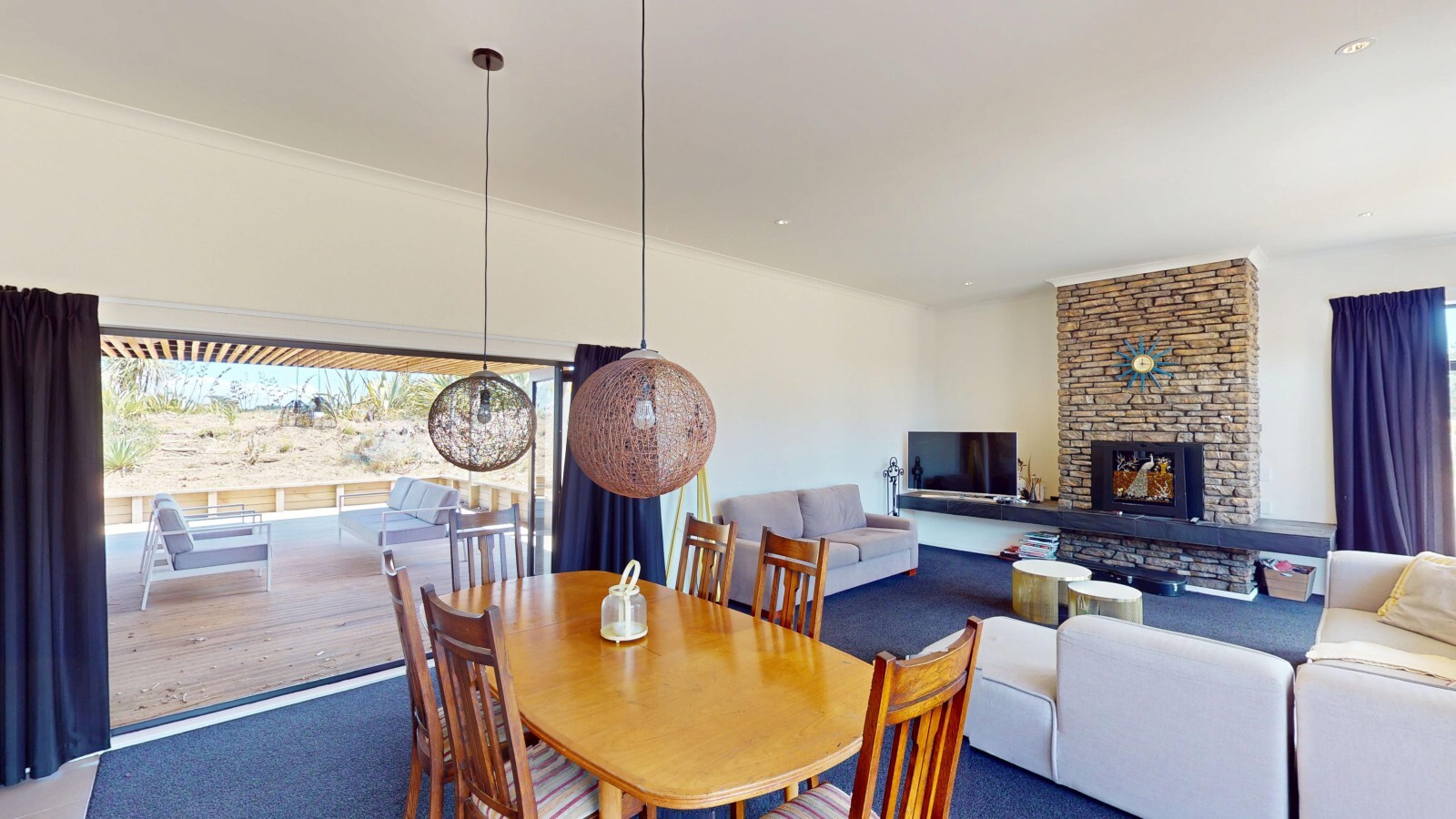The home is an entertainer’s dream, with an expansive living area, multiple outdoor settings, and seamless indoor–outdoor flow. The main living room features a striking stone-clad chimney and bi-fold doors on both sides, opening to a sheltered alfresco area complete with an outdoor kitchen and spa nook. The modern kitchen includes a large breakfast bar and ample storage, making it ideal for hosting family and friends.