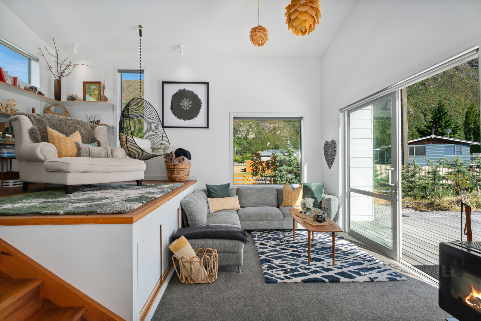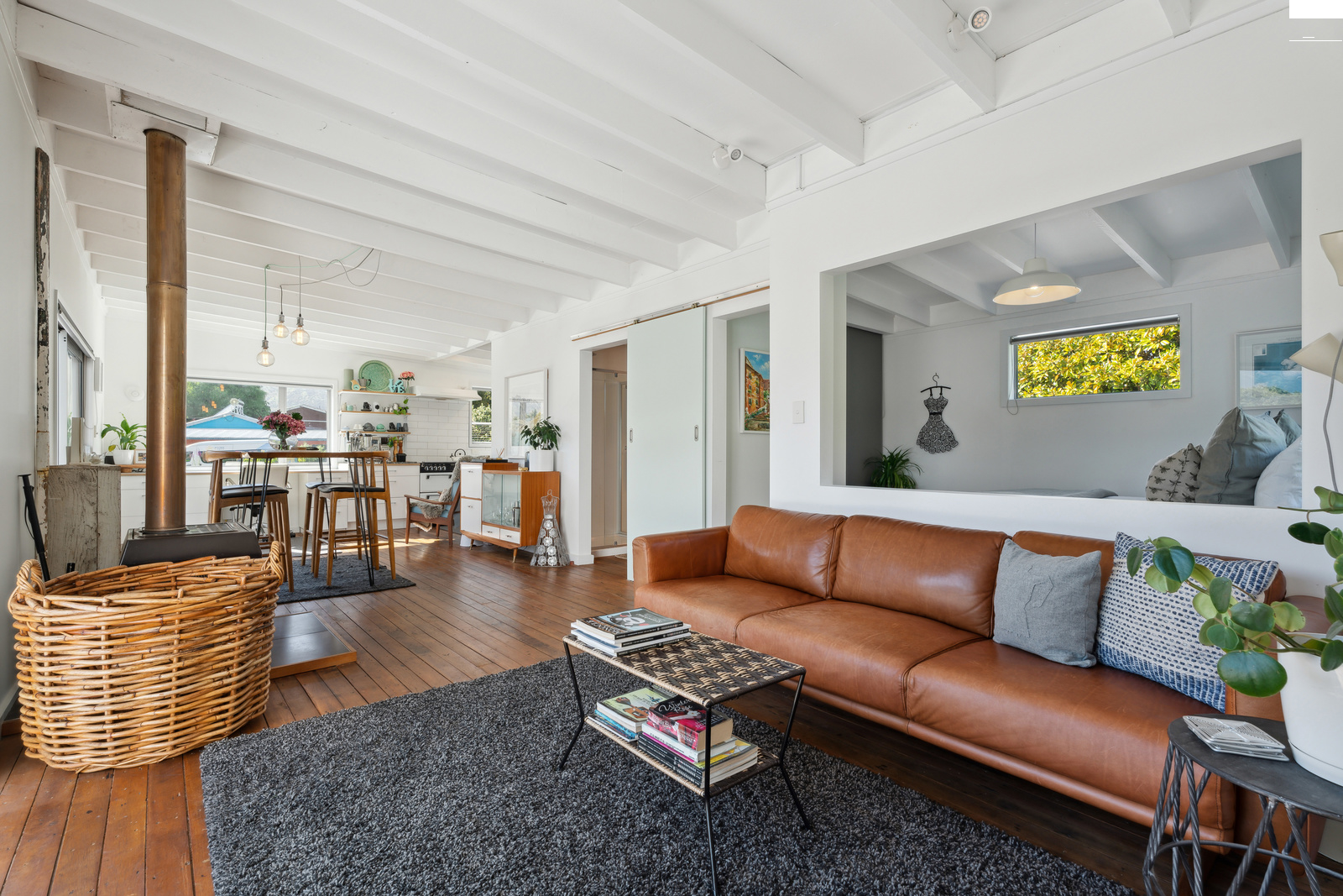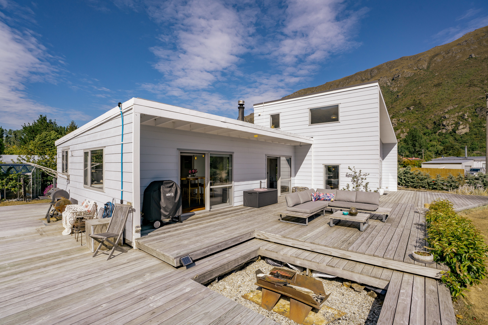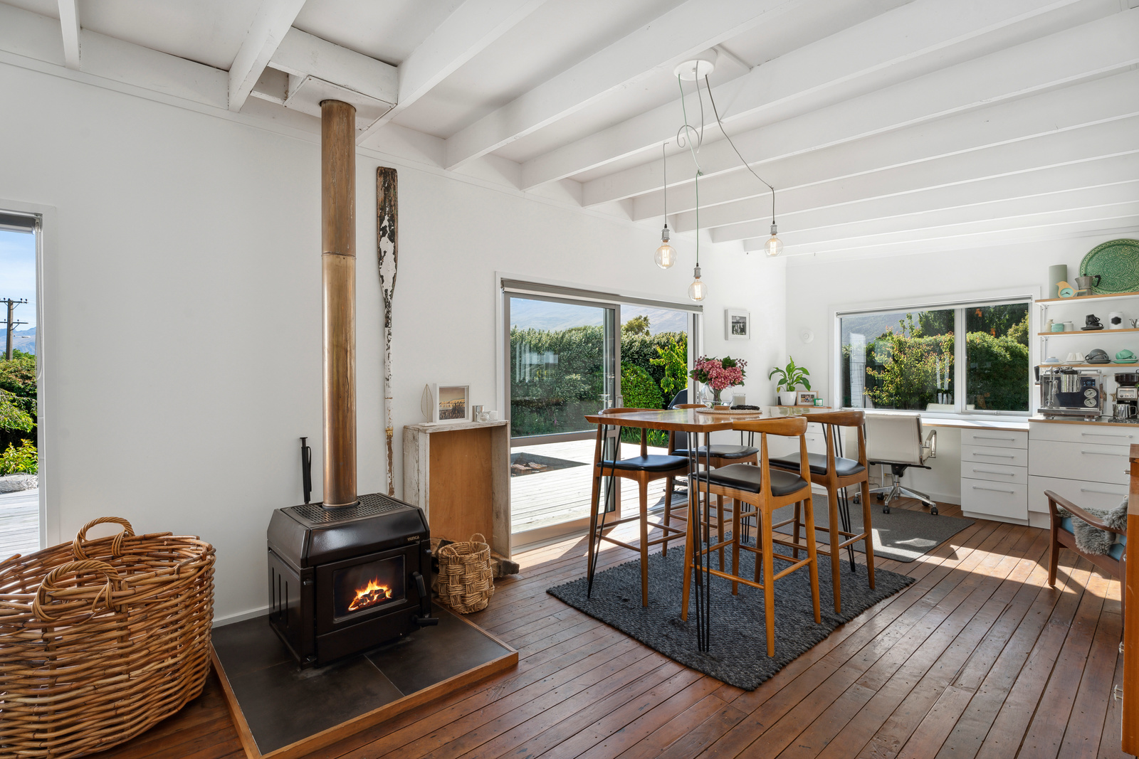 This home has a clever design to allow complete separation with one side being able to be closed off to have family and friends or potential income away from the main living of the home. Although only two bedrooms and two bathrooms this property offers so much more with large expansive ceiling heights, multiple living areas on different levels, great heating with two wood burners and a very spacious sleepout in the garden. The expansive spacious decks flow out the large sliding doors from both living spaces of the home with a private and sheltered social space around the fire pit.