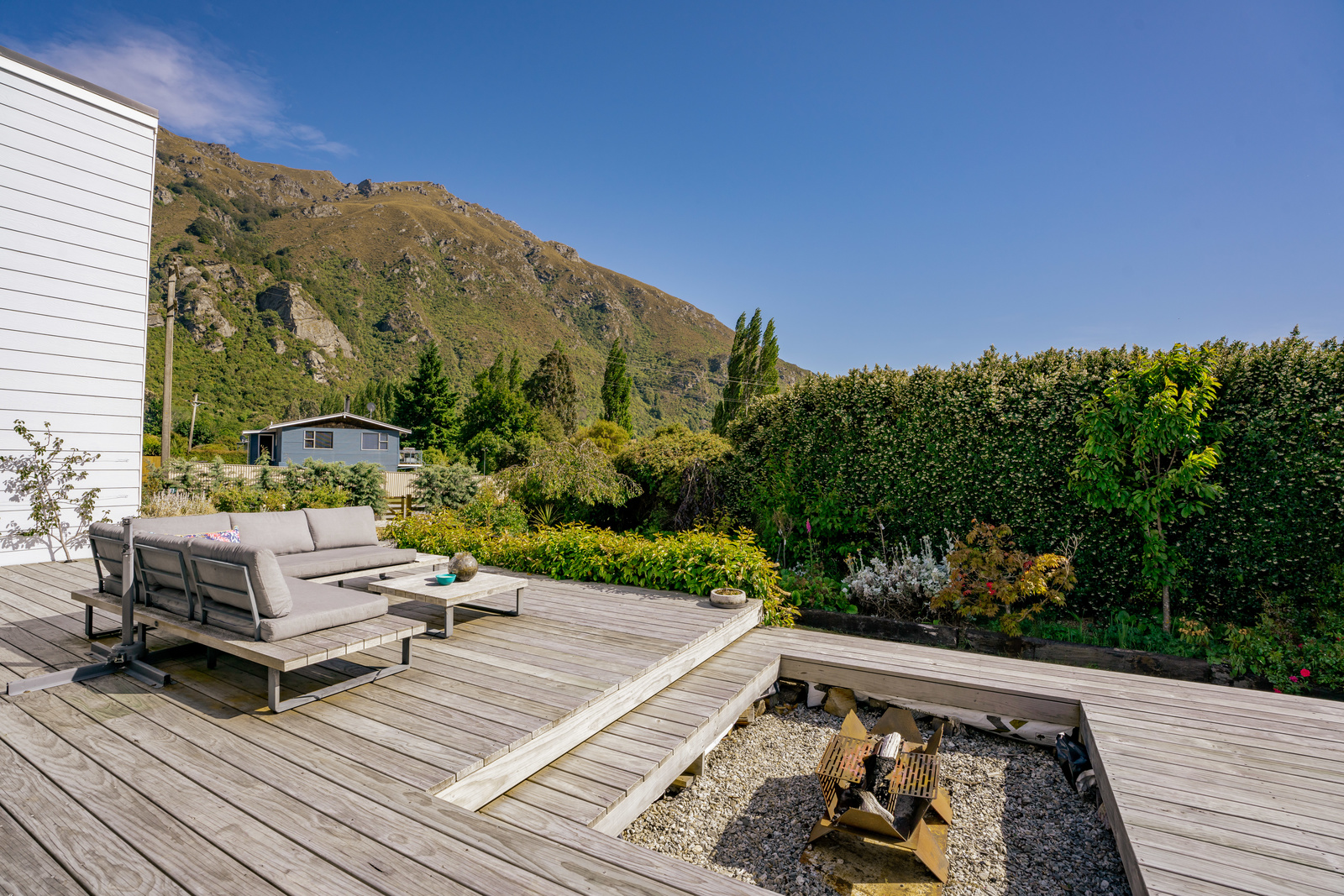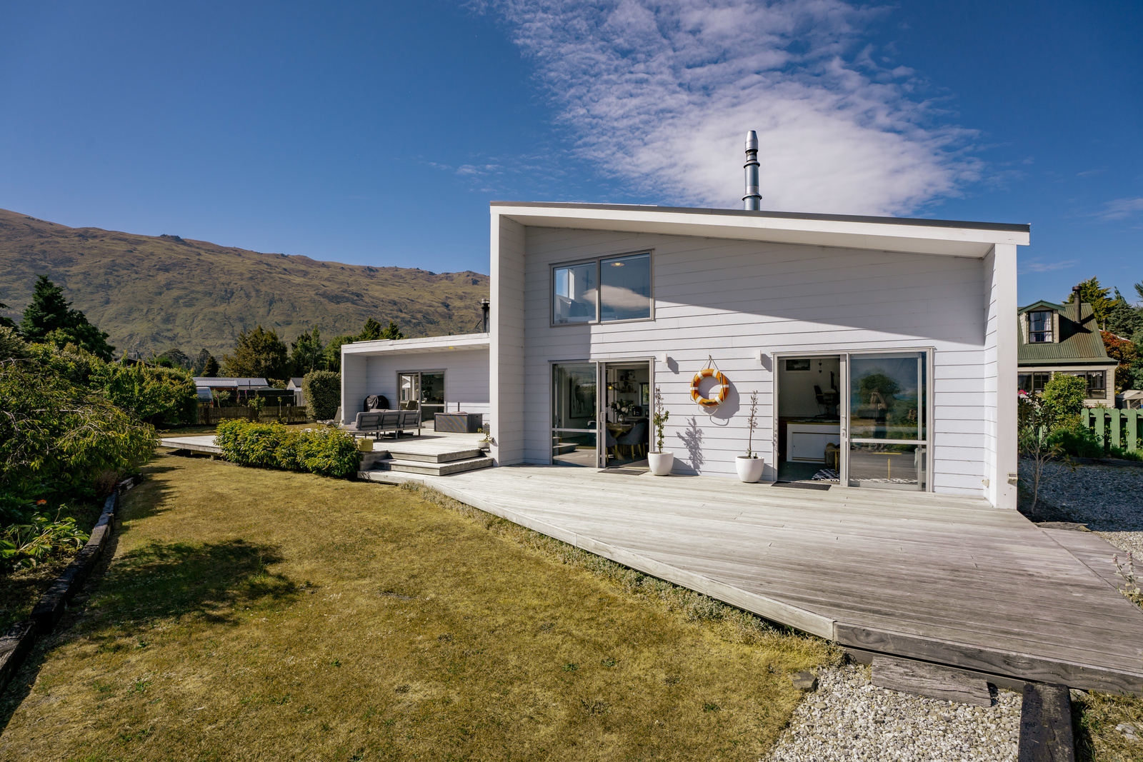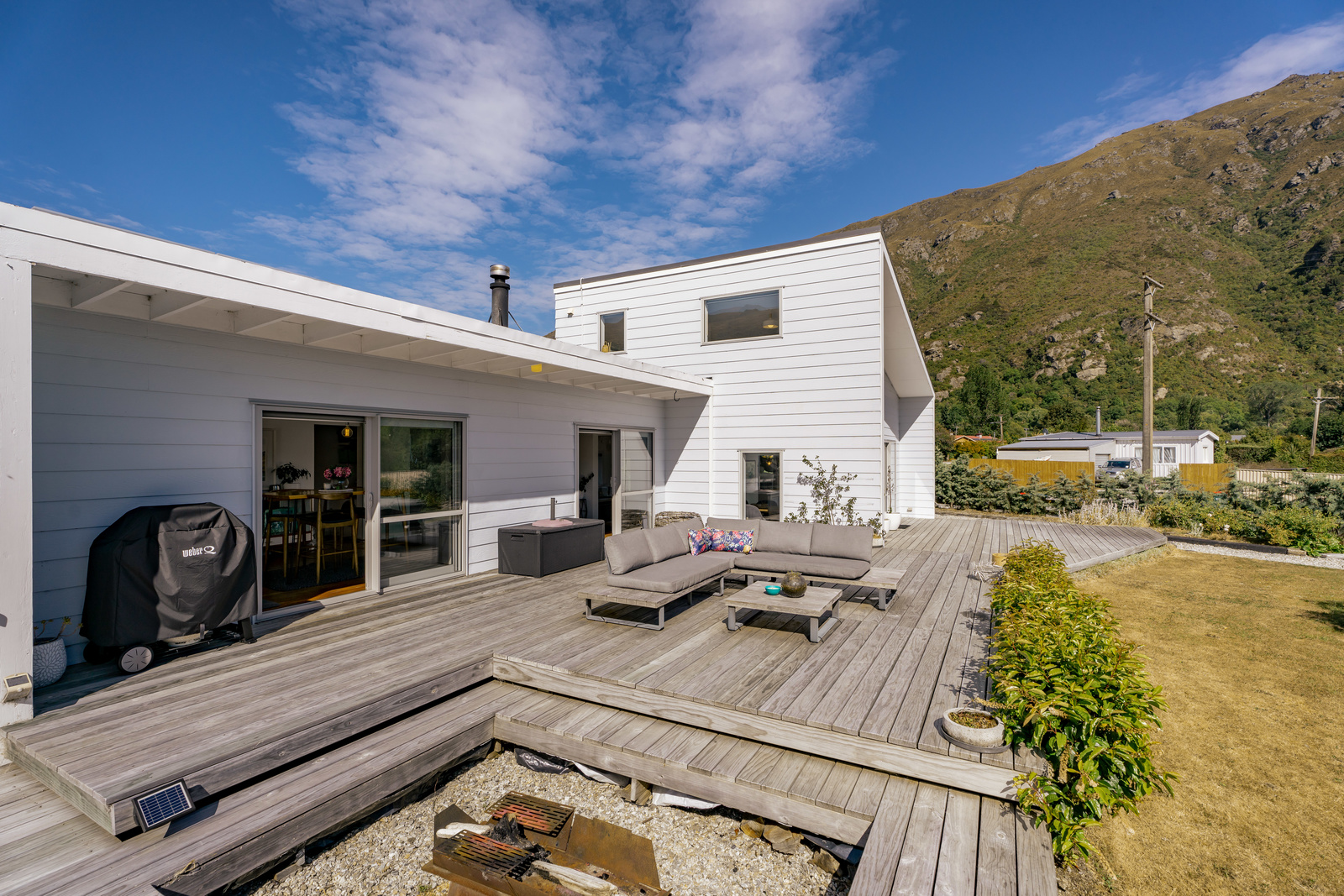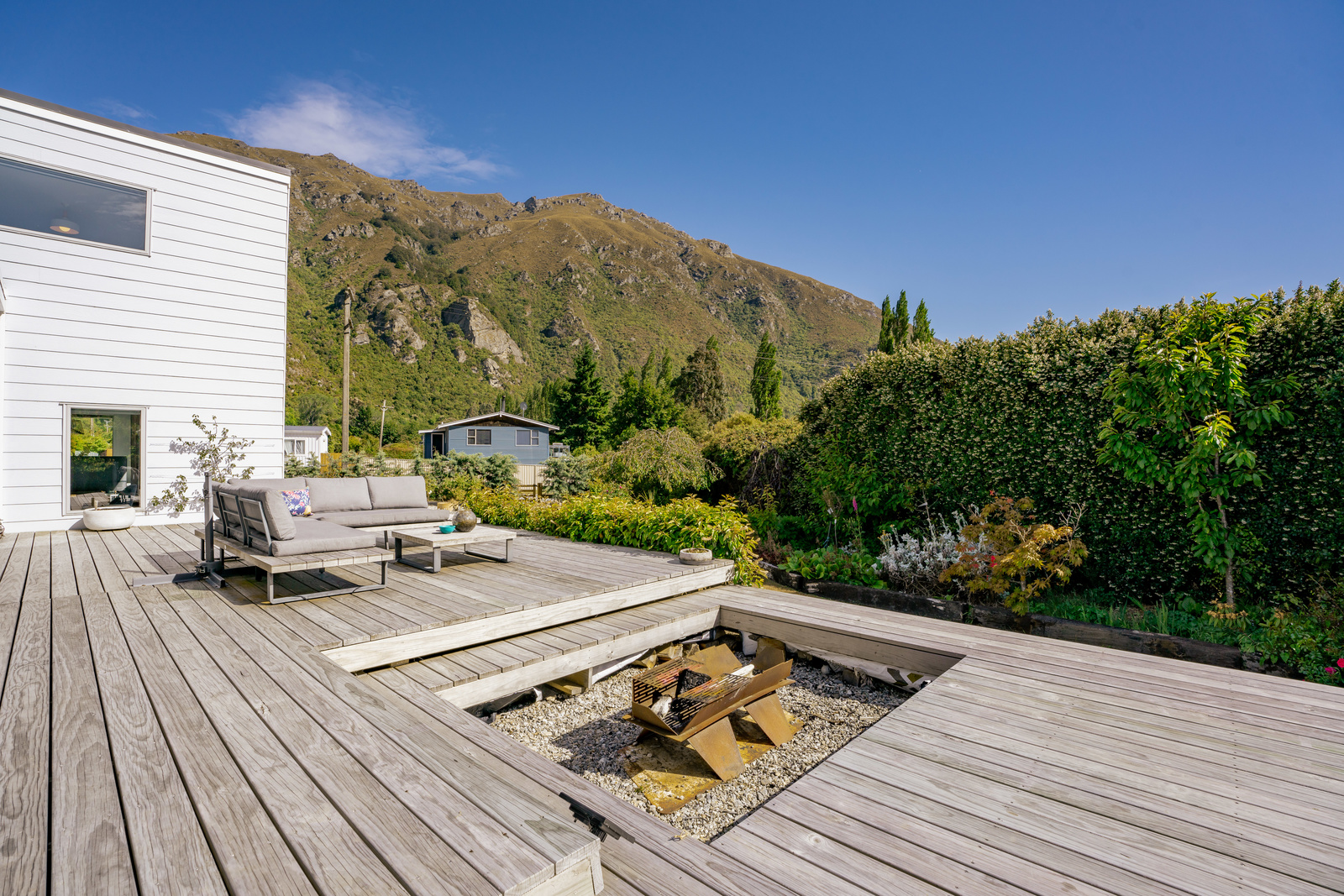 This home has a clever design to allow complete separation with one side being able to be closed off to have family and friends or potential income away from the main living of the home. Although only two bedrooms and two bathrooms this property offers so much more with large expansive ceiling heights, multiple living areas on different levels, great heating with two wood burners and a very spacious sleepout in the garden. The expansive spacious decks flow out the large sliding doors from both living spaces of the home with a private and sheltered social space around the fire pit.