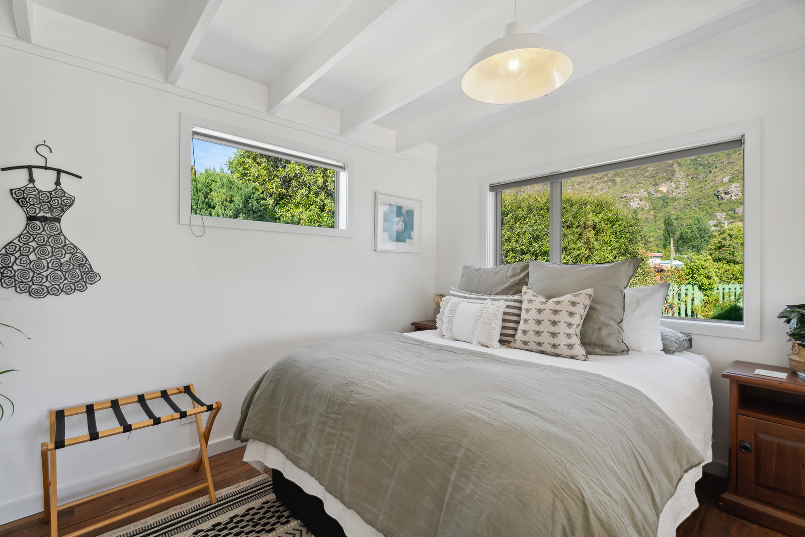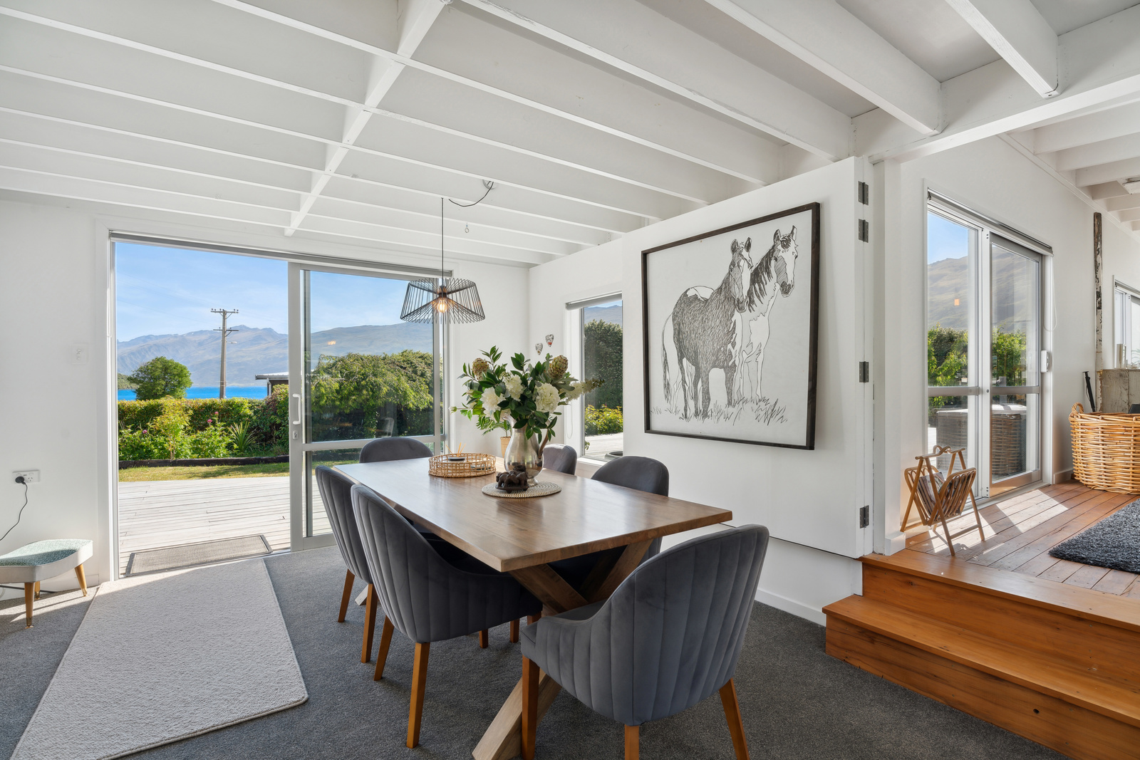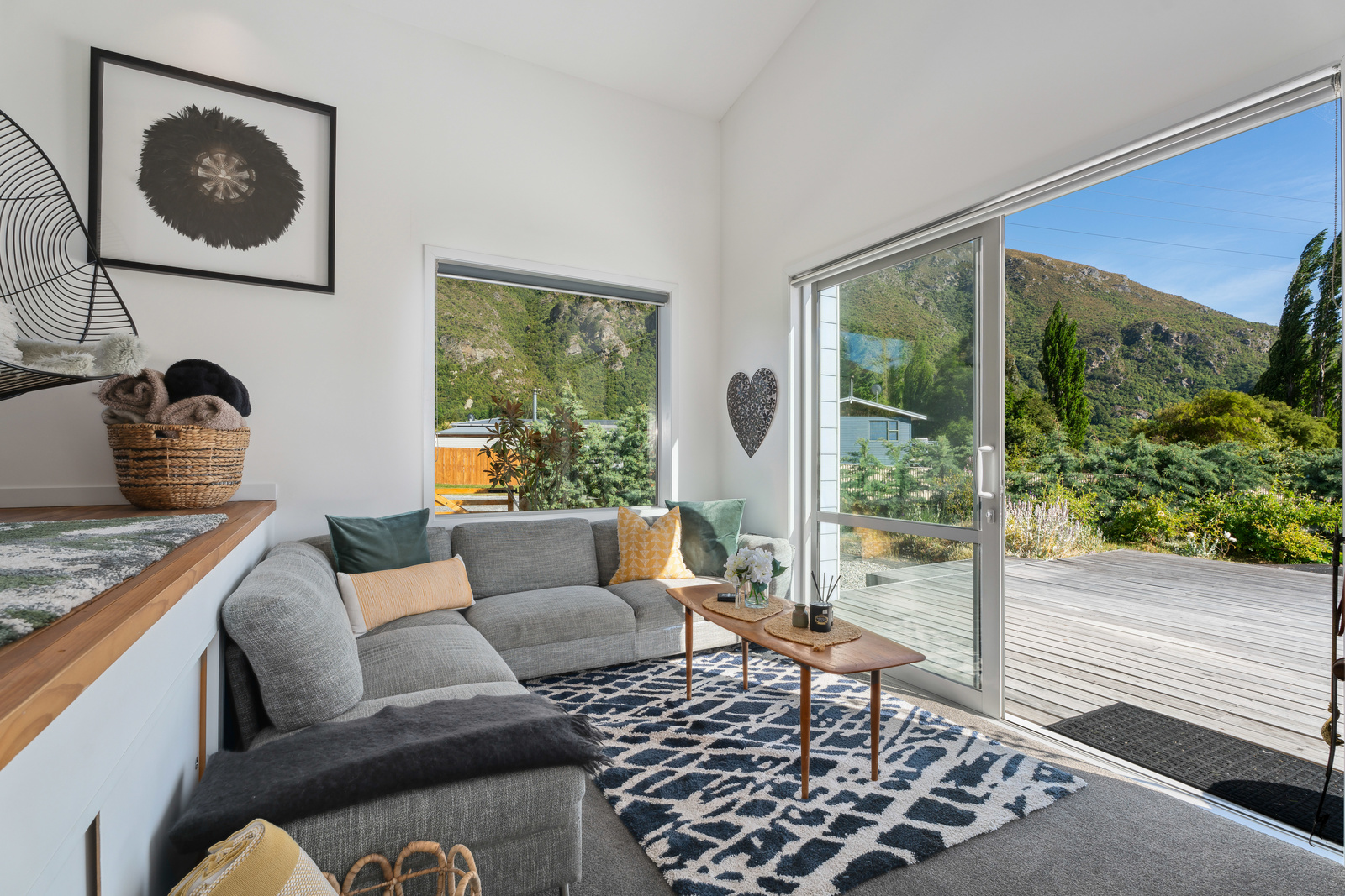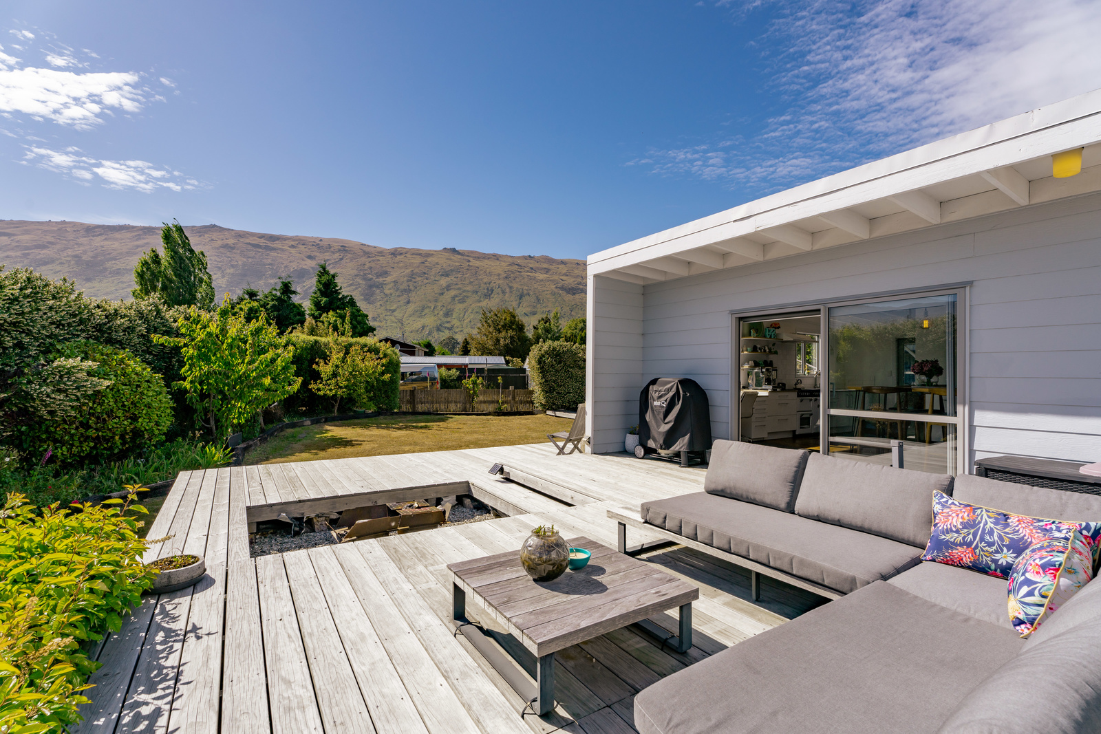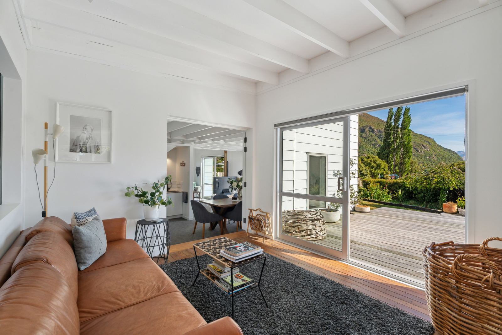 This home has a clever design to allow complete separation with one side being able to be closed off to have family and friends or potential income away from the main living of the home. Although only two bedrooms and two bathrooms this property offers so much more with large expansive ceiling heights, multiple living areas on different levels, great heating with two wood burners and a very spacious sleepout in the garden. The expansive spacious decks flow out the large sliding doors from both living spaces of the home with a private and sheltered social space around the fire pit.
