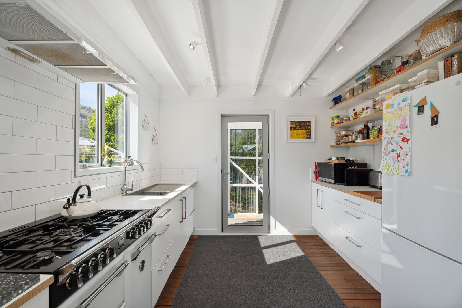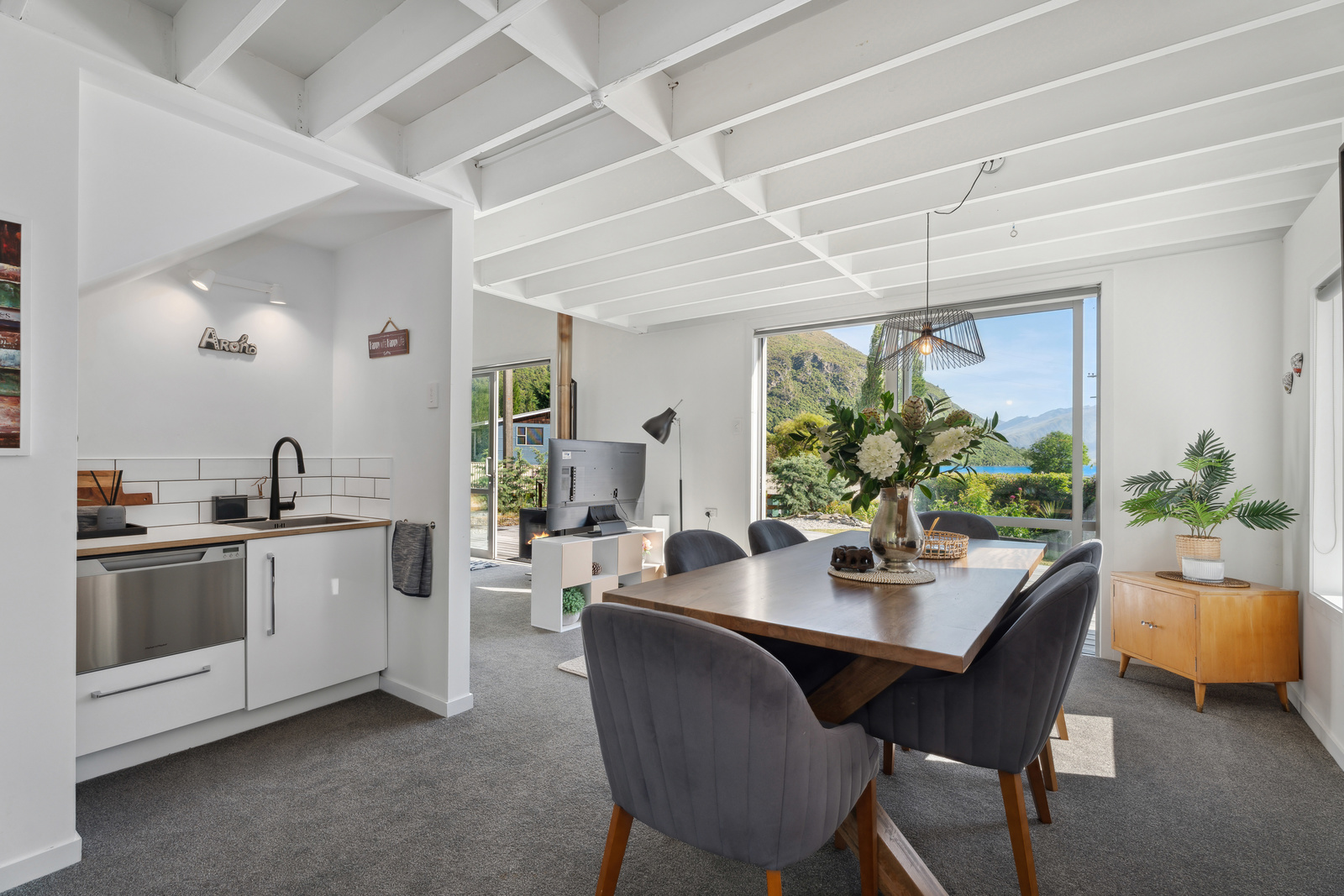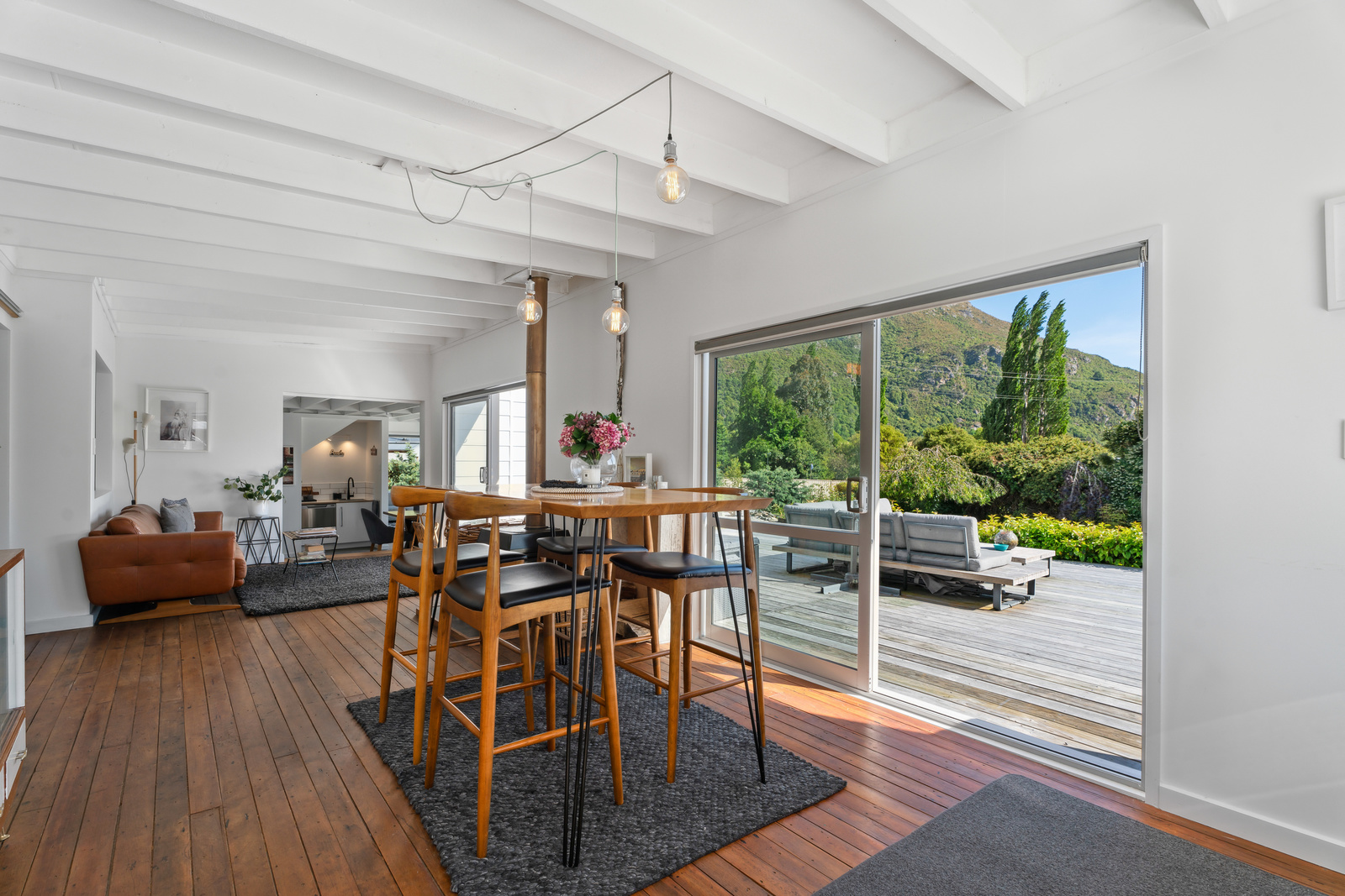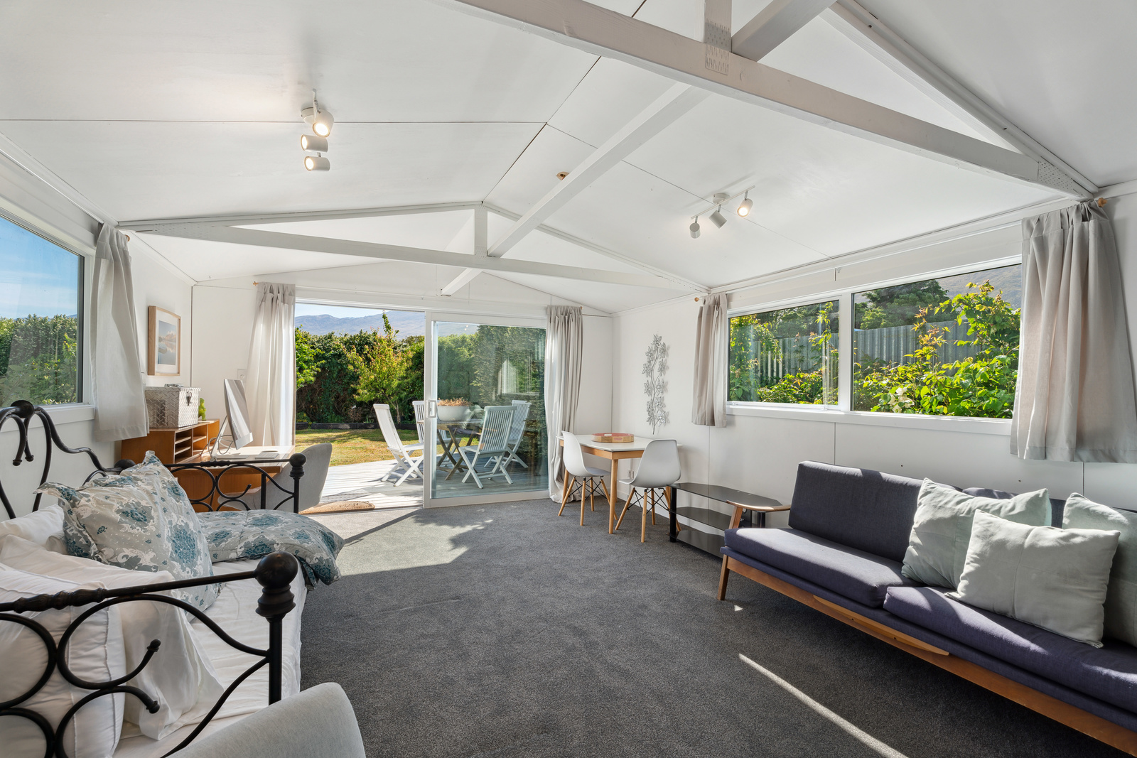 This home has a clever design to allow complete separation with one side being able to be closed off to have family and friends or potential income away from the main living of the home. Although only two bedrooms and two bathrooms this property offers so much more with large expansive ceiling heights, multiple living areas on different levels, great heating with two wood burners and a very spacious sleepout in the garden. The expansive spacious decks flow out the large sliding doors from both living spaces of the home with a private and sheltered social space around the fire pit.