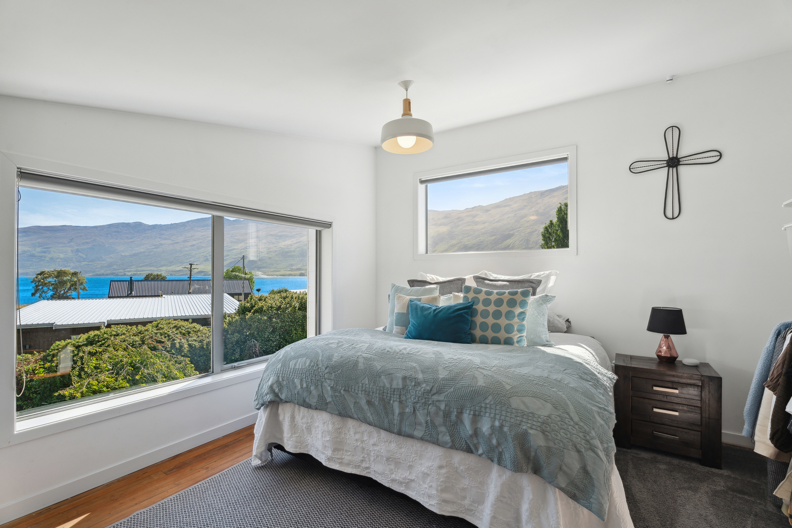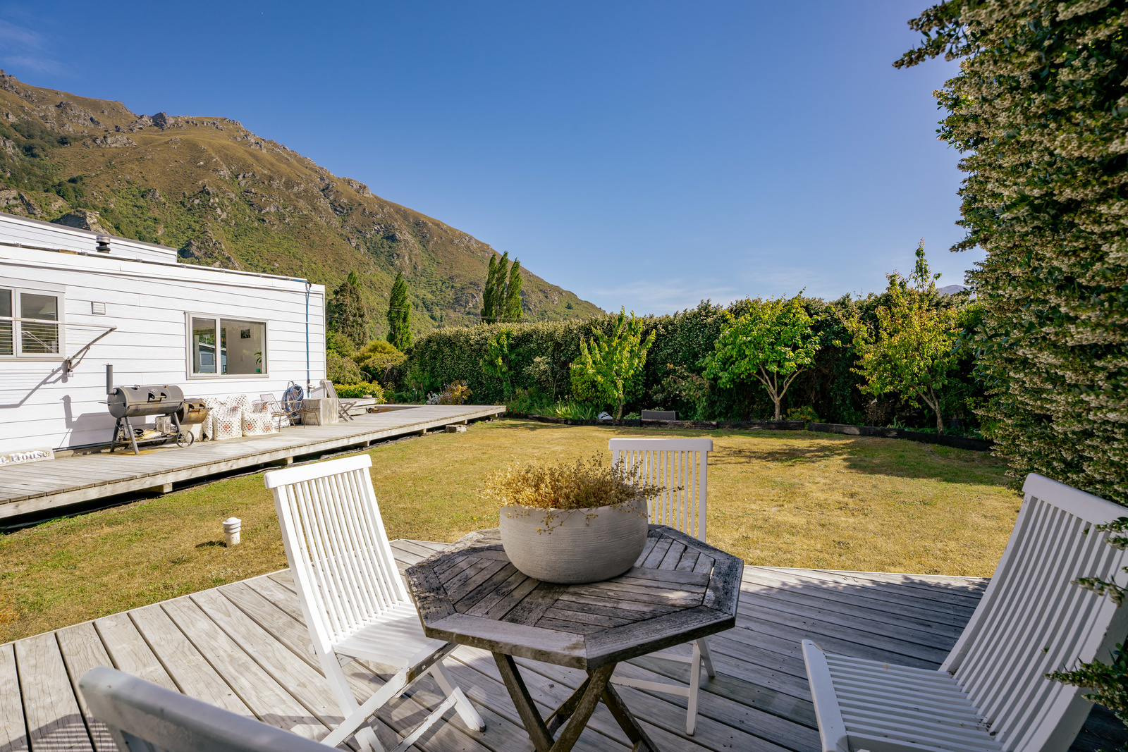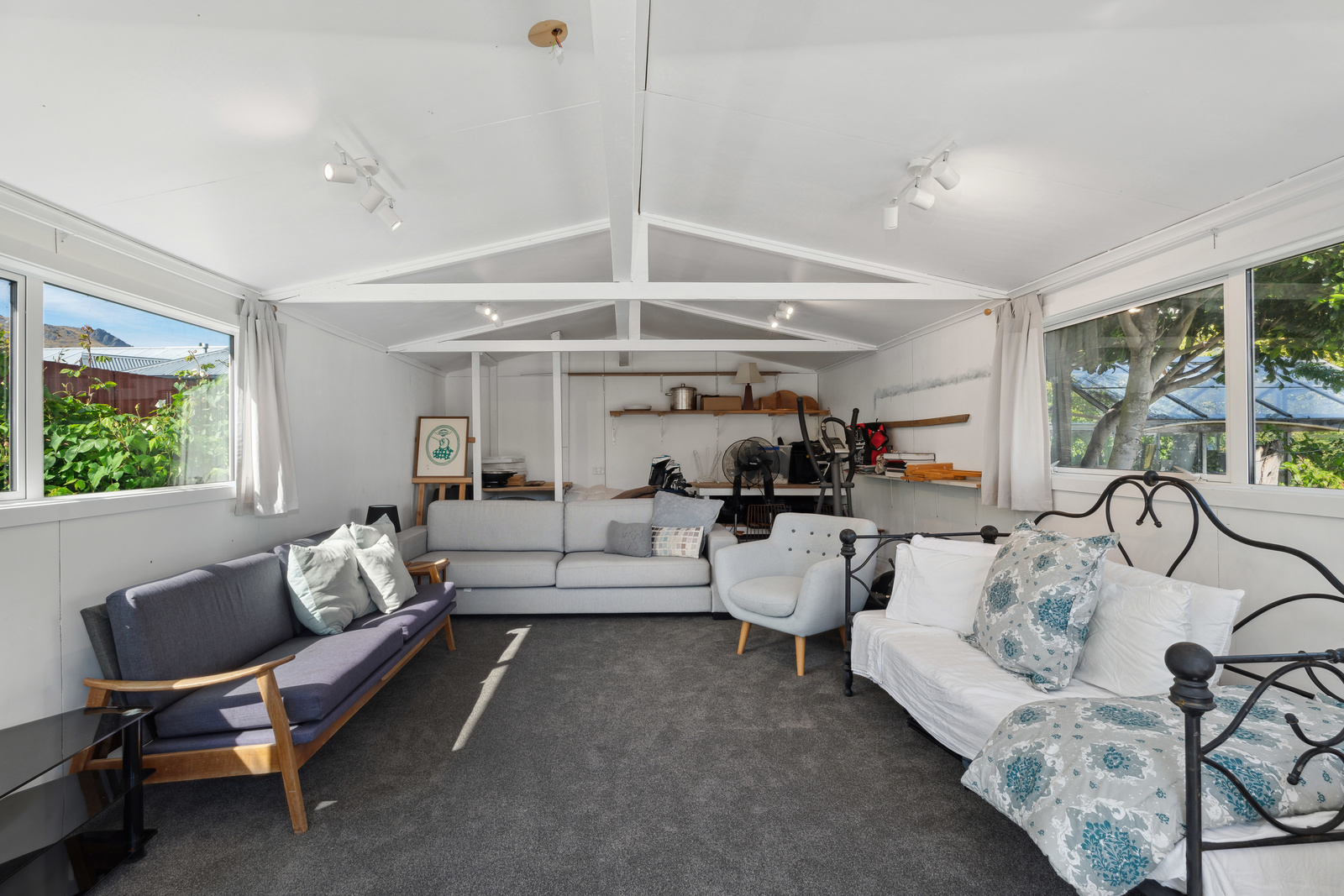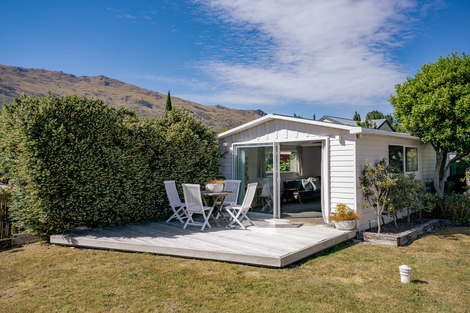This home has a clever design to allow complete separation with one side being able to be closed off to have family and friends or potential income away from the main living of the home. Although only two bedrooms and two bathrooms this property offers so much more with large expansive ceiling heights, multiple living areas on different levels, great heating with two wood burners and a very spacious sleepout in the garden. The expansive spacious decks flow out the large sliding doors from both living spaces of the home with a private and sheltered social space around the fire pit.