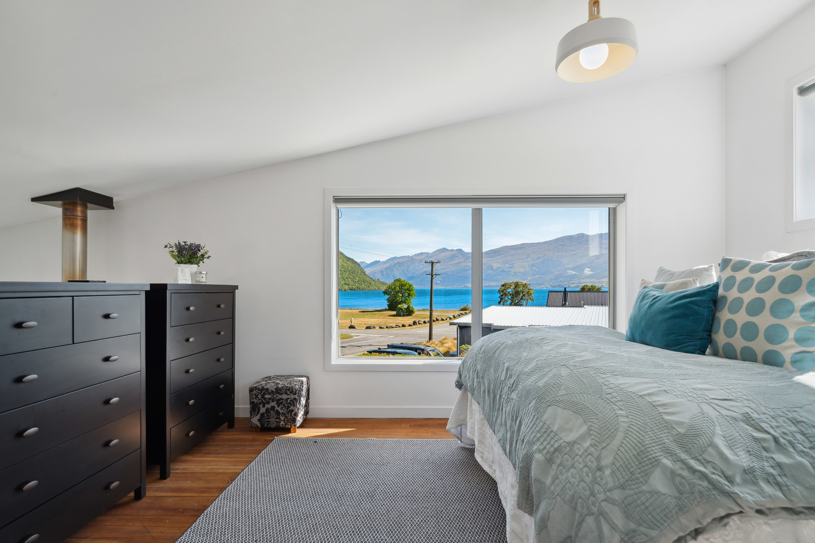 The kitchen has modern appliances and offers plenty of space and storage with a computer area to the side of the kitchen. The upstairs bedroom features incredible views to enjoy a morning coffee from your bed.