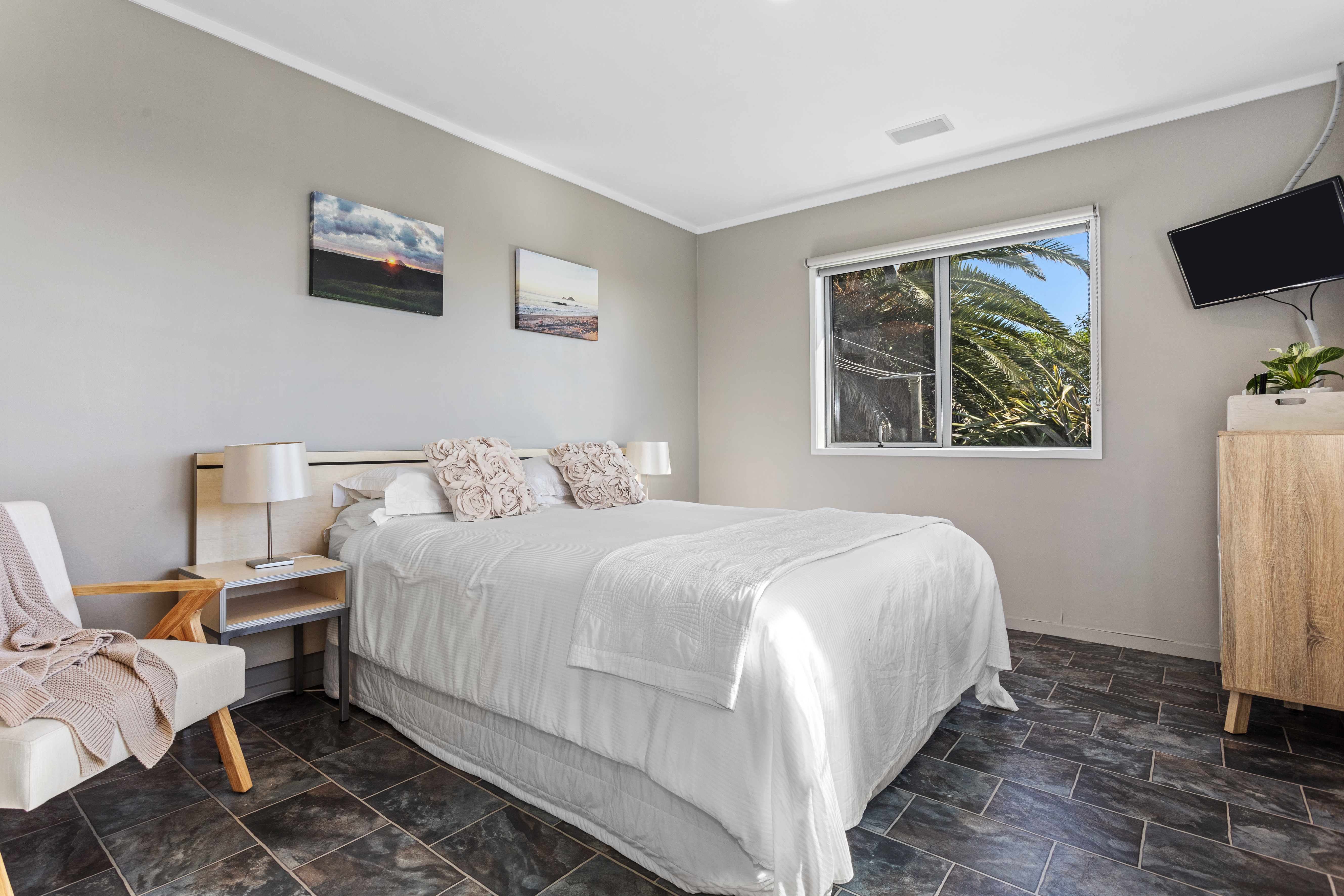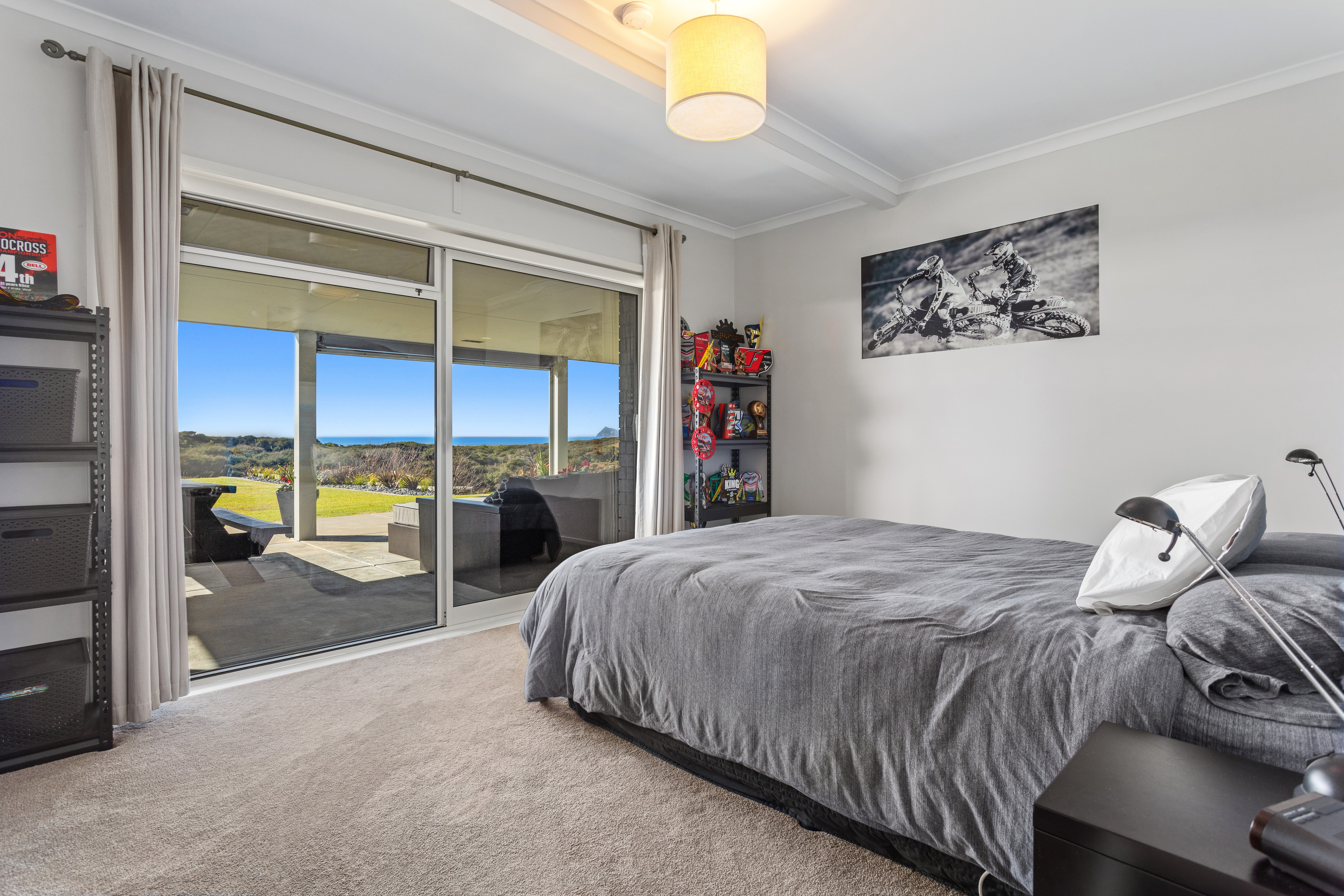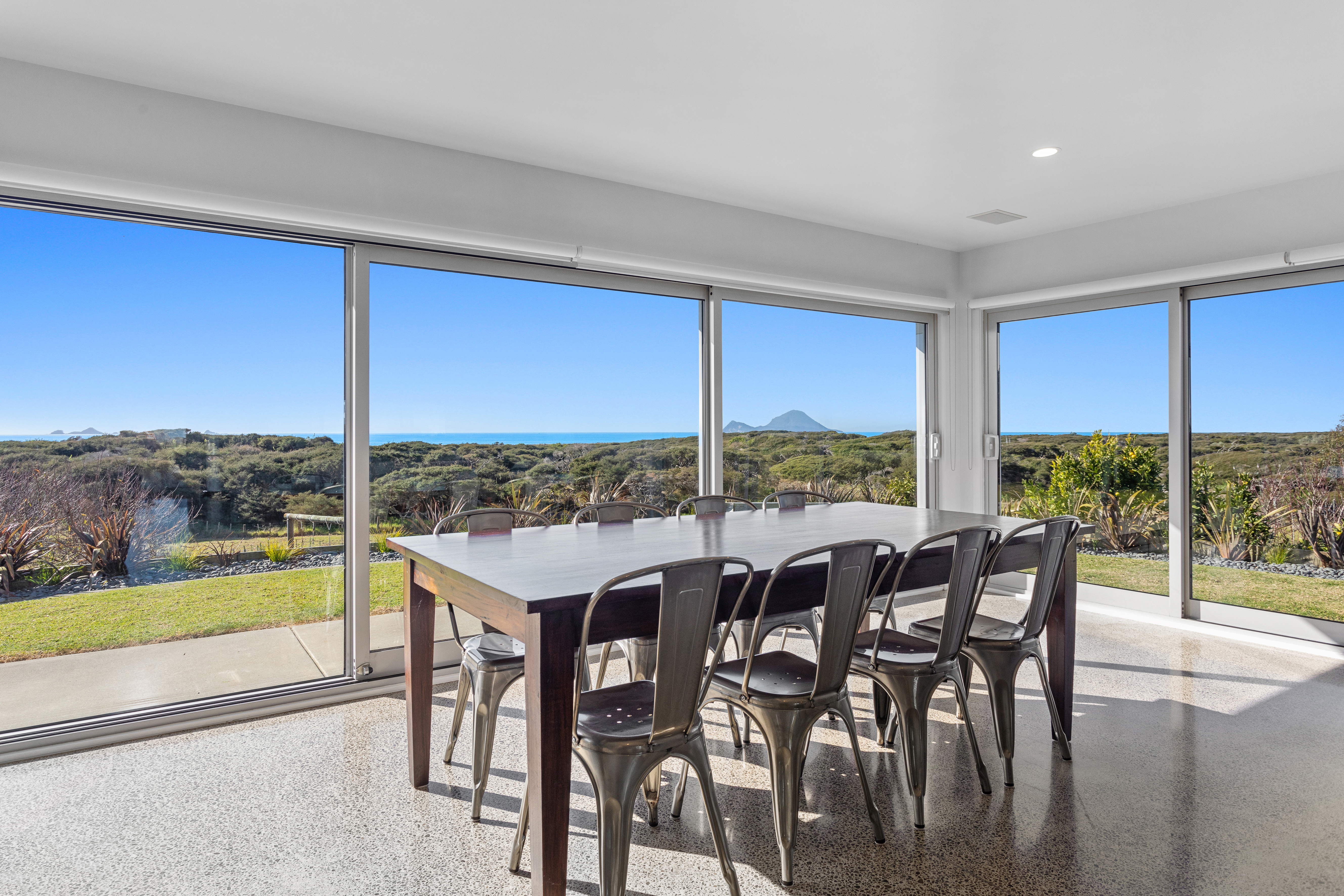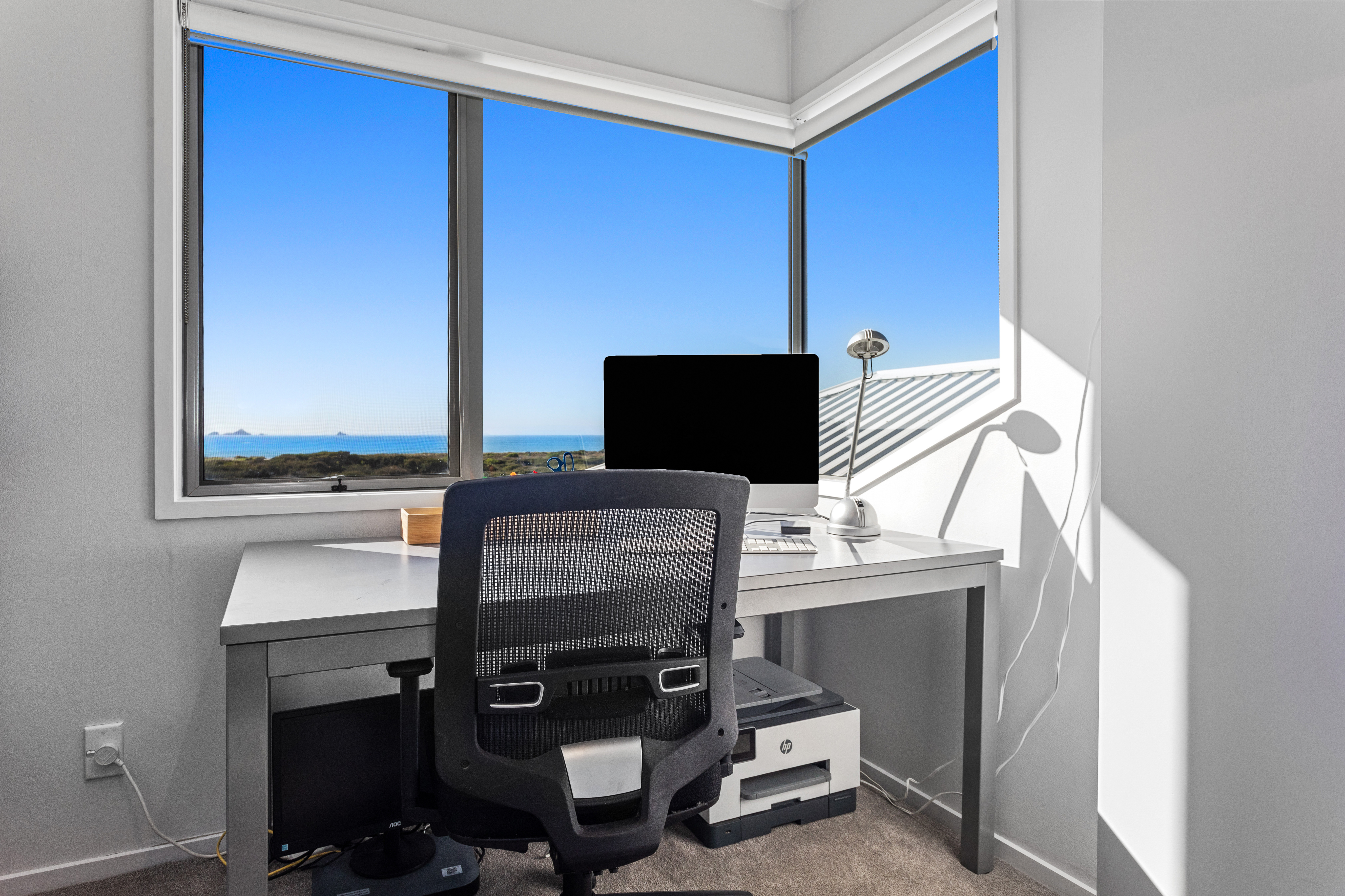 The heart of the home is the expansive open-plan kitchen, dining, and formal lounge area, bathed in natural light from floor-to-ceiling windows that frame the panoramic vistas. The interiors are beautifully appointed with a vaulted ceiling, new neutral-toned carpets, fresh paint, and polished concrete floors. An expansive covered north-facing patio connects effortlessly to both indoor lounges, perfect for year-round entertaining. A second patio on the south side of the kitchen provides additional options for dining and relaxation, regardless of the weather. Upstairs, the bright and airy master suite offers a luxurious retreat, complete with a walk-in wardrobe, a private balcony with views of Whakaari/White Island, a modern ensuite, and an adjacent home office.