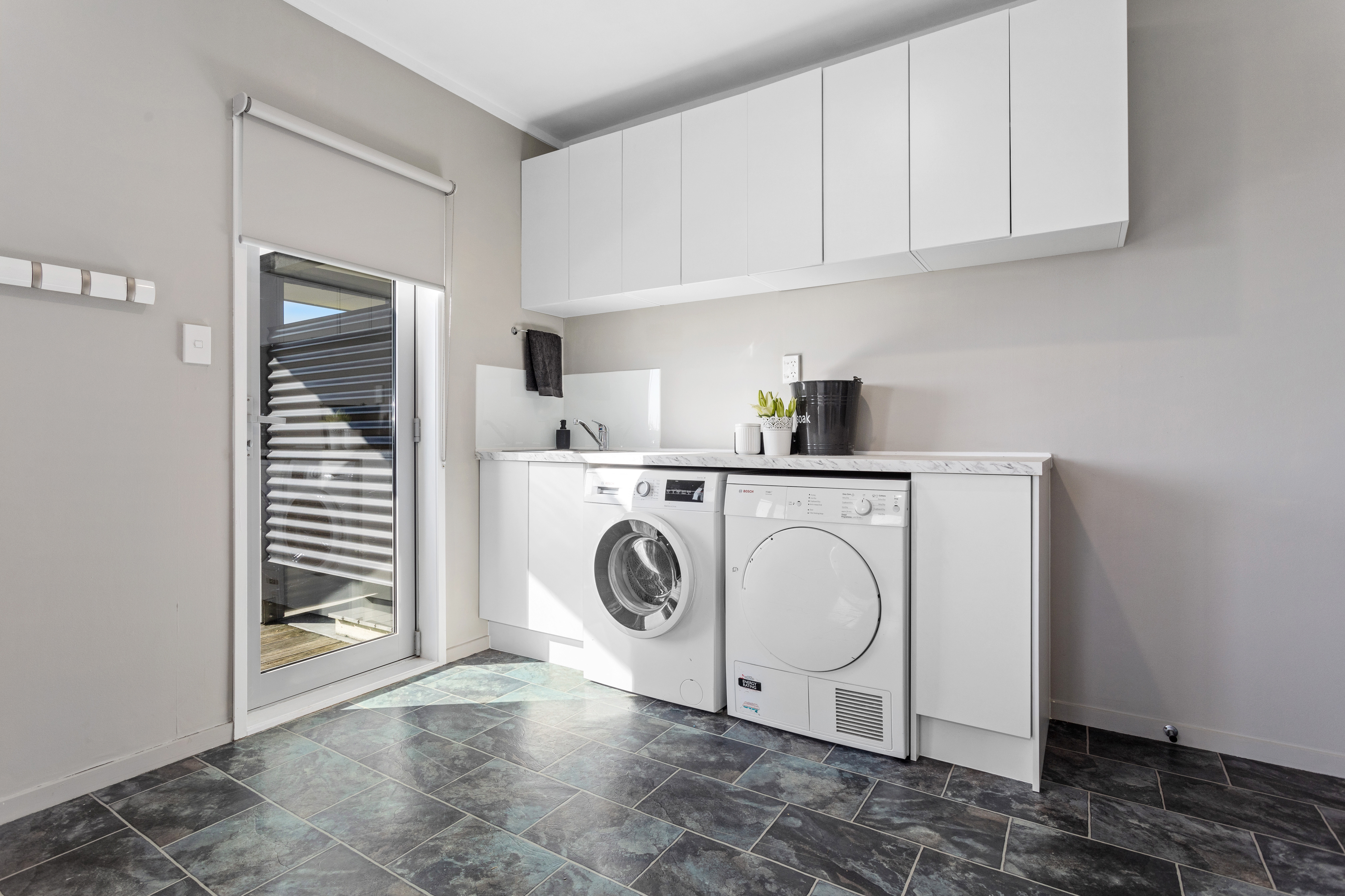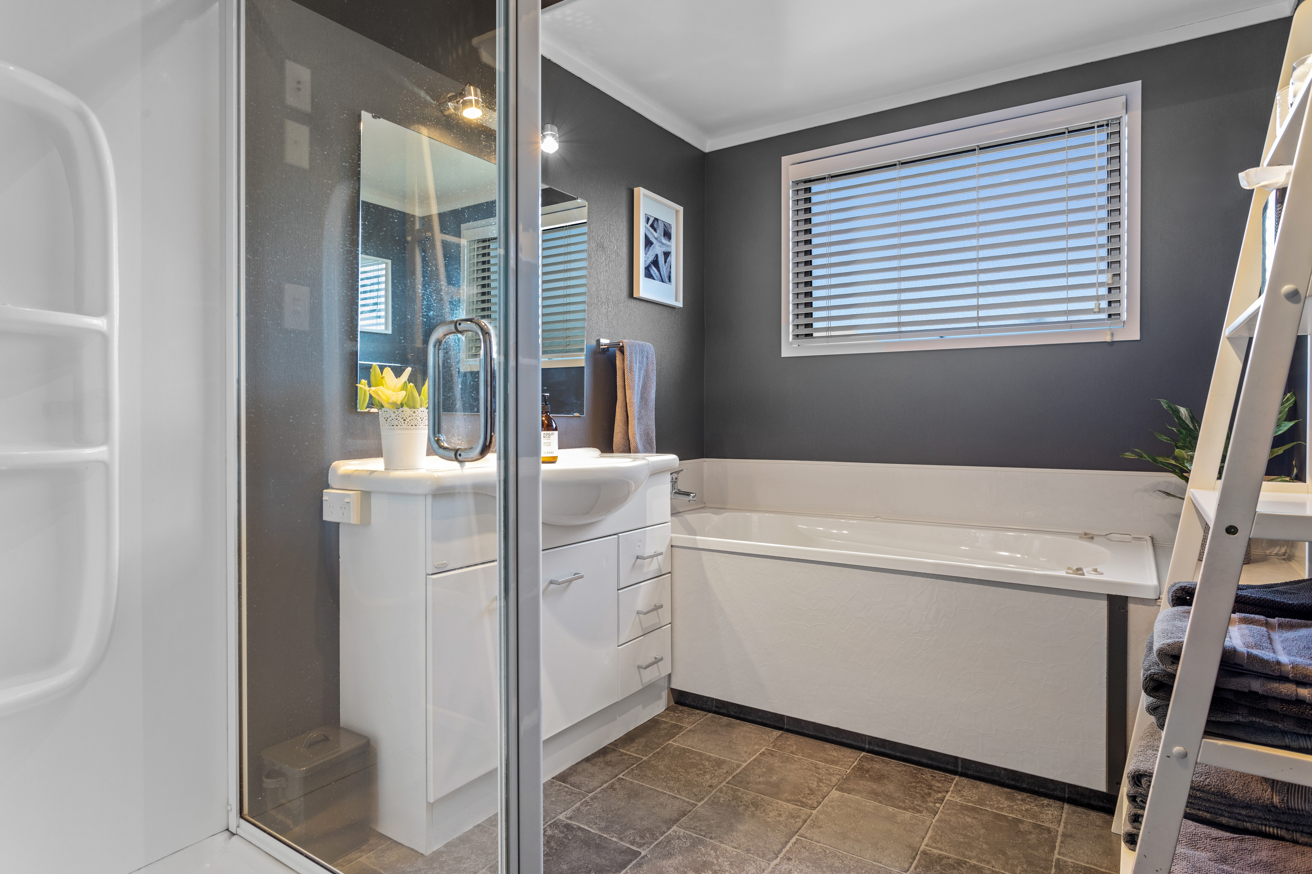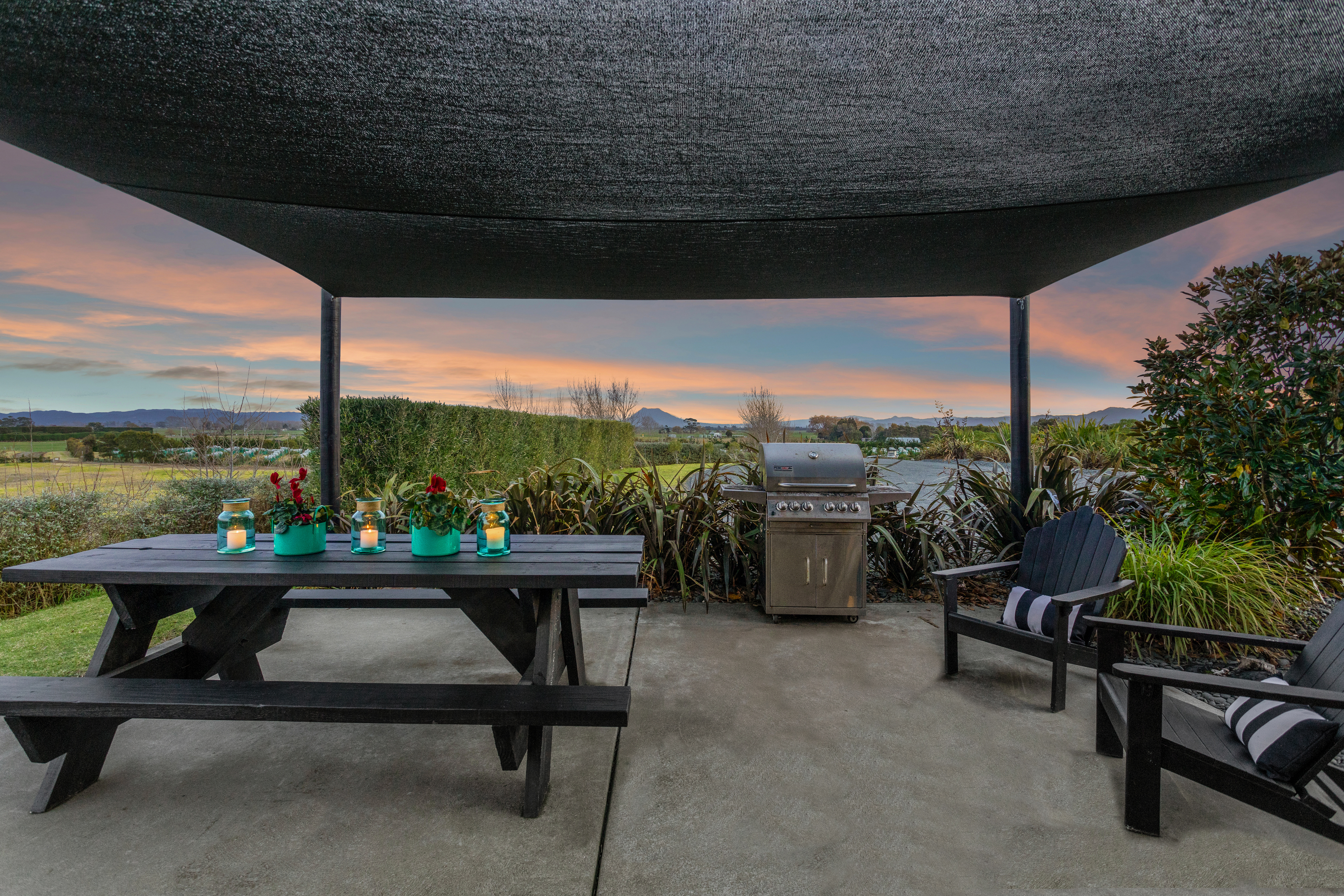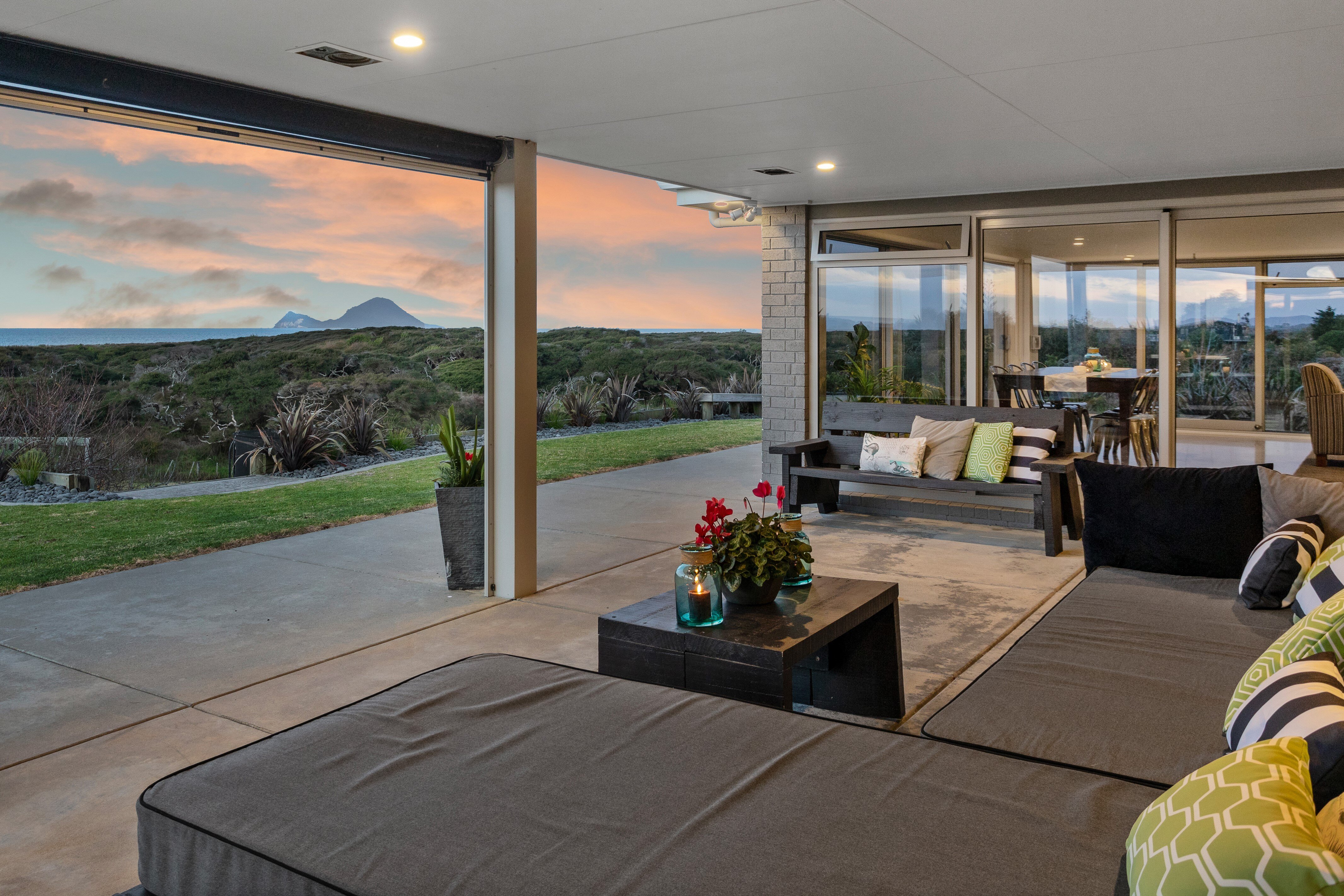 The heart of the home is the expansive open-plan kitchen, dining, and formal lounge area, bathed in natural light from floor-to-ceiling windows that frame the panoramic vistas. The interiors are beautifully appointed with a vaulted ceiling, new neutral-toned carpets, fresh paint, and polished concrete floors. An expansive covered north-facing patio connects effortlessly to both indoor lounges, perfect for year-round entertaining. A second patio on the south side of the kitchen provides additional options for dining and relaxation, regardless of the weather. Upstairs, the bright and airy master suite offers a luxurious retreat, complete with a walk-in wardrobe, a private balcony with views of Whakaari/White Island, a modern ensuite, and an adjacent home office.