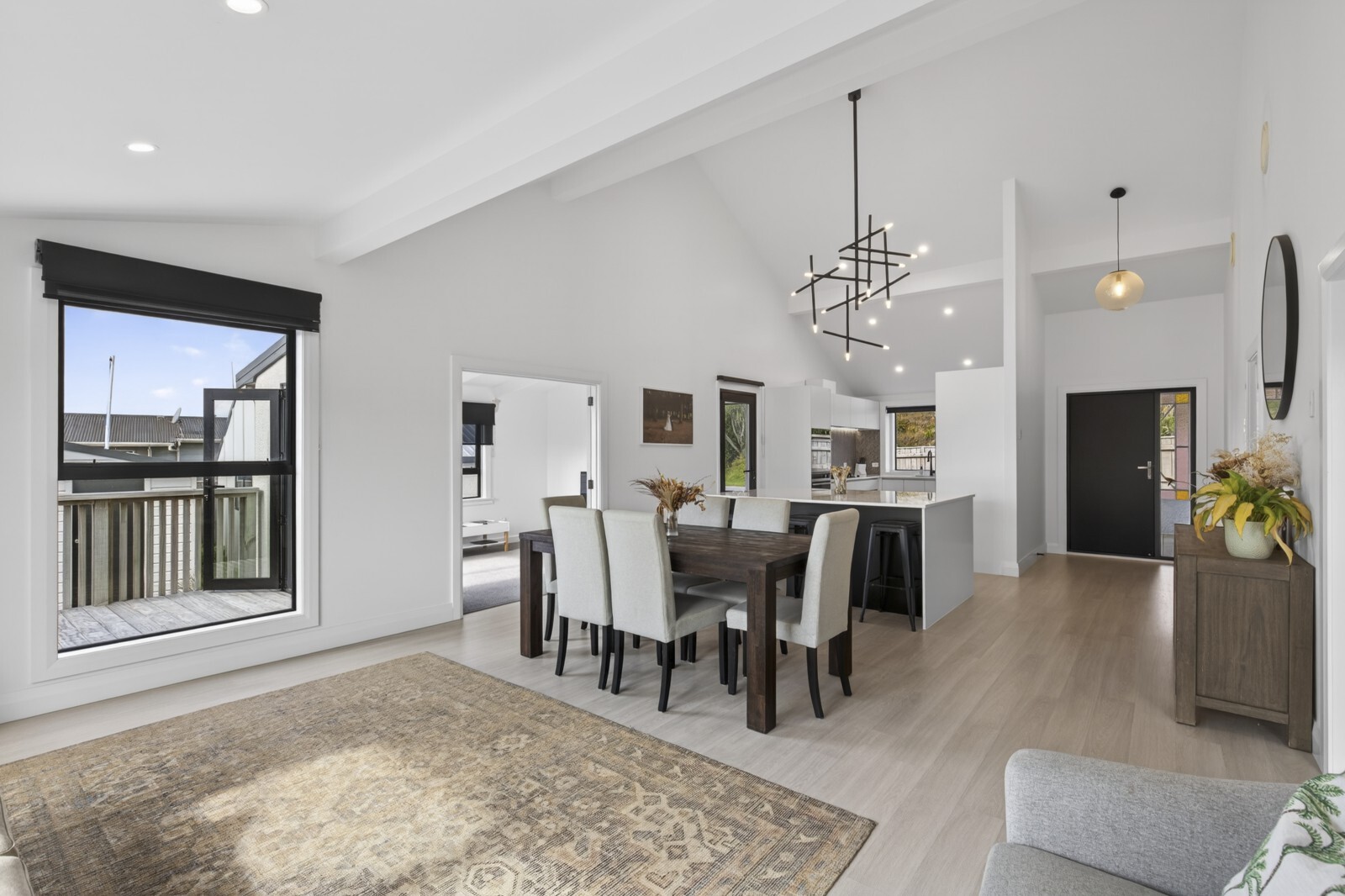 At the heart of the home lies a stunning open-plan kitchen, dining, and living zone - perfectly curated for entertaining. The kitchen is both elegant and highly functional, featuring double wall ovens, infinity gas hot water, and a substantial island bench that naturally becomes the centrepiece for gatherings, whether it’s casual family moments or hosting guests.
