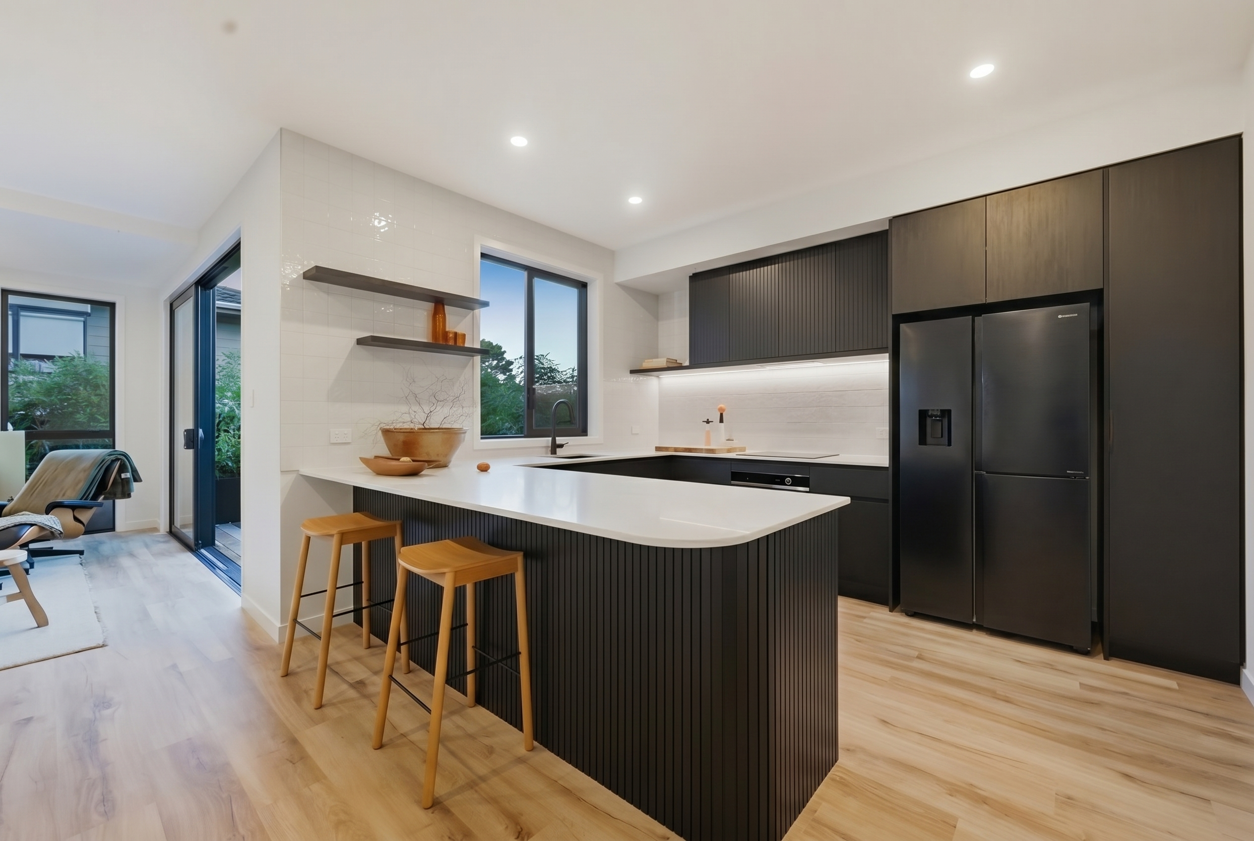 * Designer kitchen with stone benchtops, sleek cabinetry, premium finishes and Sky Tower views