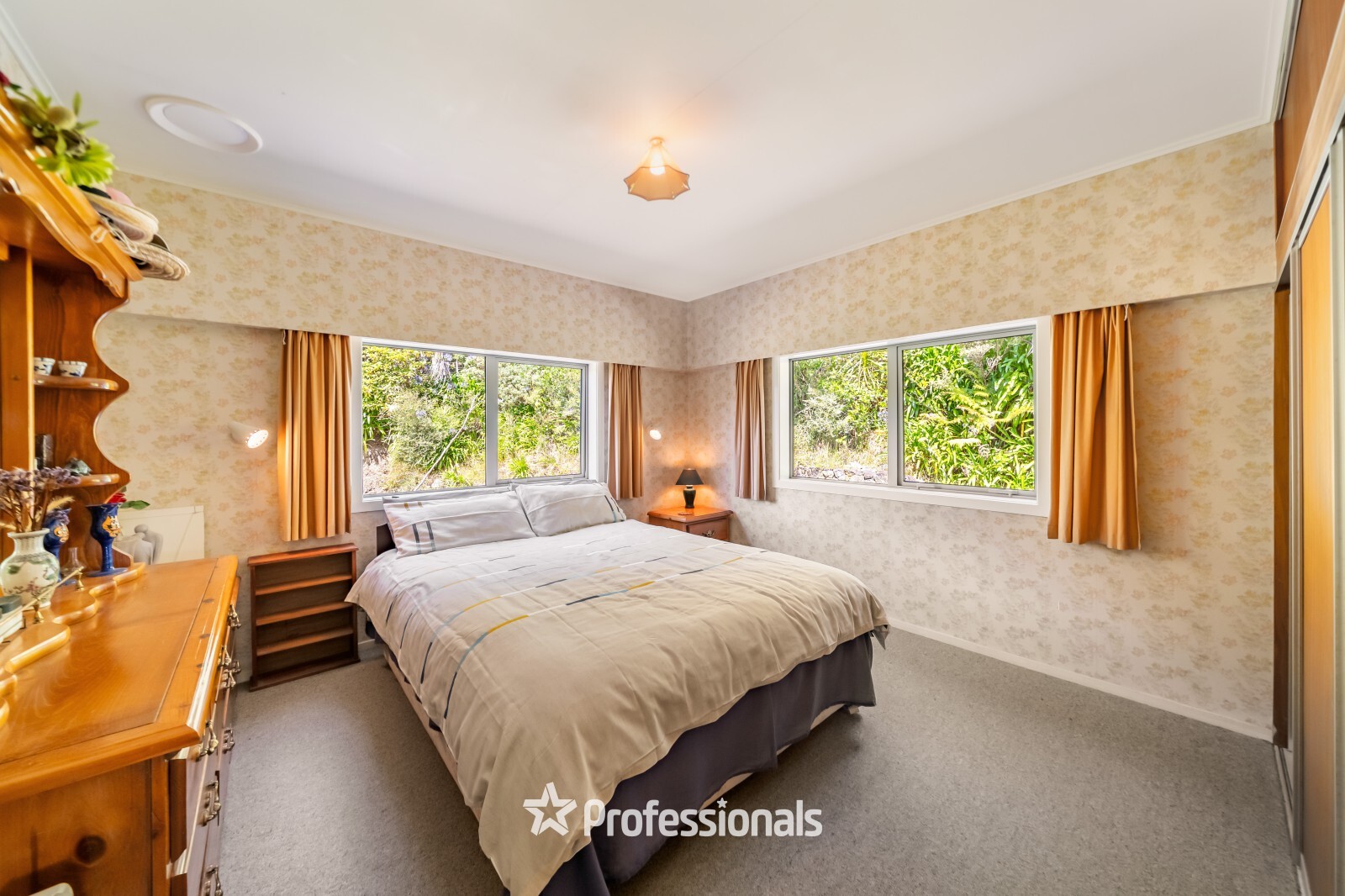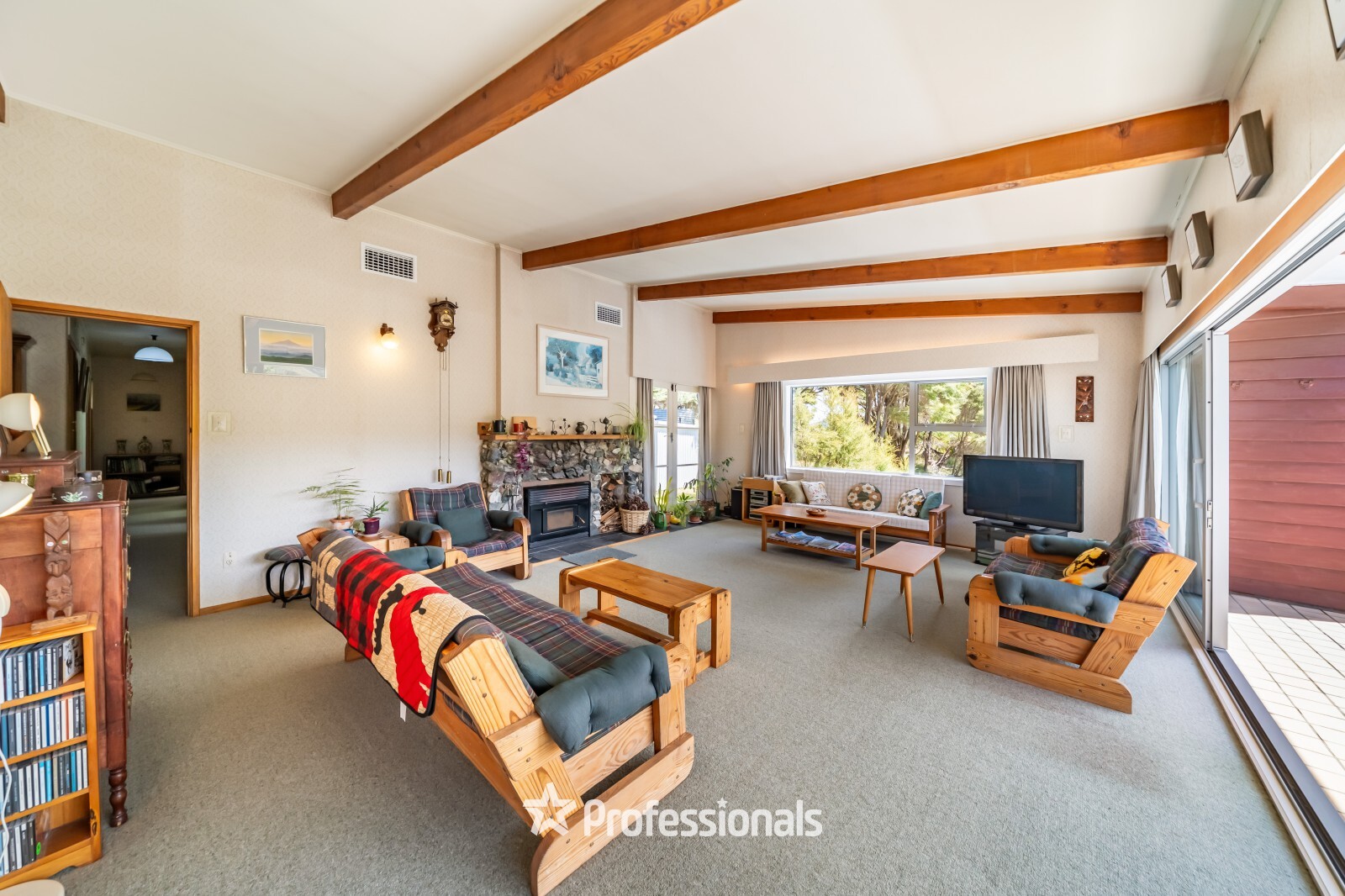 Originally built in the 1960s, this well-maintained homestead is double-glazed throughout and immediately feels warm and welcoming. The expansive living room, with its high rafter ceilings, forms the heart of the home. A wood burner creates a cosy atmosphere, while a ducted heat pump system ensures year-round comfort. Sliding doors open onto a covered deck, ideally positioned to capture the sweeping panoramic views.