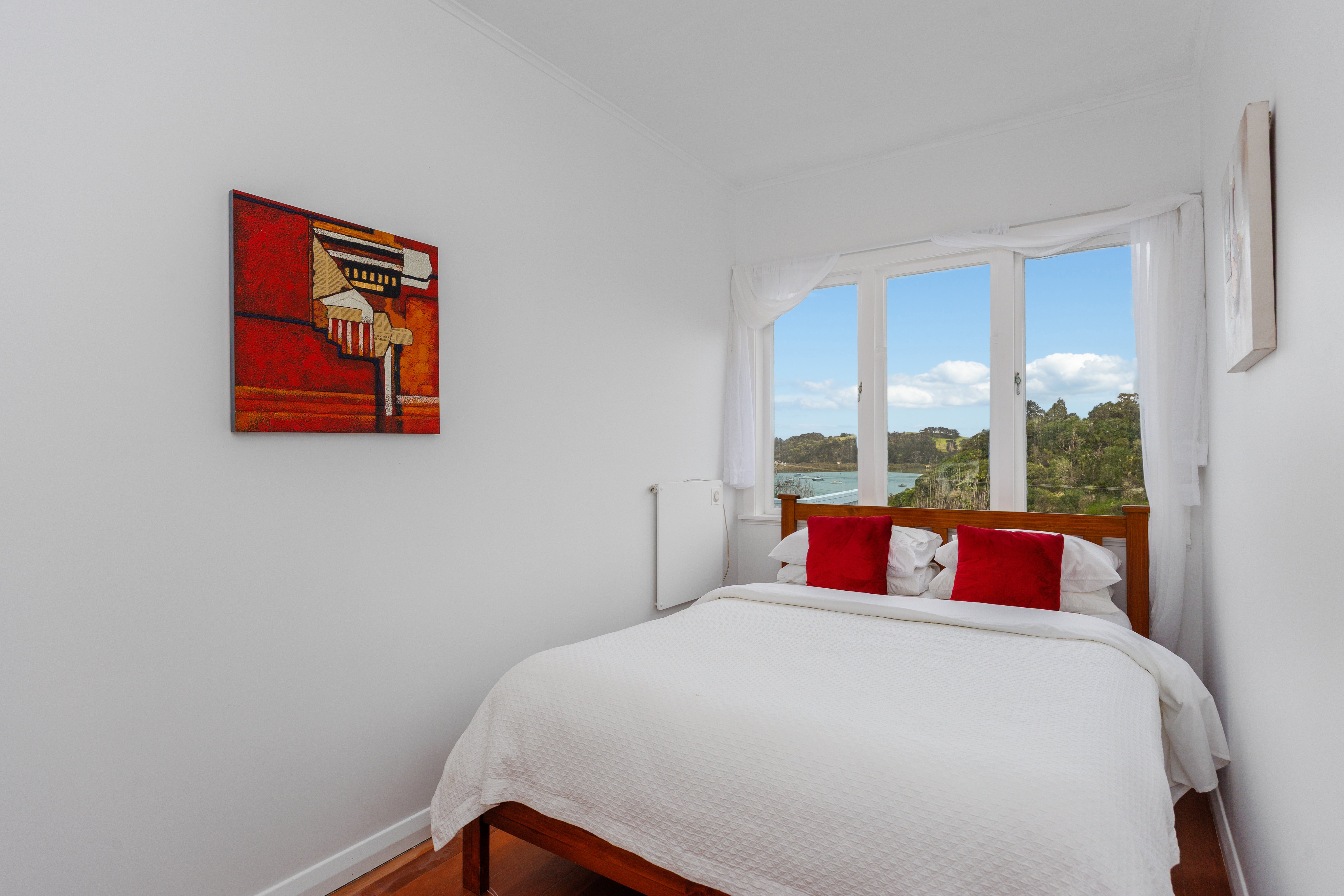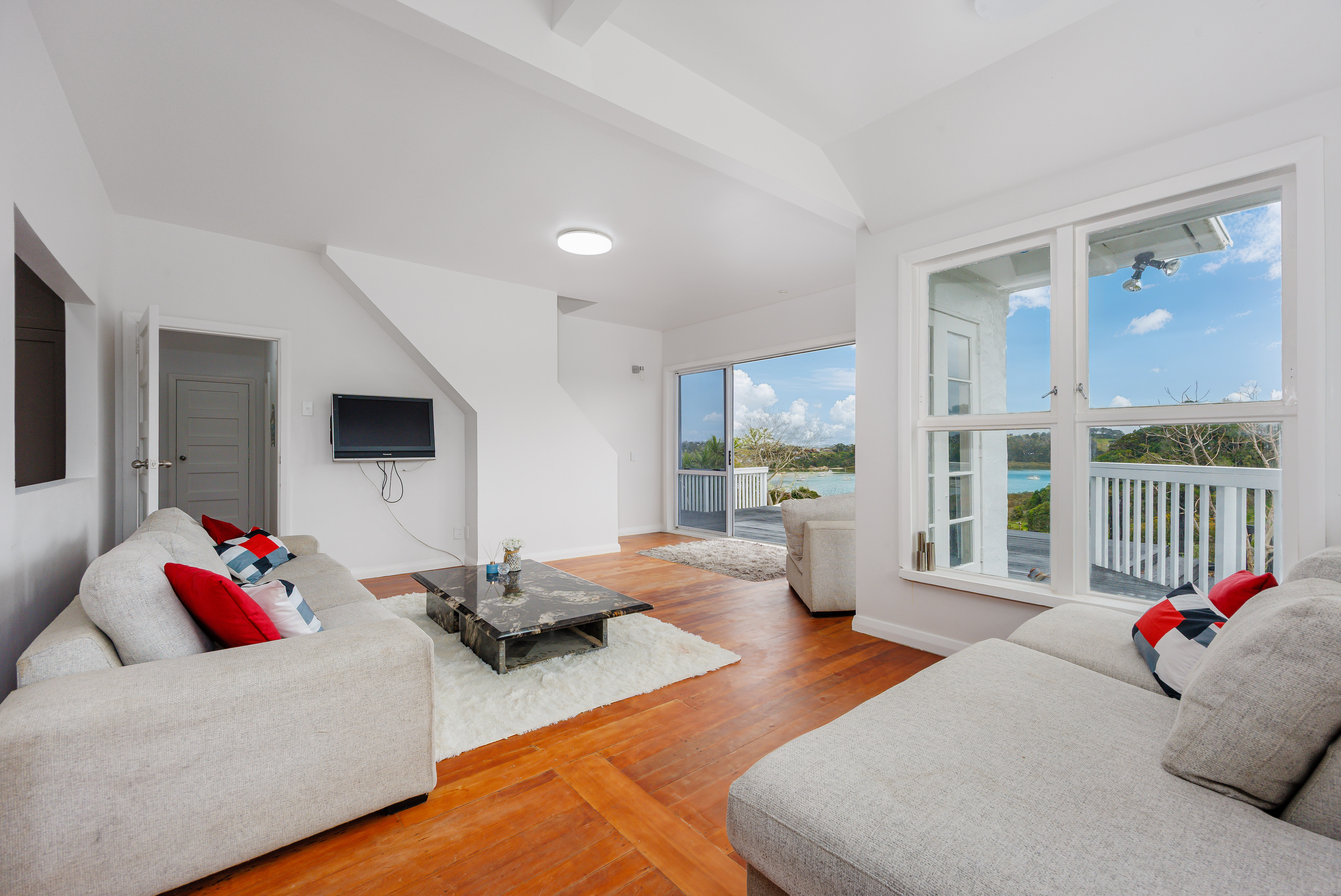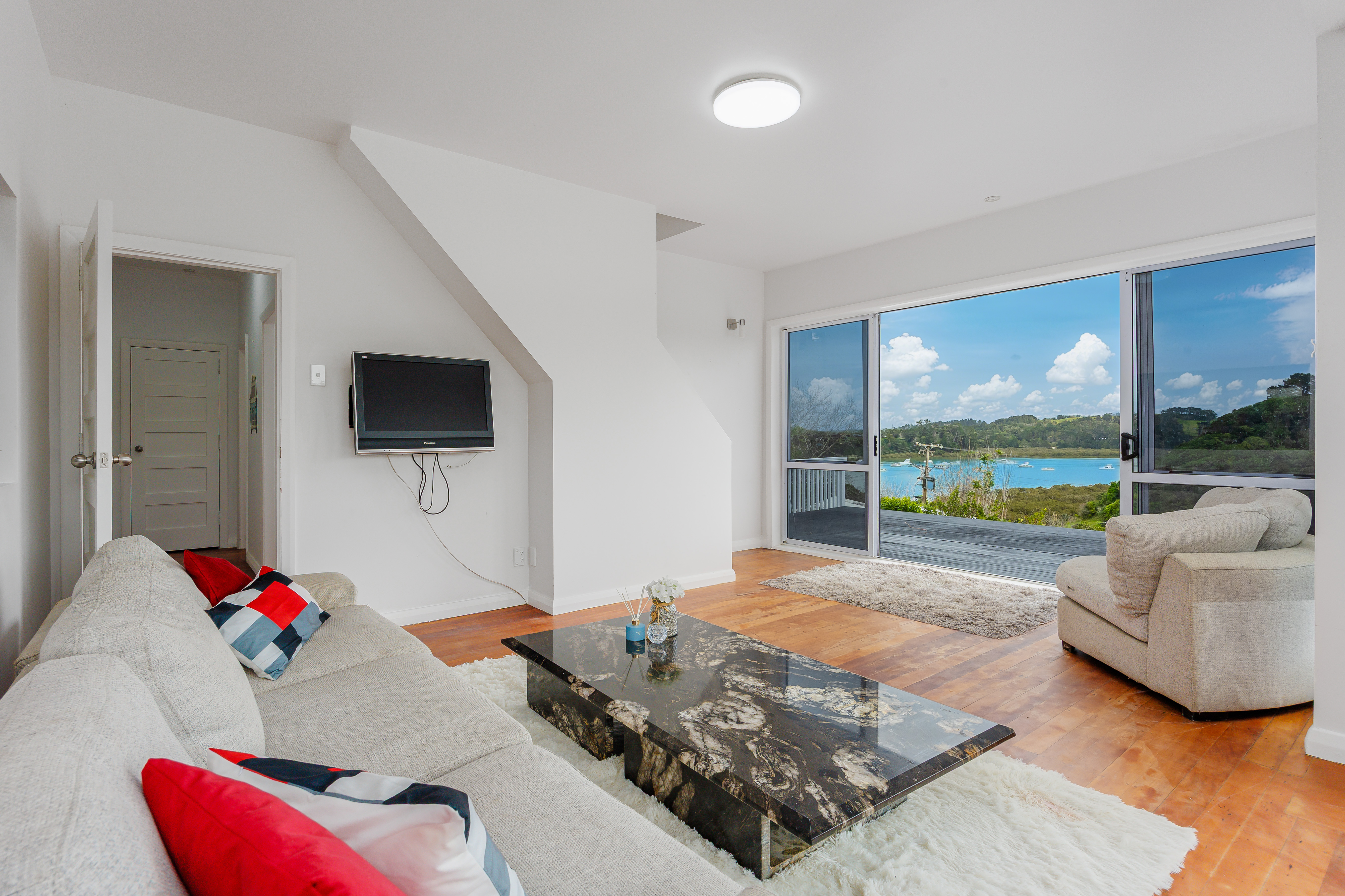 The main residence is bright, welcoming and thoughtfully presented. It offers three bedrooms plus a spacious upstairs mezzanine that could easily serve as a second living area, home office, or potential fourth bedroom. Positioned to capture the sweeping water views, the home provides a light-filled living space that flows effortlessly out to a large, sun-drenched entertaining deck overlooking the harbour. It's an ideal place to unwind with friends and family while enjoying the peaceful surroundings.