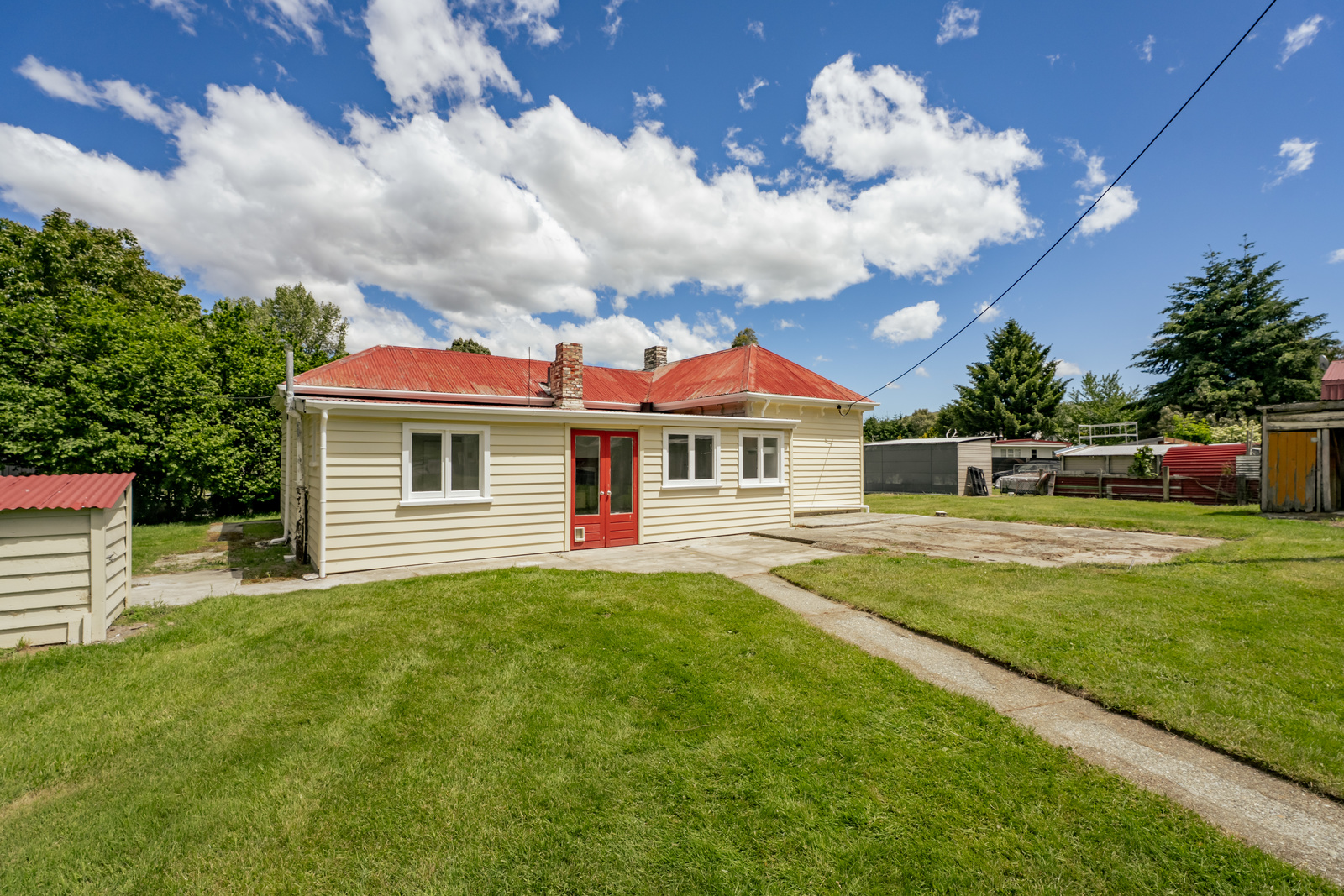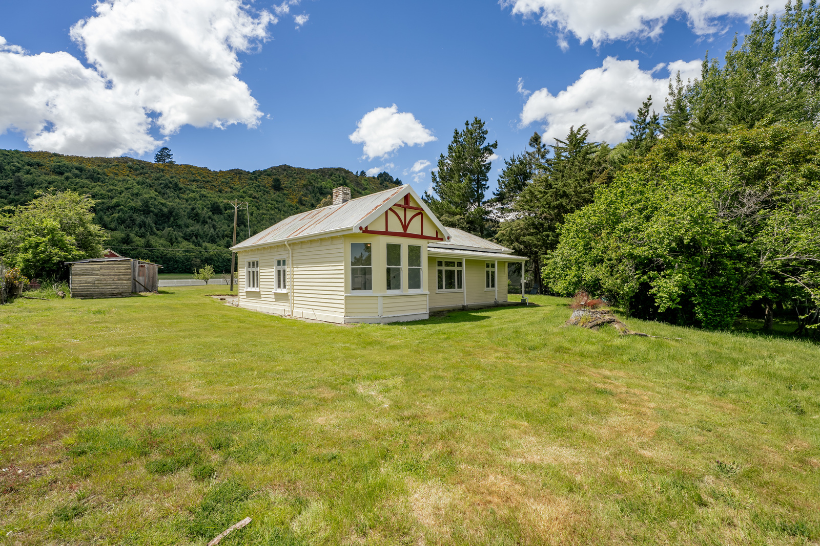 Inside, the home offers five generously sized bedrooms, a separate living area with a woodburner, and a spacious kitchen and dining area complete with an old coal range. Beautiful period features, including pressed metal ceilings, add character throughout while a new owner can add further modernisation on the inside. Recent updates include full internal gib lining and new tiling in the kitchen, laundry, and bathroom, leaving the new owner to choose paint colours and decide whether to add carpet or polish the original wooden floors.