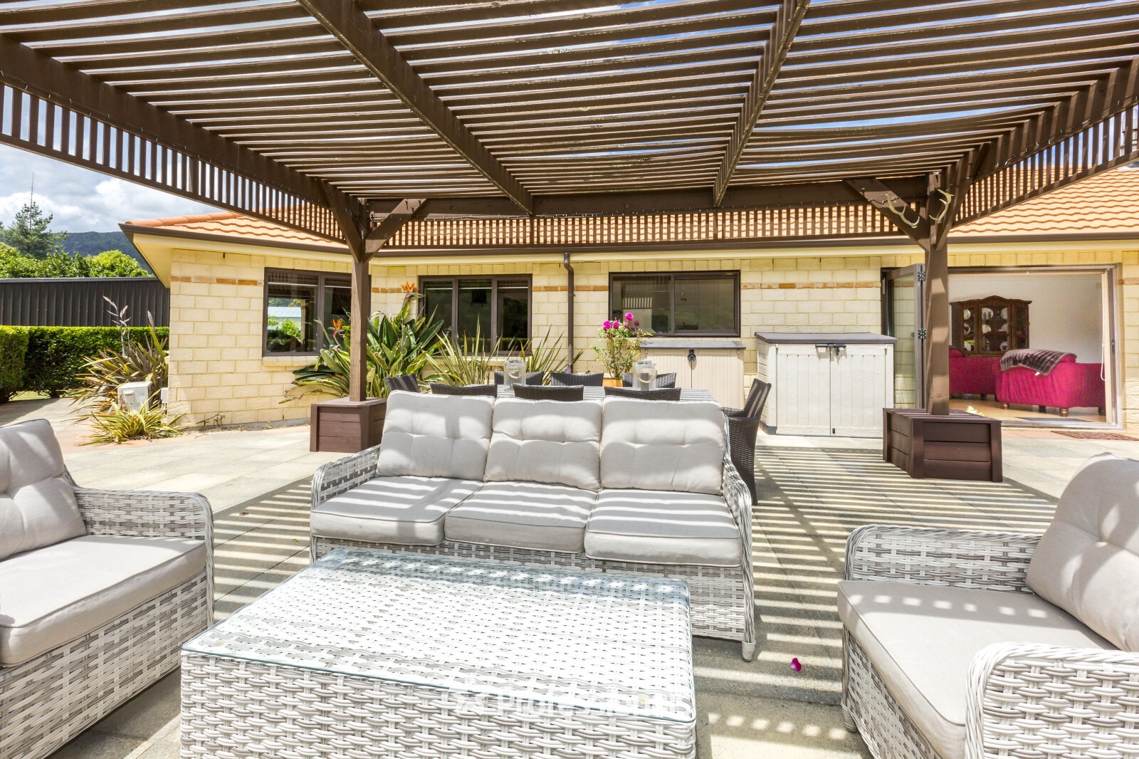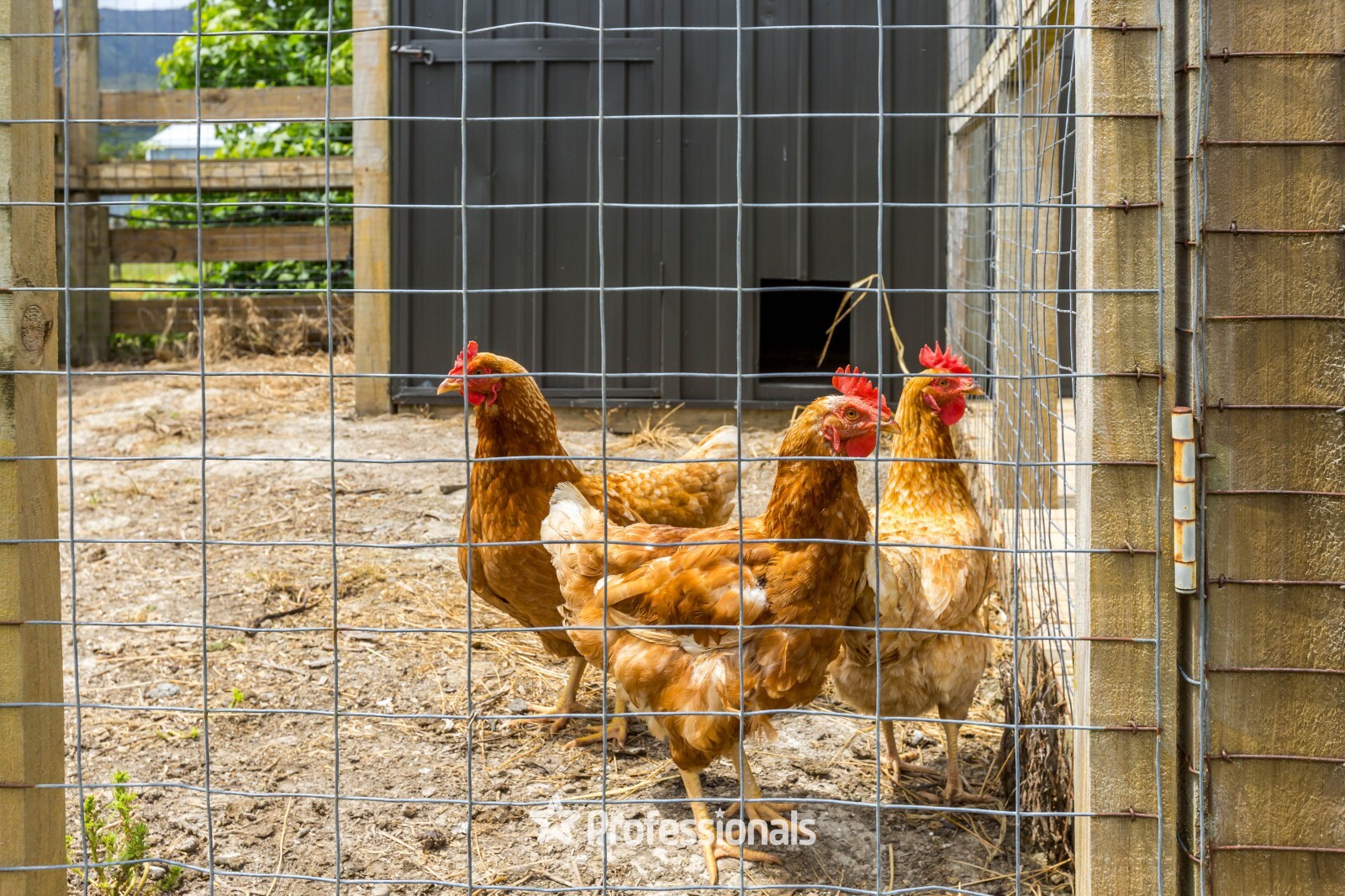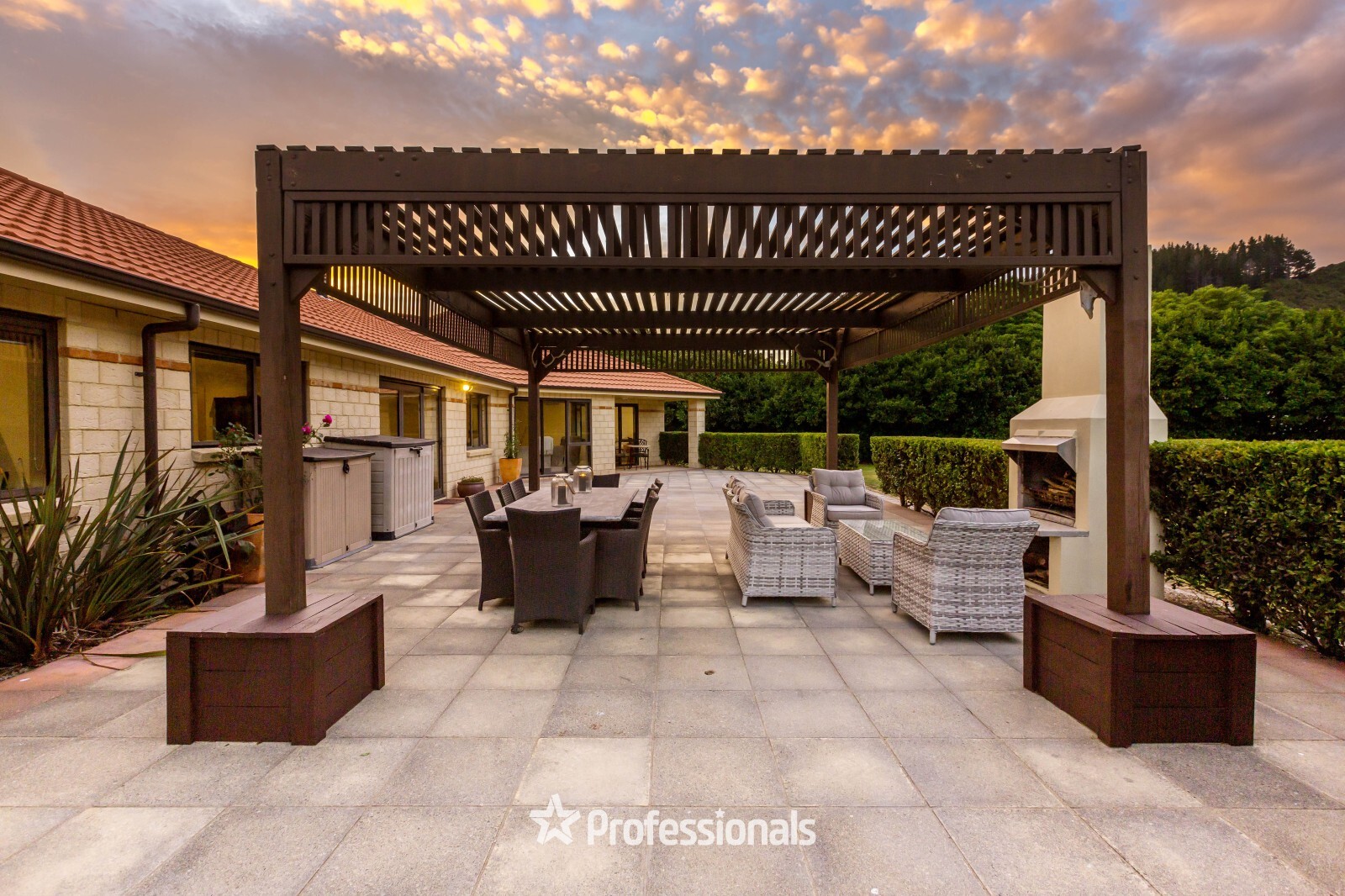The grounds are a standout feature, designed for both enjoyment and practicality. A spacious paved entertaining area with gazebo and outdoor fireplace is framed by camellia hedging and connects seamlessly to the home. Additional features include a separate high-stud three-bay garage and shed, raised vegetable beds, chicken coop, dog run, tree-lined boundaries, and a peaceful creek beyond the rear fence where glowworms can be seen at night.