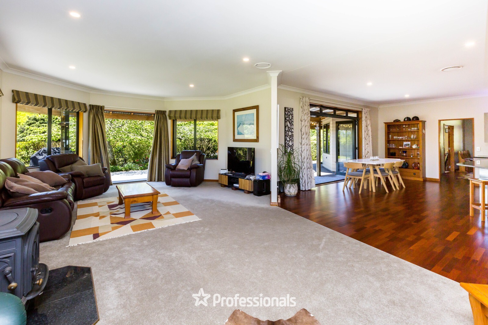 The open-plan kitchen, dining, and living area is the central hub of the home, and designed for seamless indoor-outdoor flow to the large, private and sheltered patio. Two wood burners, complemented by a ducted heat pump system, ensure warmth throughout the seasons. For quieter moments or more formal occasions, a separate living area offers a retreat away. The triple car garaging with internal access and further storage provides the ideal space for the toys.