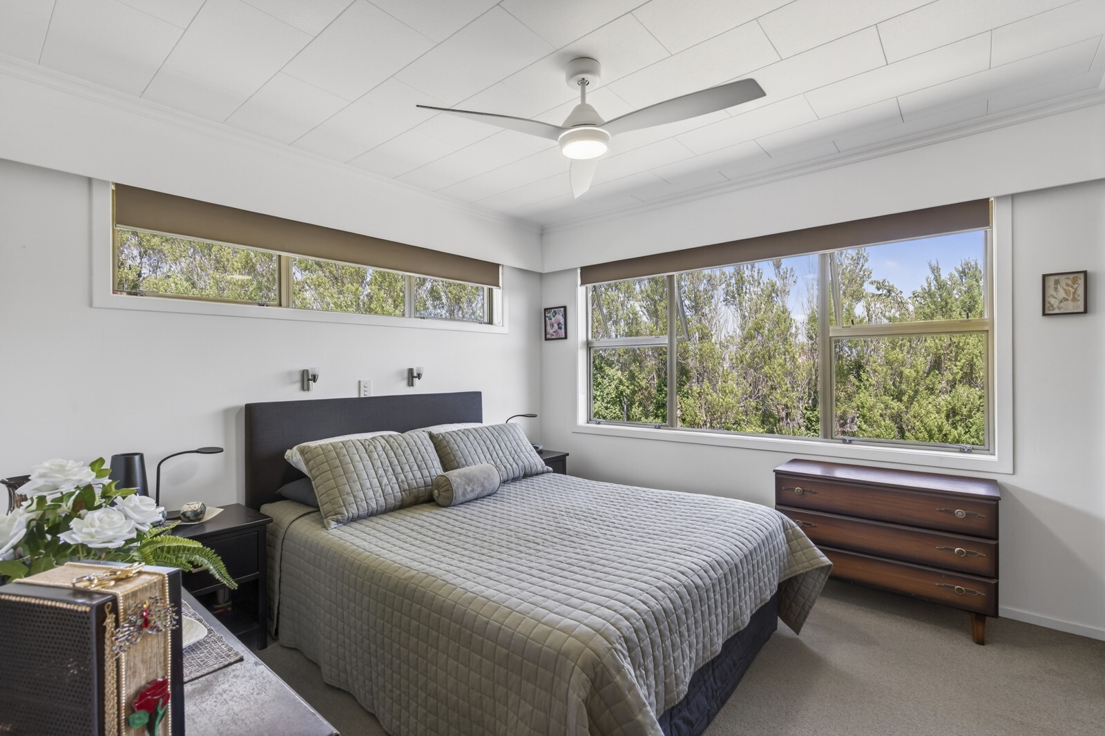 The upper level is the hub of the home, offering open plan kitchen and dining with upgraded appliances, including an induction cooktop and new wall oven, plus a practical breakfast bar for busy mornings or relaxed entertaining. The expansive living area is a great place for relaxing and taking in the views. This level includes the laundry and excellent storage space and has recently been refreshed with new internal paint throughout.