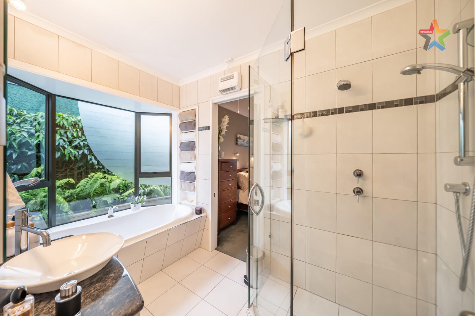 The tiled bathroom stands out with a sense of timeless quality, featuring a large dual head glass shower and underfloor heating. The strategically placed bath allows for a soothing soak while enjoying illuminated views of the garden ferns without compromising privacy. The open-plan living area is spacious and includes a heat pump, leading to an attractive and functional fully equipped kitchen. A ranch slider opens up to the stunning courtyard.