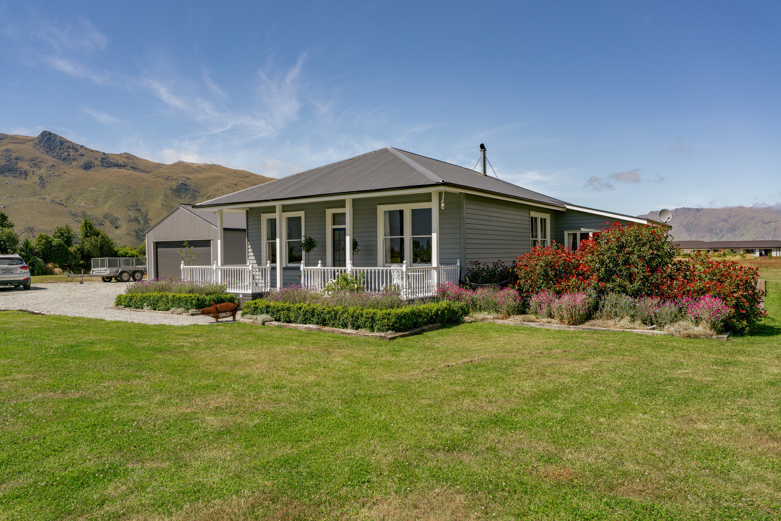 Step inside to find a welcoming hallway leading to an open-plan kitchen and living area, where every window frames beautiful scenery. This character home boasts high ceilings, hardwood floors, and a charming fireplace, preserving the appeal of its renovated features. The master wing includes a spacious bedroom with an ensuite and walk-in wardrobe, complemented by three additional bedrooms, a family bathroom, a storeroom, and a separate laundry plus the benefit of a large double garage. The living area flows seamlessly onto a wrap-around deck, perfect for enjoying a peaceful morning coffee or an evening BBQ while soaking in the majestic mountain and expansive rural views.