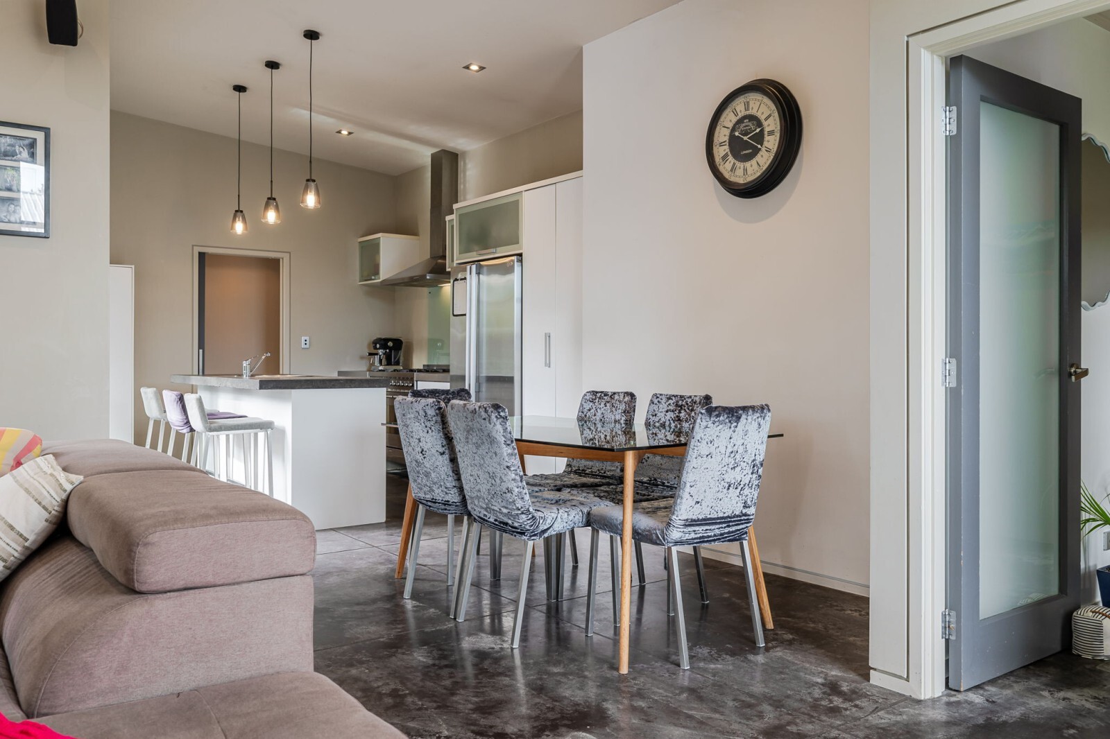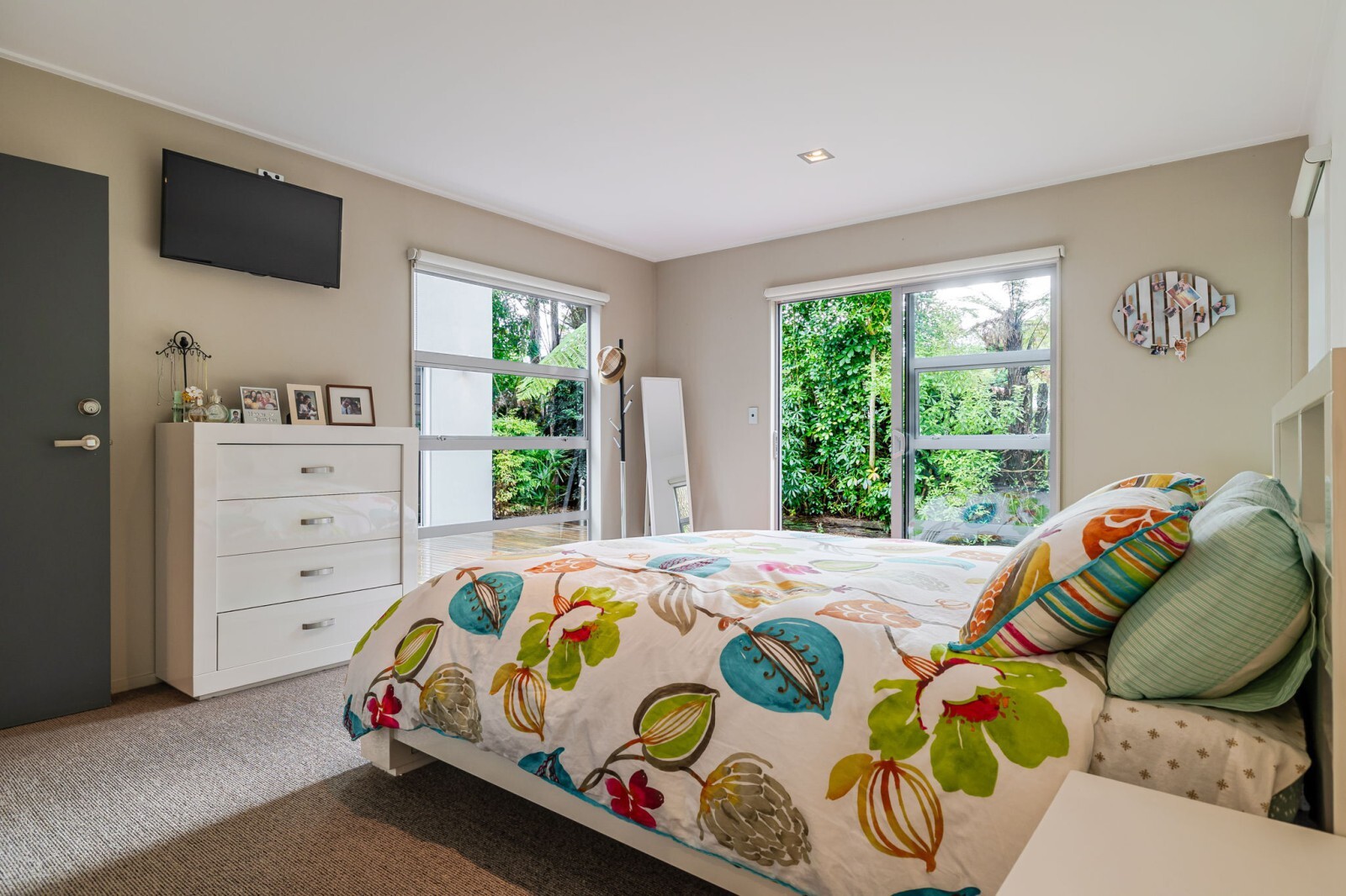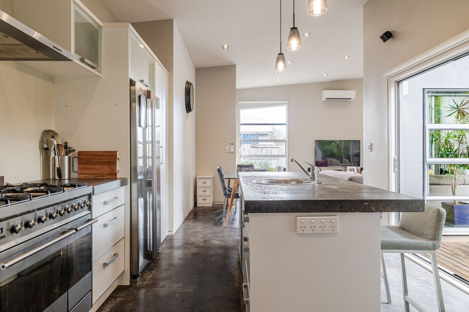 The high ceilings, extra-wide and long windows, plus multiple sliders from the living, kitchen and master bedroom to a very private deck, give this home an impressive “wow” factor. Most of the exterior has just been freshly painted, and the concrete floors through the kitchen/living/dining offer a modern vibe and pair perfectly with the gas fire and heat pump for year-round comfort.