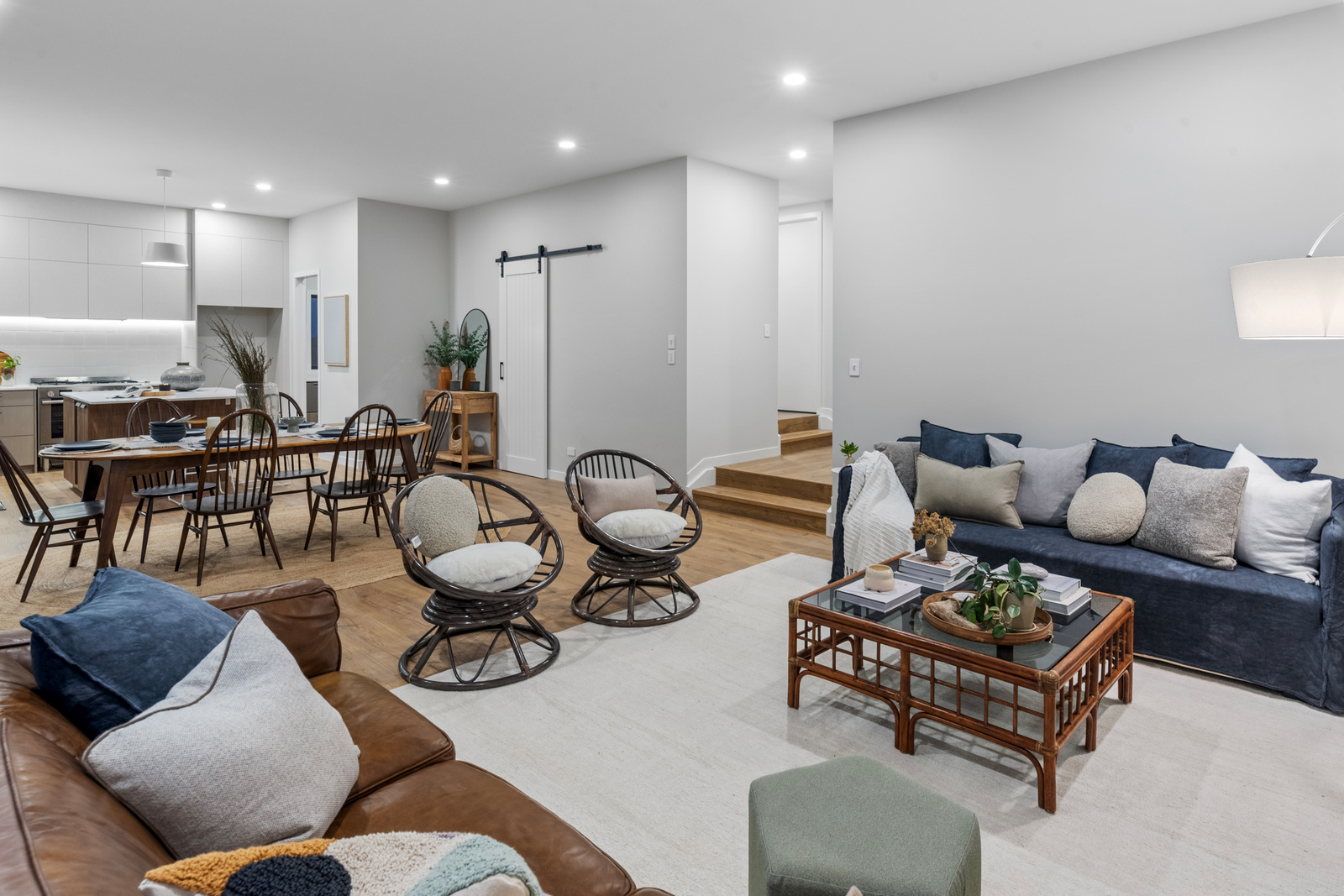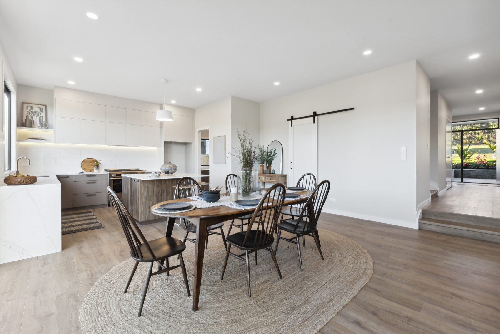 The heart of the home is the modern kitchen, which is equipped with top-of-the-line appliances and sleek finishes, making it a chef's dream. Situated off the kitchen is a scullery and laundry which can be closed off when entertaining. The kitchen seamlessly flows into an expansive open-plan living and dining area, creating an inviting space that is perfect for both everyday family life and entertaining guests. Large windows and sliding glass doors bathe the space in natural light, enhancing the sense of openness and connectivity to the outdoors.