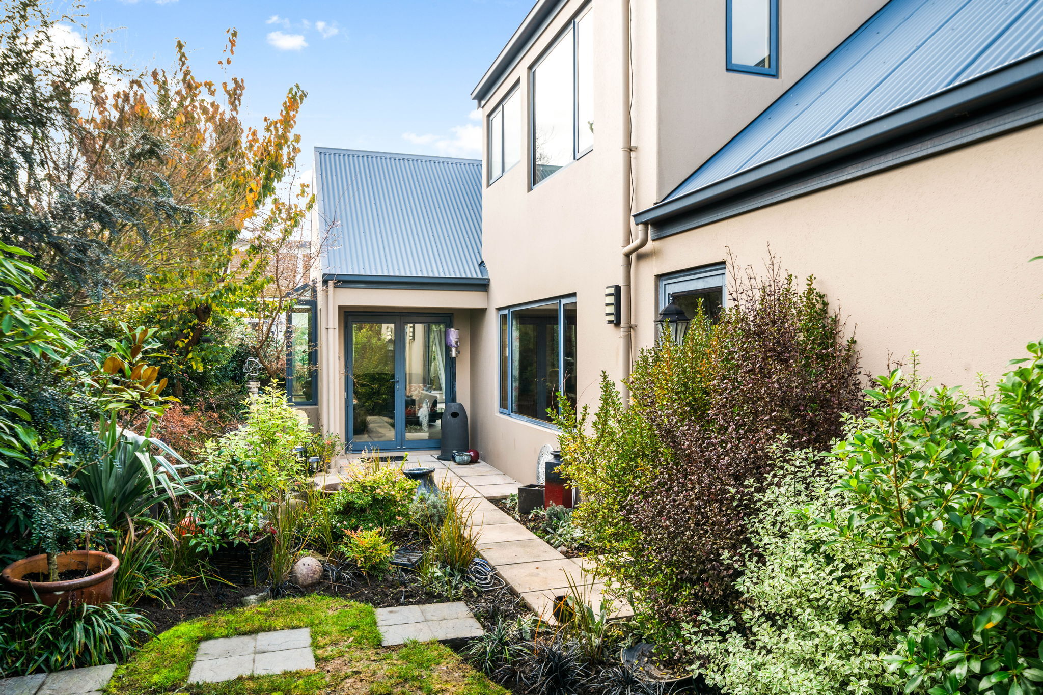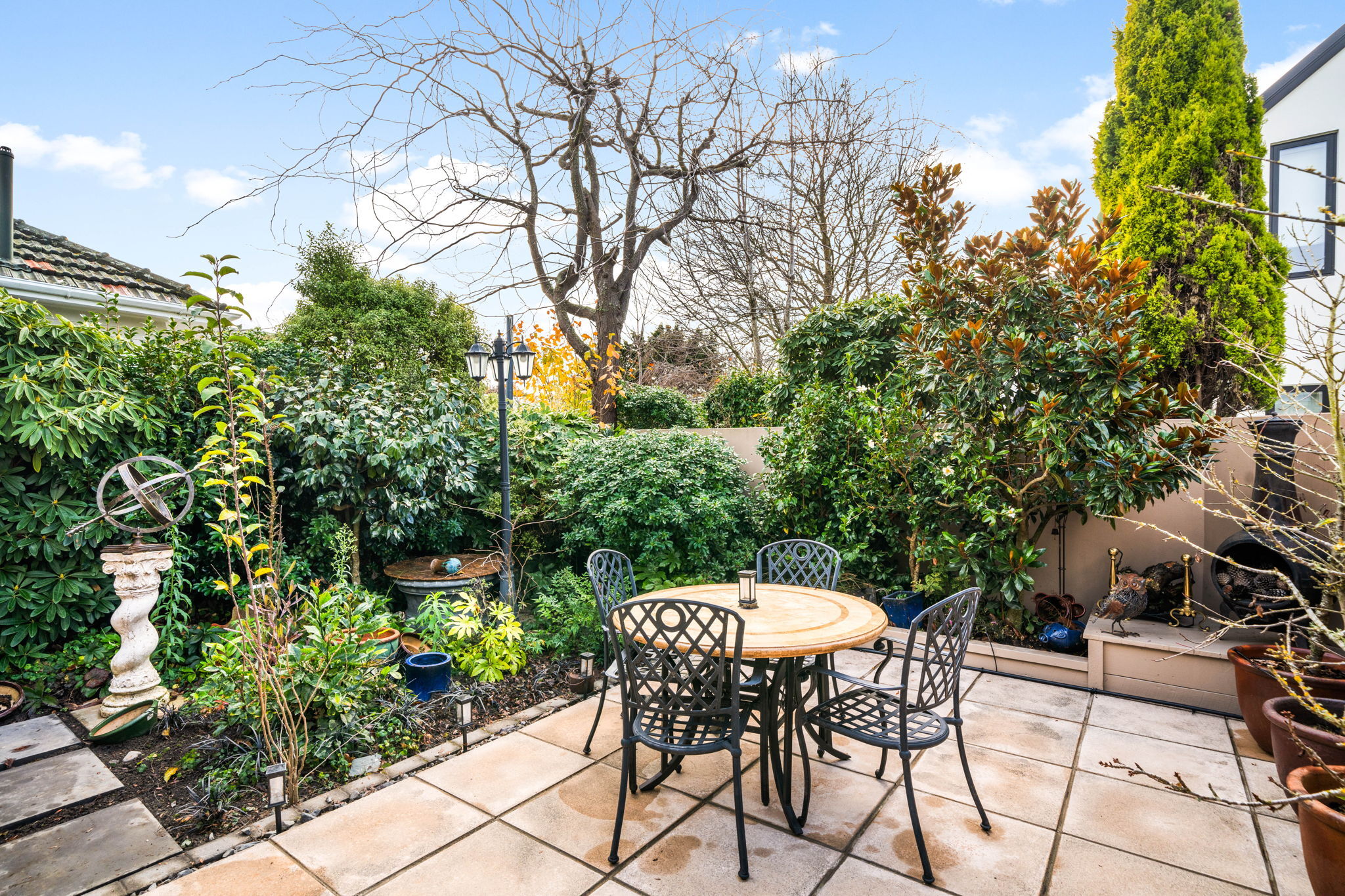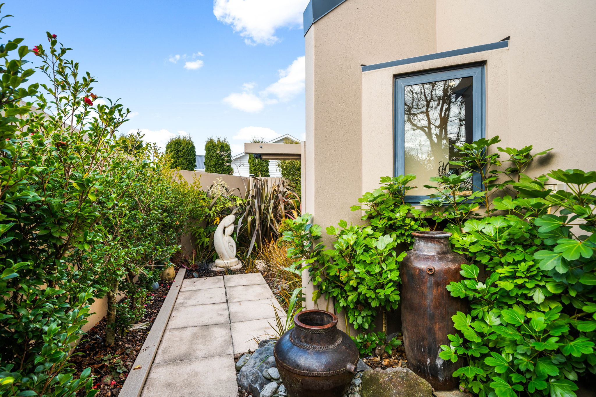 The tranquil, easy care garden features a shade sail for summer comfort, offering a lovely setting to unwind or entertain.
