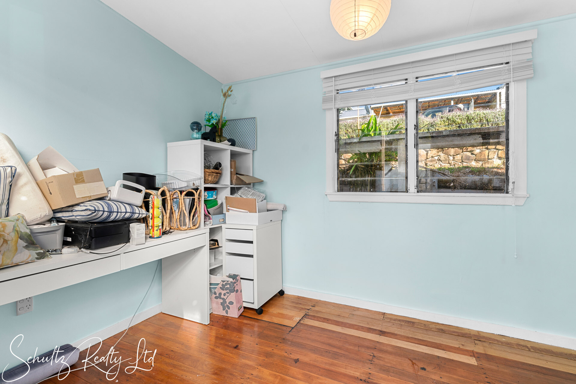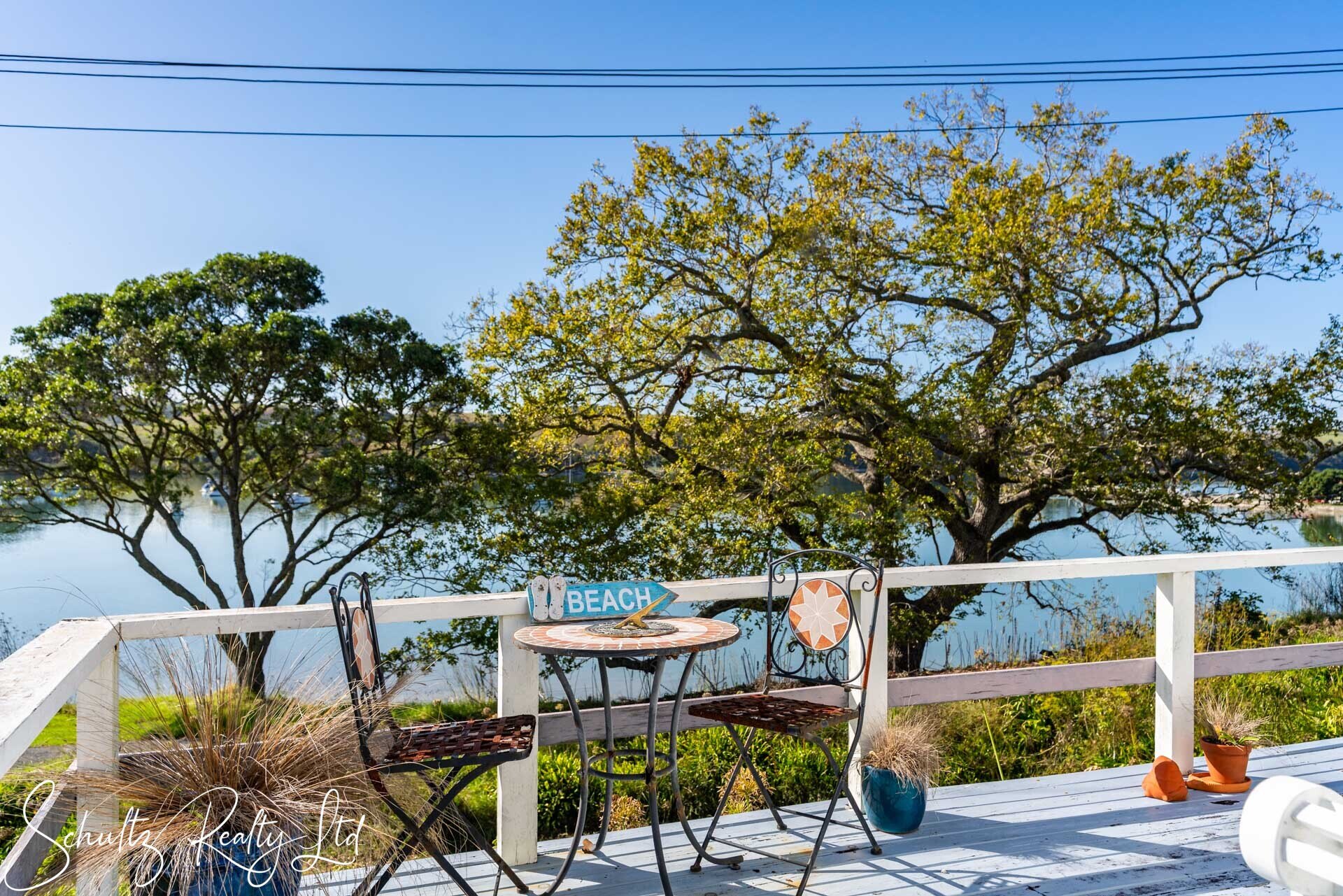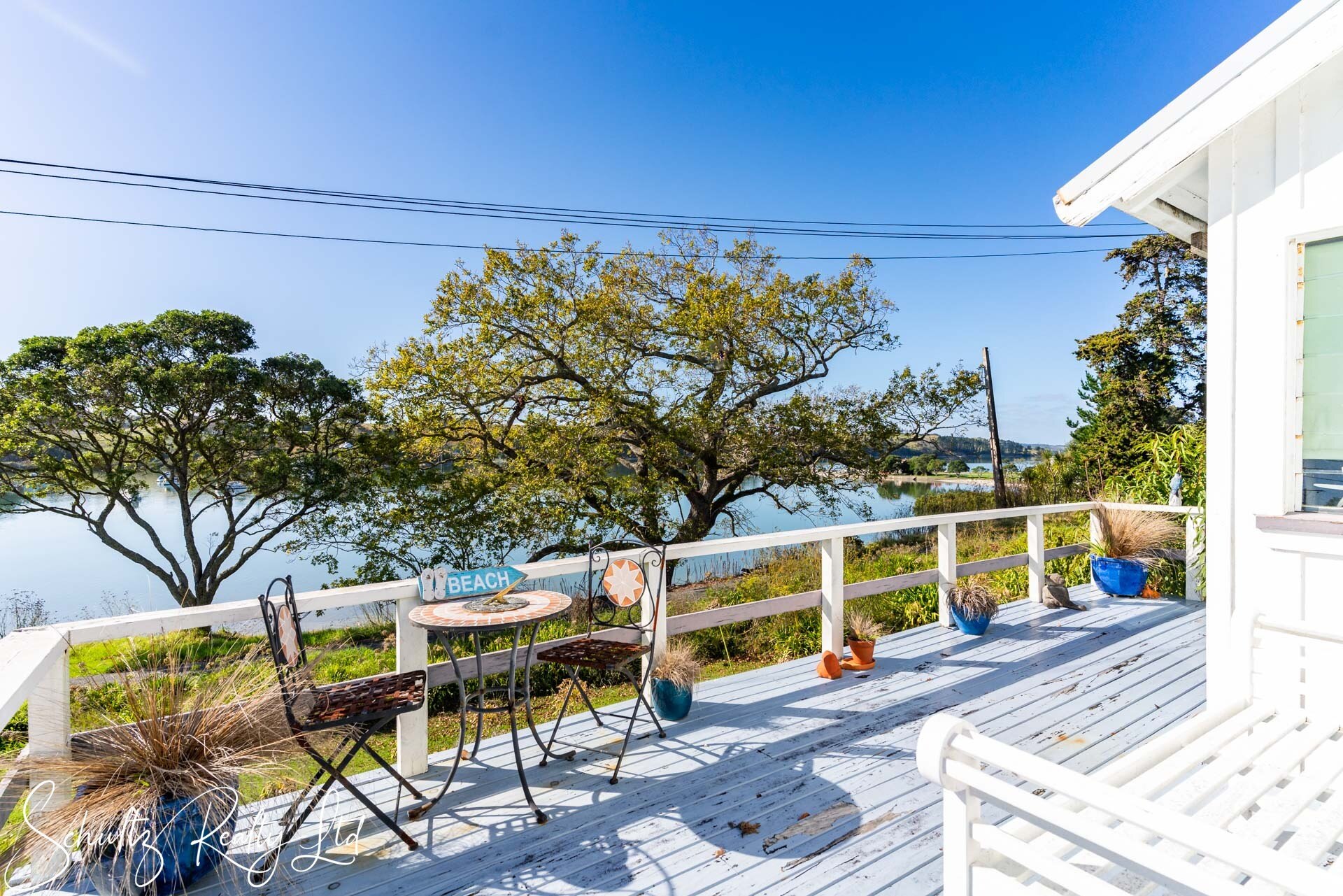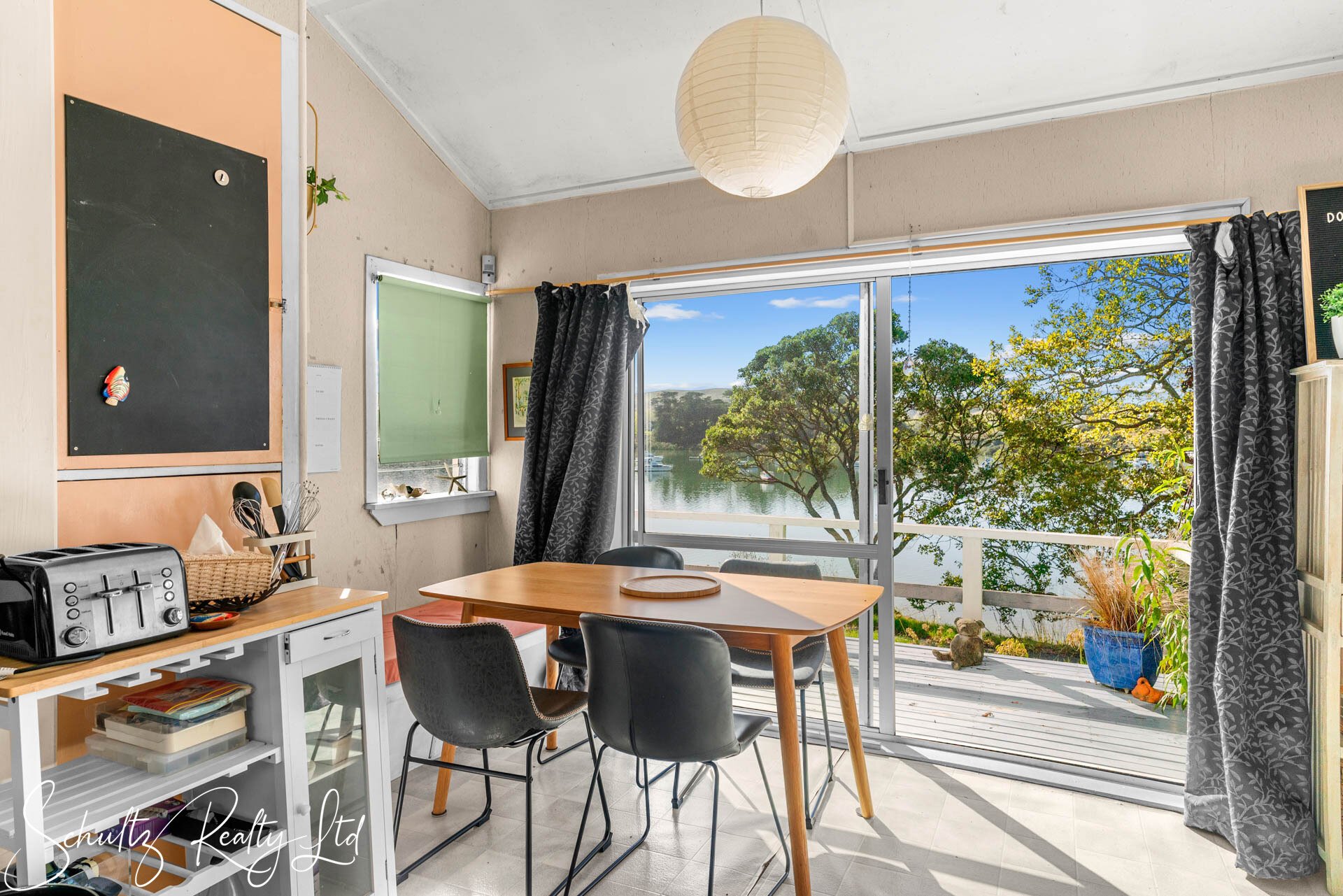 Wake to stunning water views and enjoy the spacious, open-plan kitchen and dining area, flowing effortlessly onto a sun-drenched - the perfect spot for your morning coffee or evening unwind. The light-filled lounge features high ceilings and a cozy wood burner, creating a welcoming space year-round. Step down to two generously sized bedrooms that offer comfort and seclusion, while a smaller third room off the entry is ideal for an office, guest nook, or extra storage.