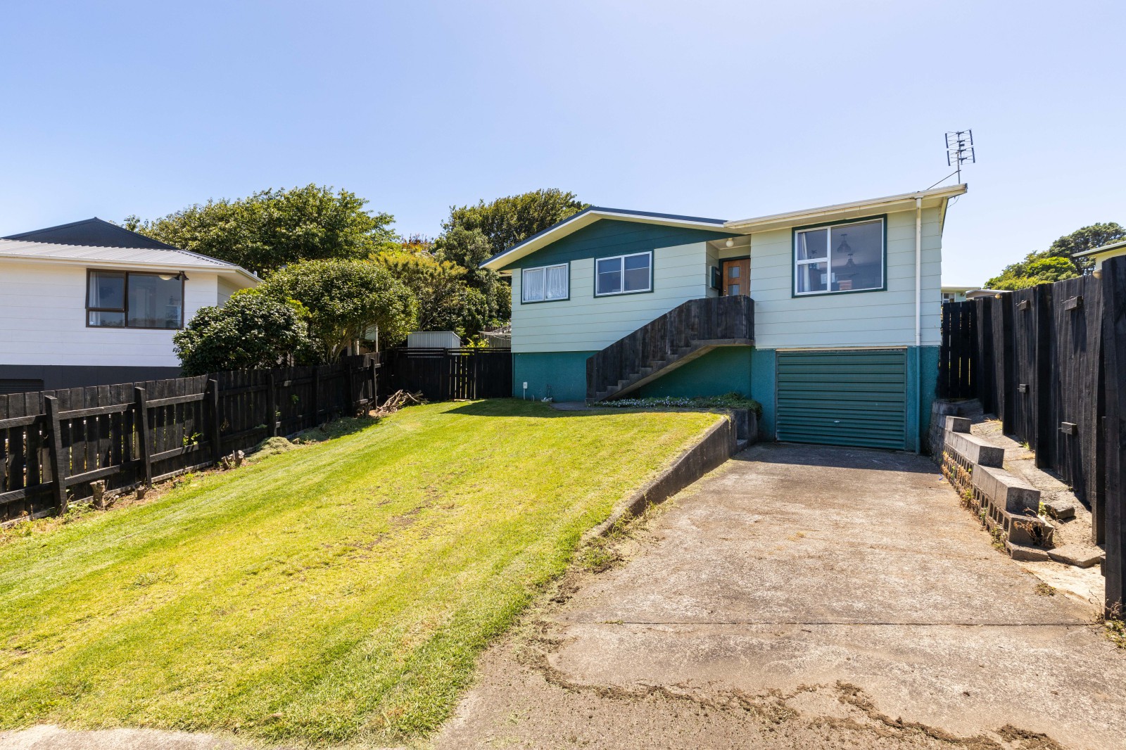 Situated on a split-level section is a single basement garage and concrete driveway downstairs with a flat, fully fenced back section leading out from the covered entertainment area upstairs.