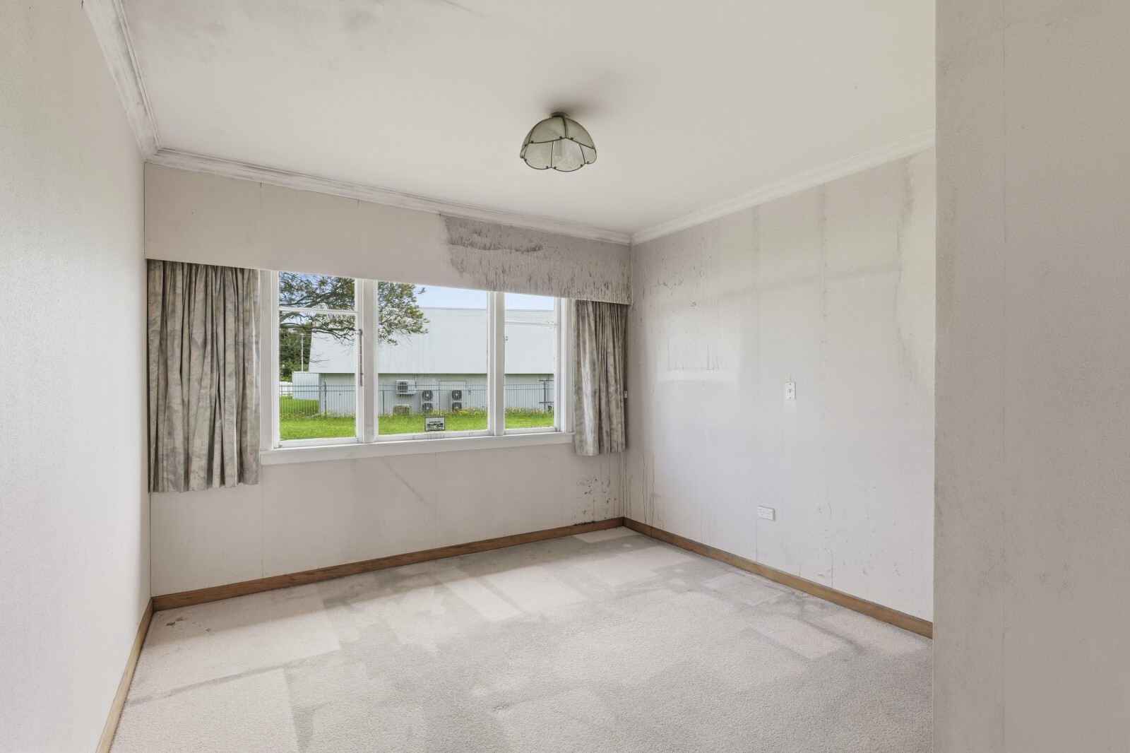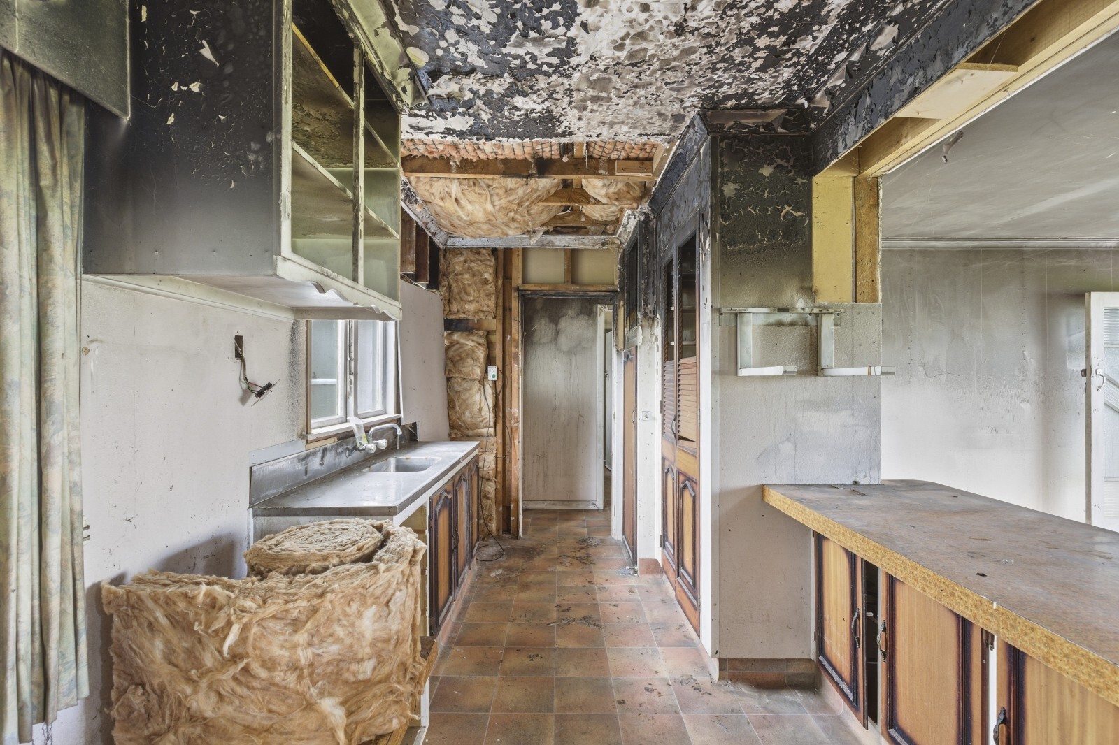 Fire damage is present inside, creating an opportunity for a full renovation or a complete rebuild to craft the home you’ve always imagined. The current layout includes open plan living, three bedrooms down the hallway, a bathroom with shower over bath and vanity, plus a separate toilet located past the laundry.