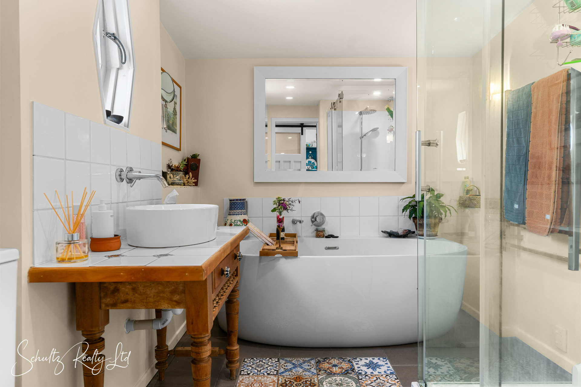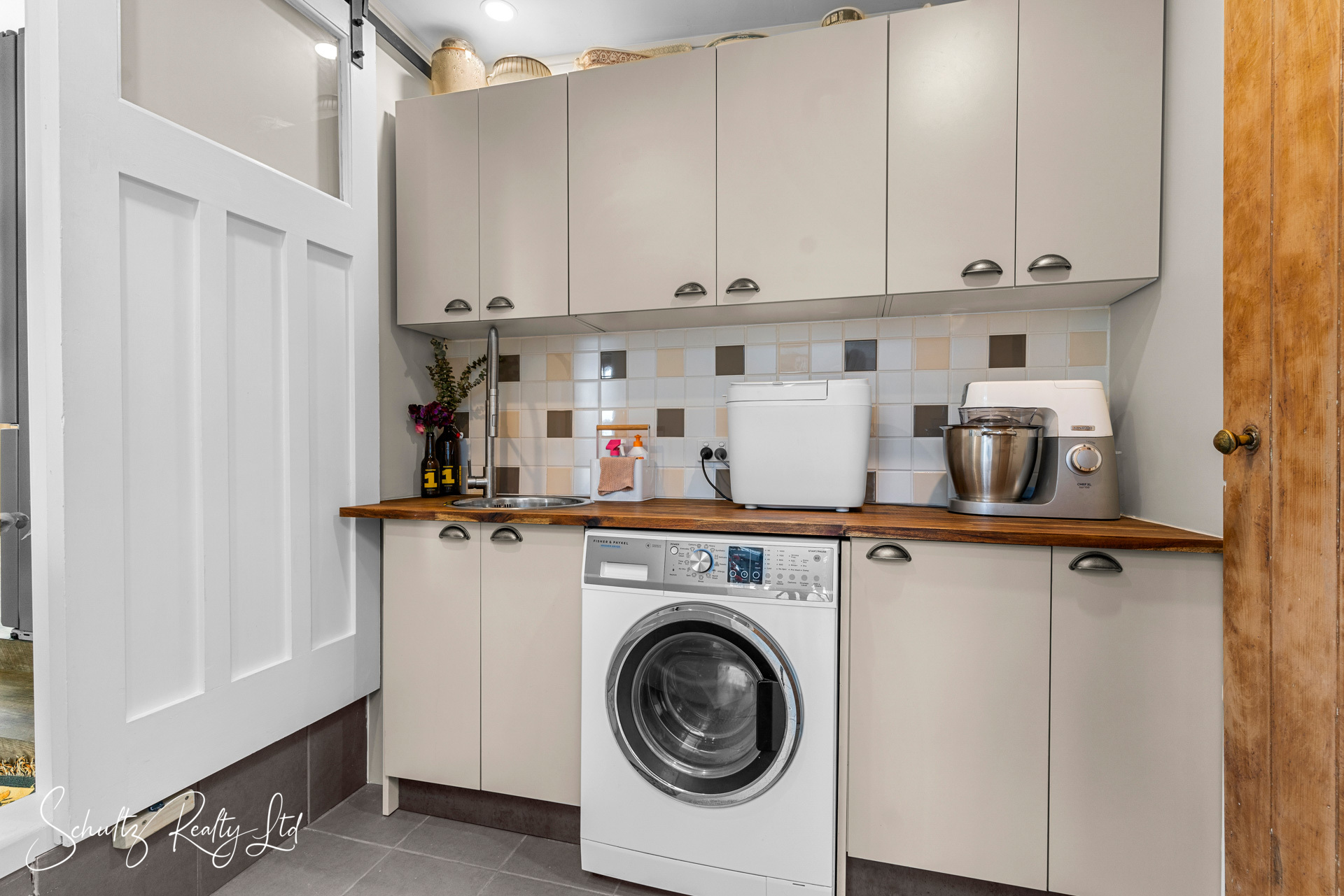 Three spacious bedrooms, two stylish bathrooms (one with a velux self-closing skylight), and a separate laundry complete the picture indoors.