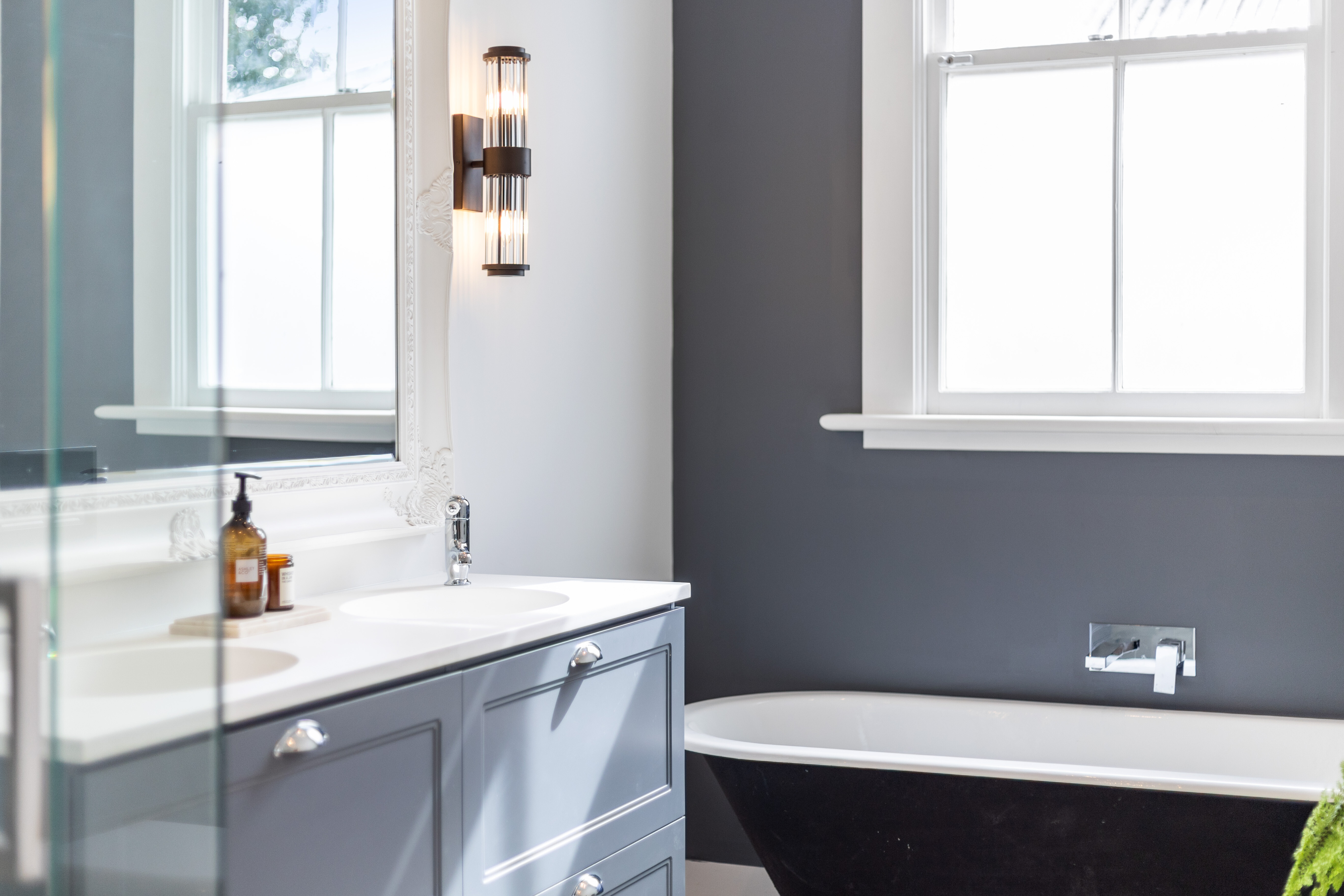 * Character details including classic stained-glass accents, high ceilings, and a clawfoot bathtub, blending vintage charm with modern touches