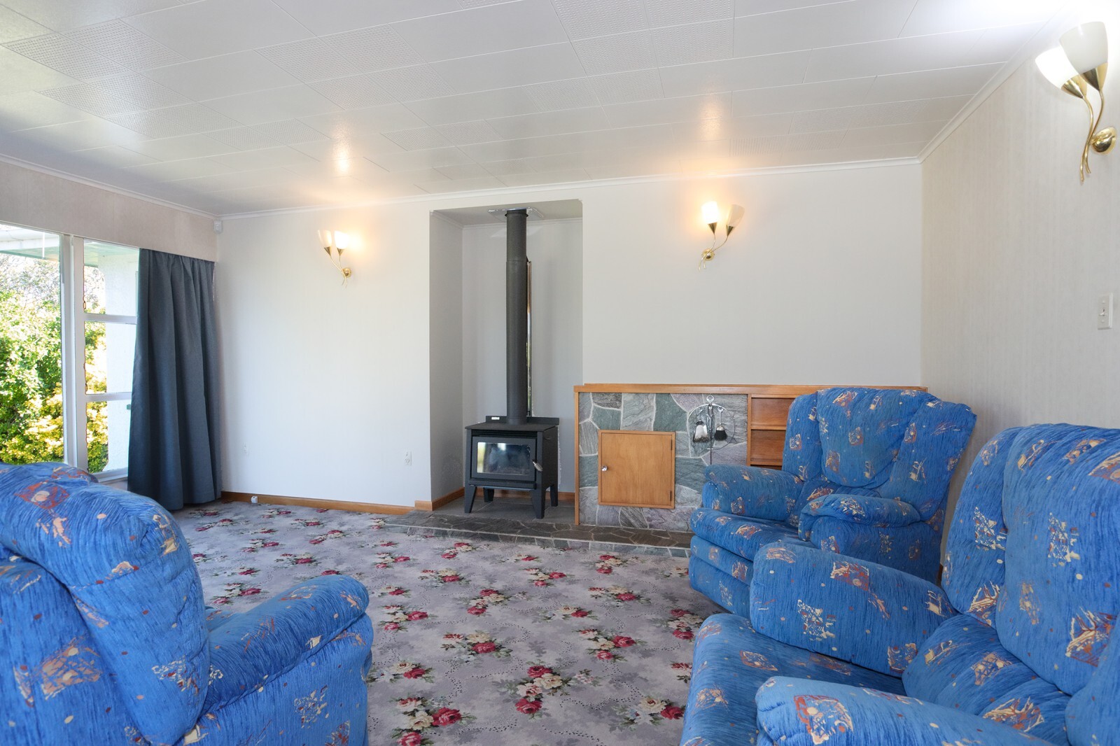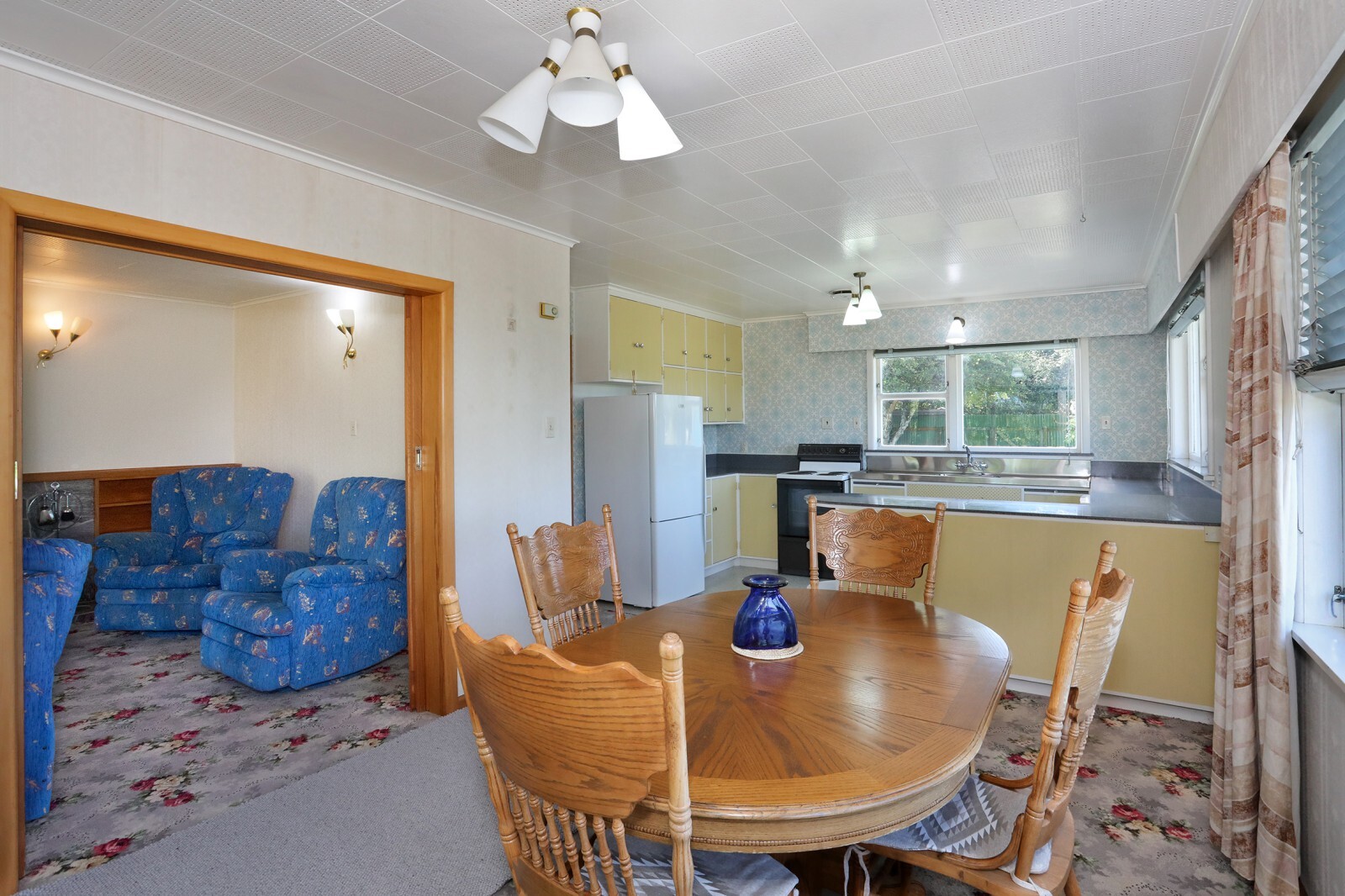 The north-facing open-plan kitchen and dining area flows through to a spacious lounge, with sliding doors allowing the space to be opened up or closed off as needed. A log fire installed in 2020 provides efficient heating, while French doors open from the lounge to a covered patio — ideal for indoor-outdoor living.