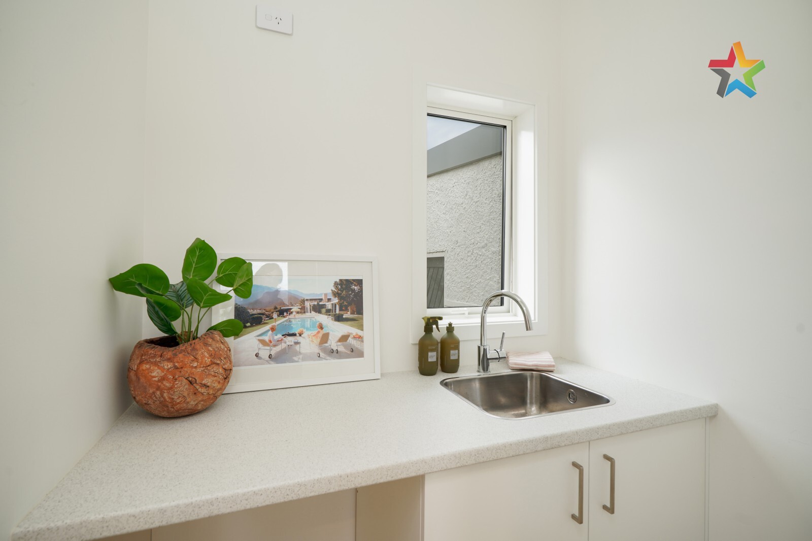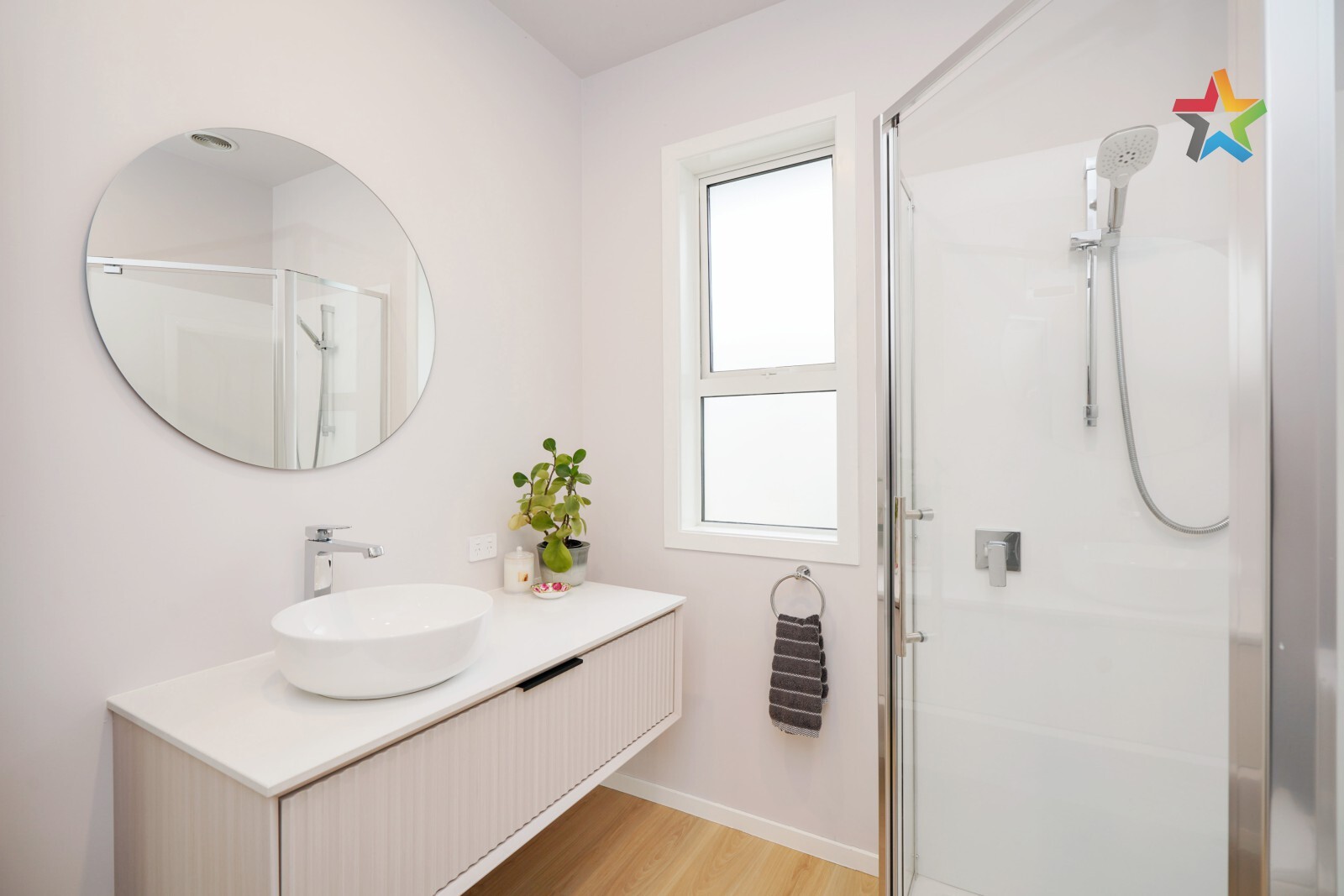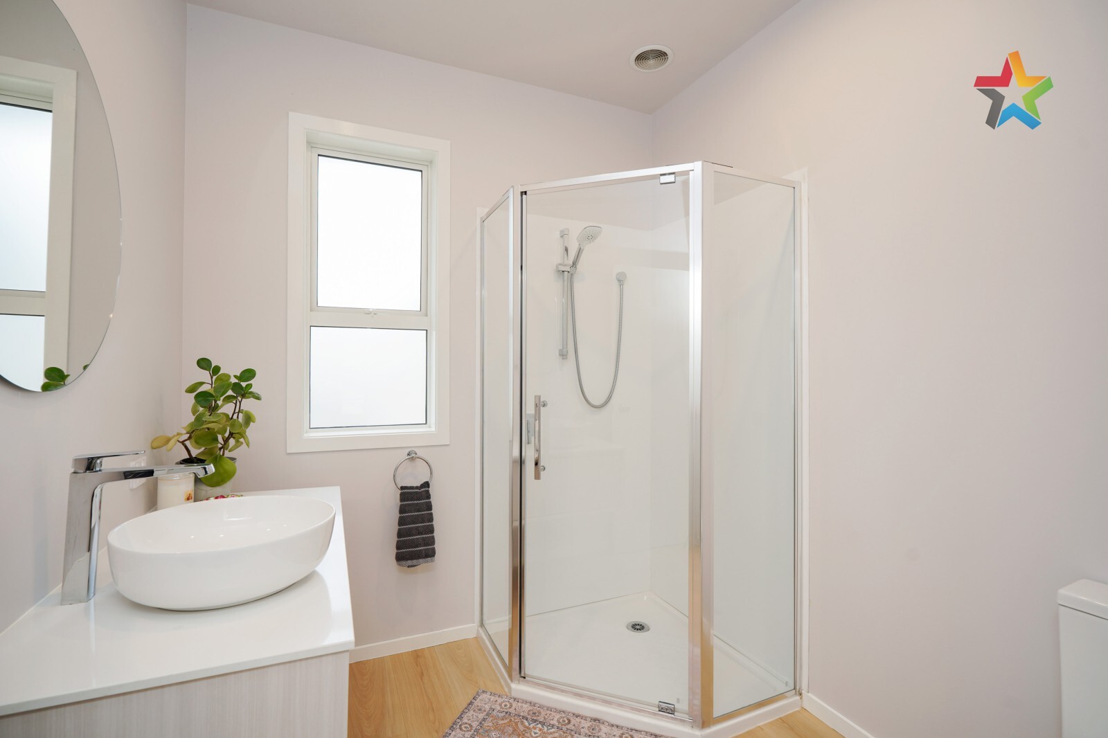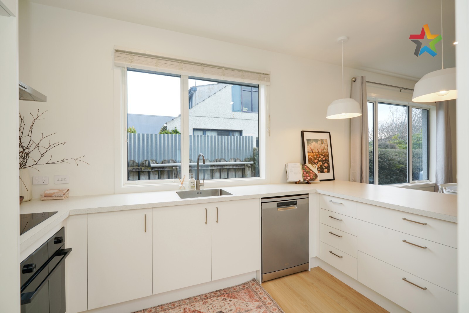 Modern kitchen and bathroom, tastefully updated with contemporary finishes.