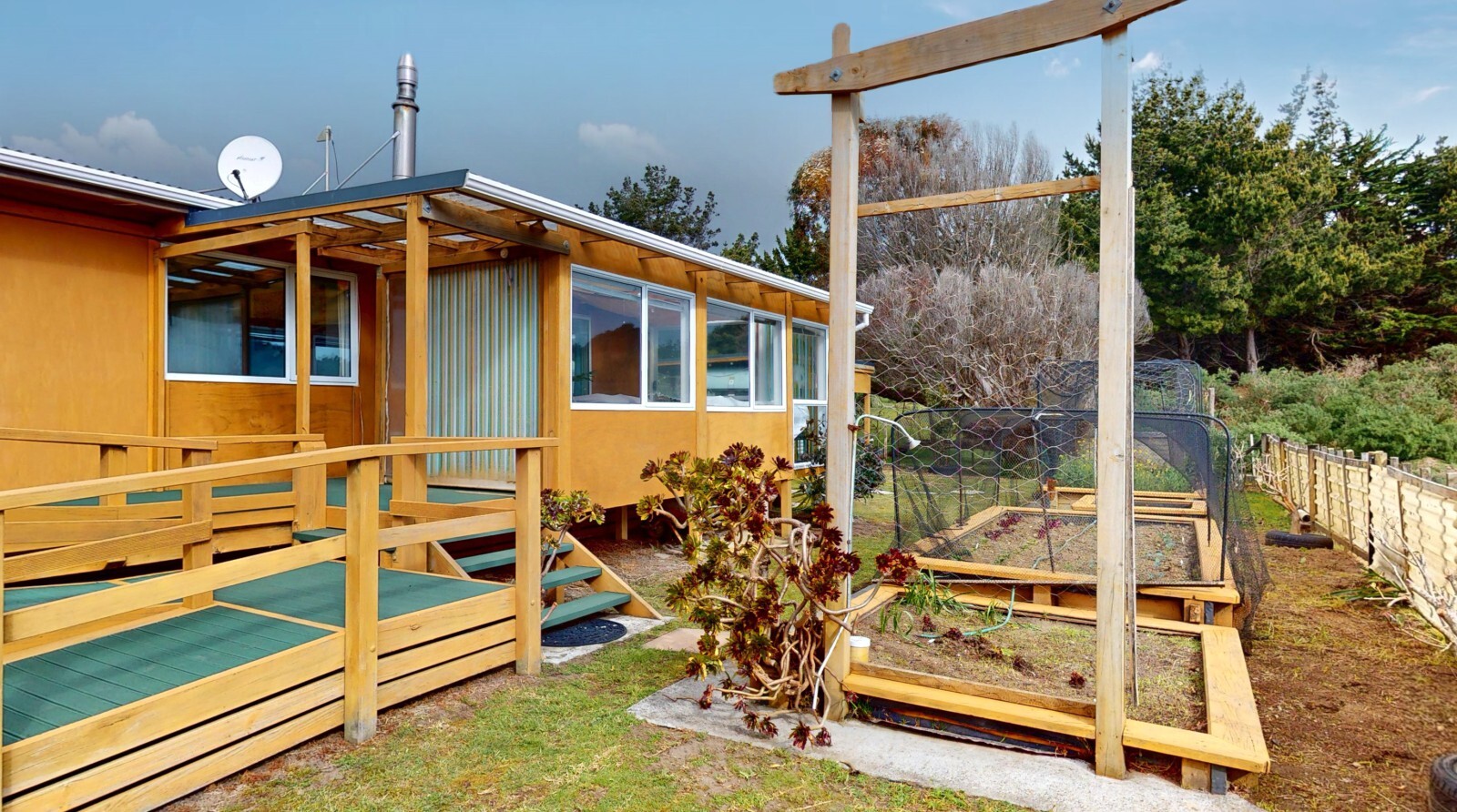 Outdoors offers large box gardens with bird protection, a garage with potential to convert into a double, and excellent entertaining areas, including a full deck, covered alfresco space, and wheelchair ramps. The property runs on tank water and a septic system for self-sufficiency.