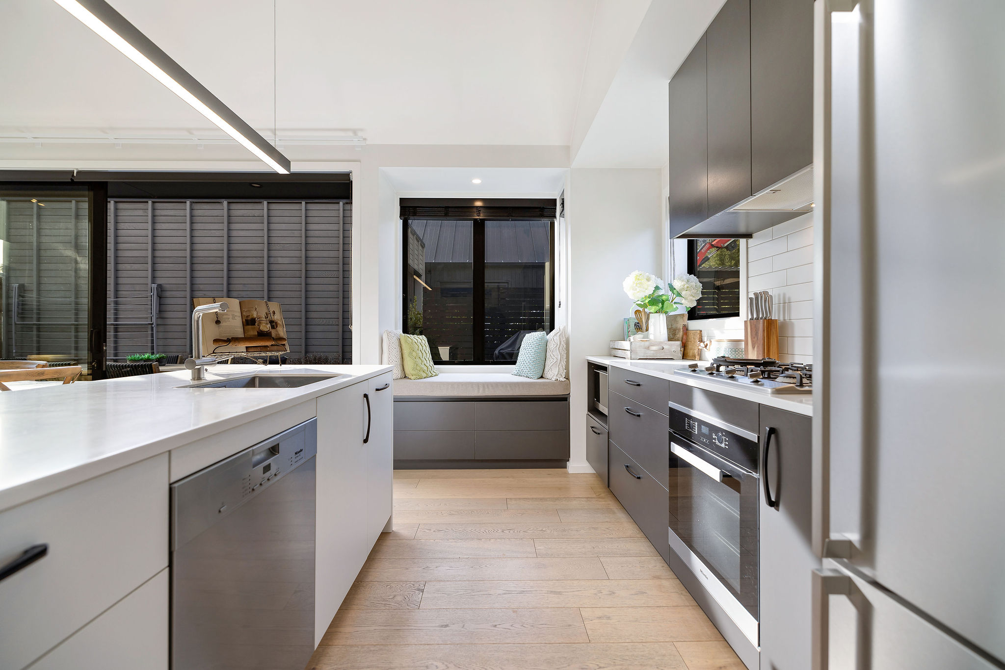The Kitchen offers sleek clean surfaces and at bench dining for four.