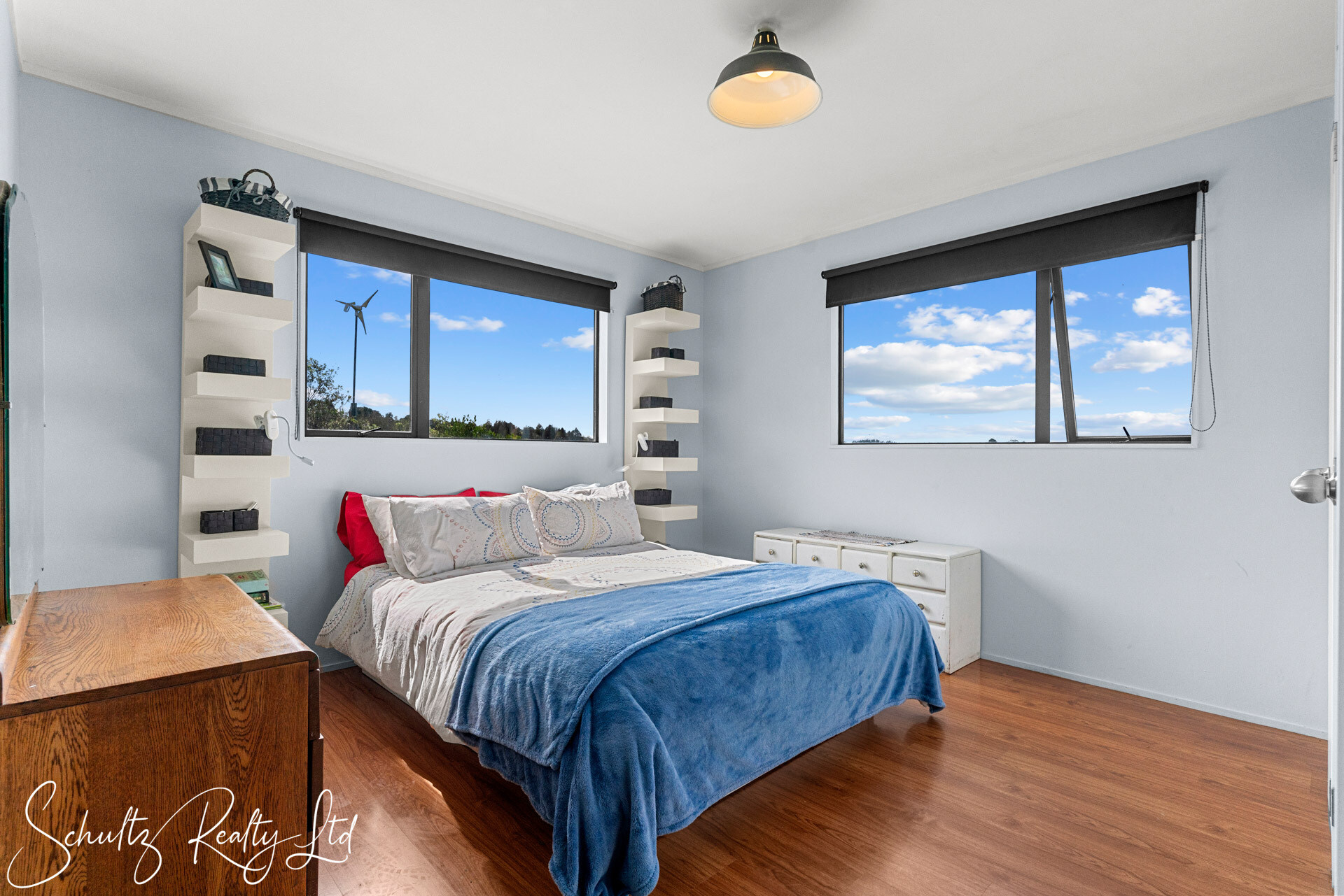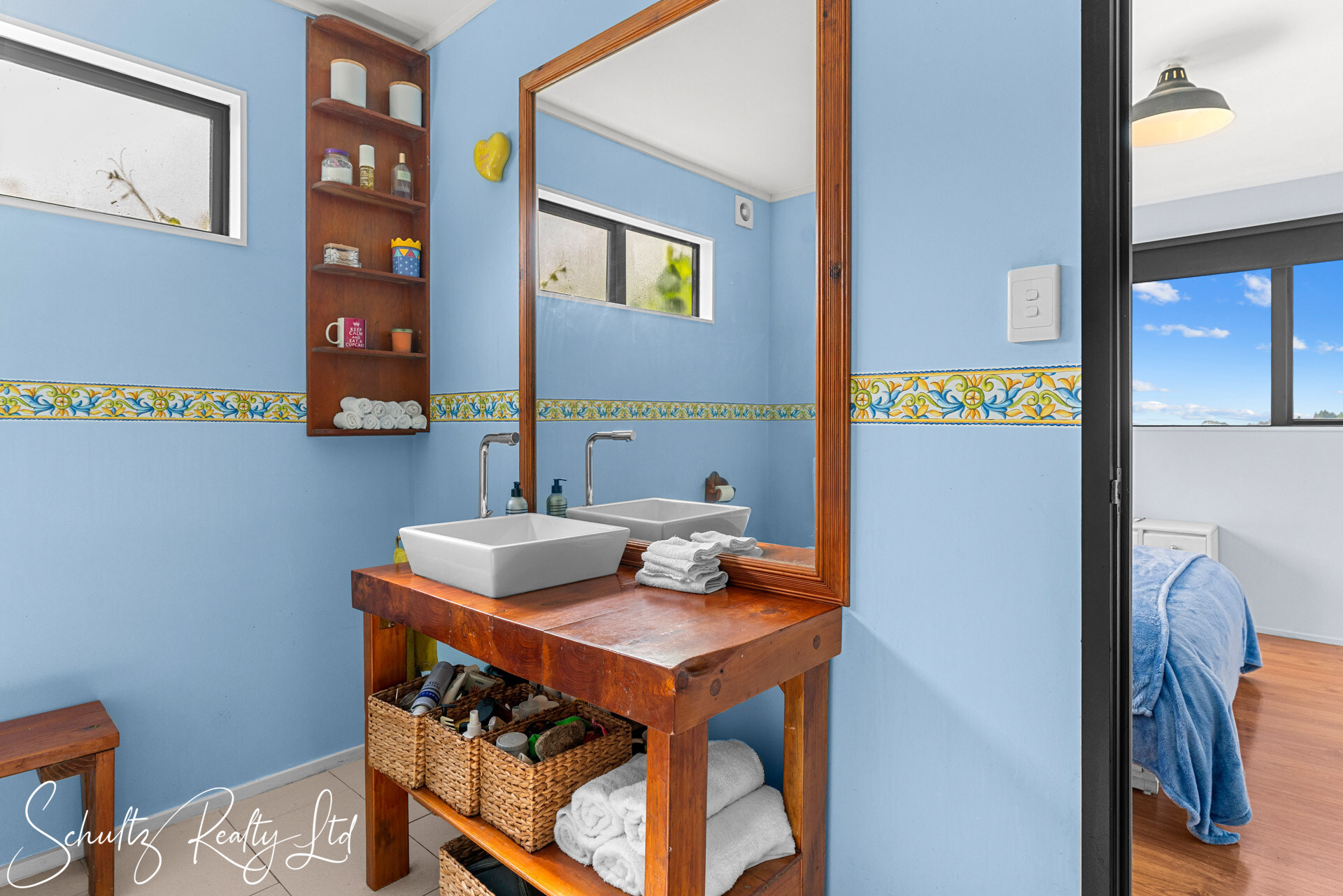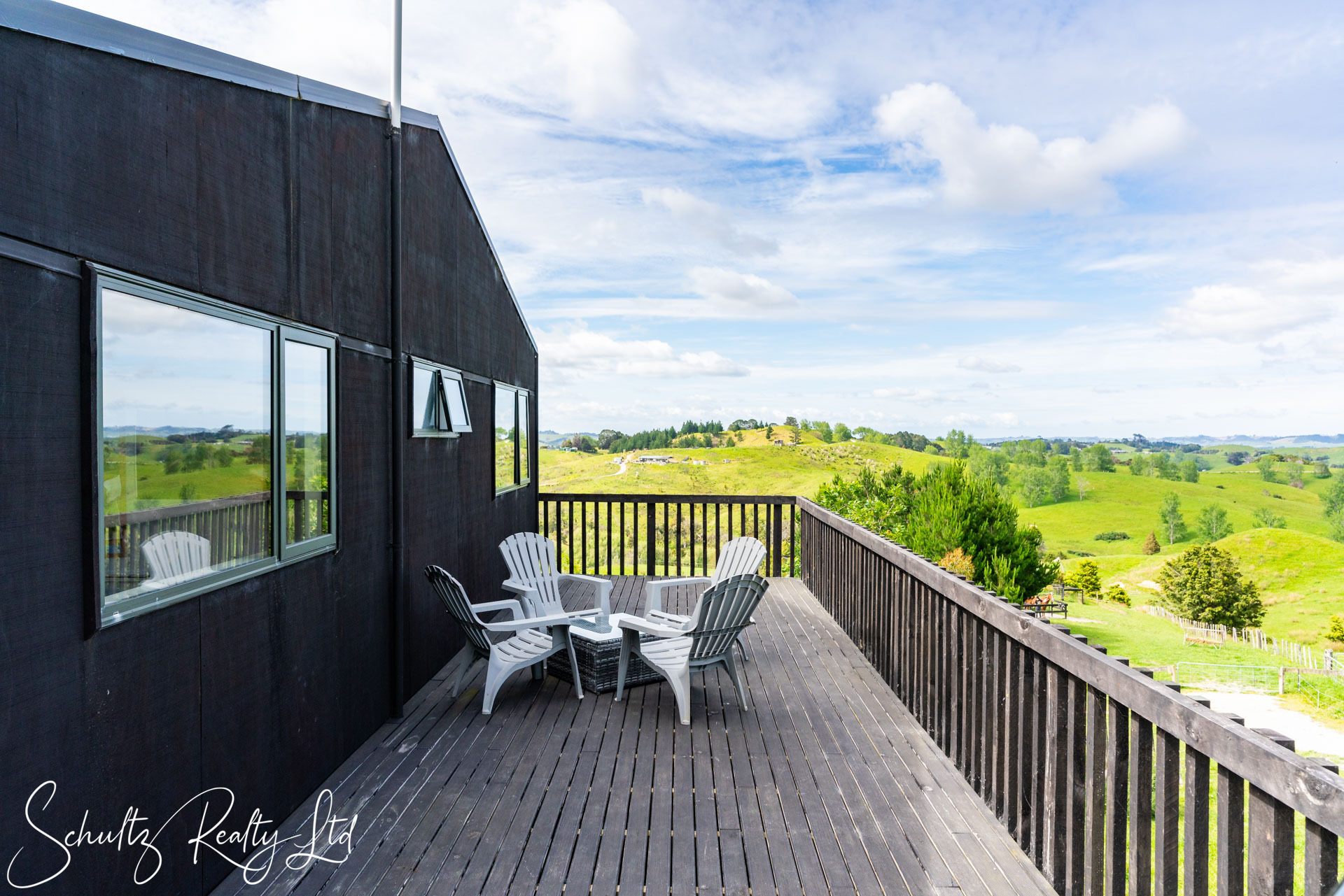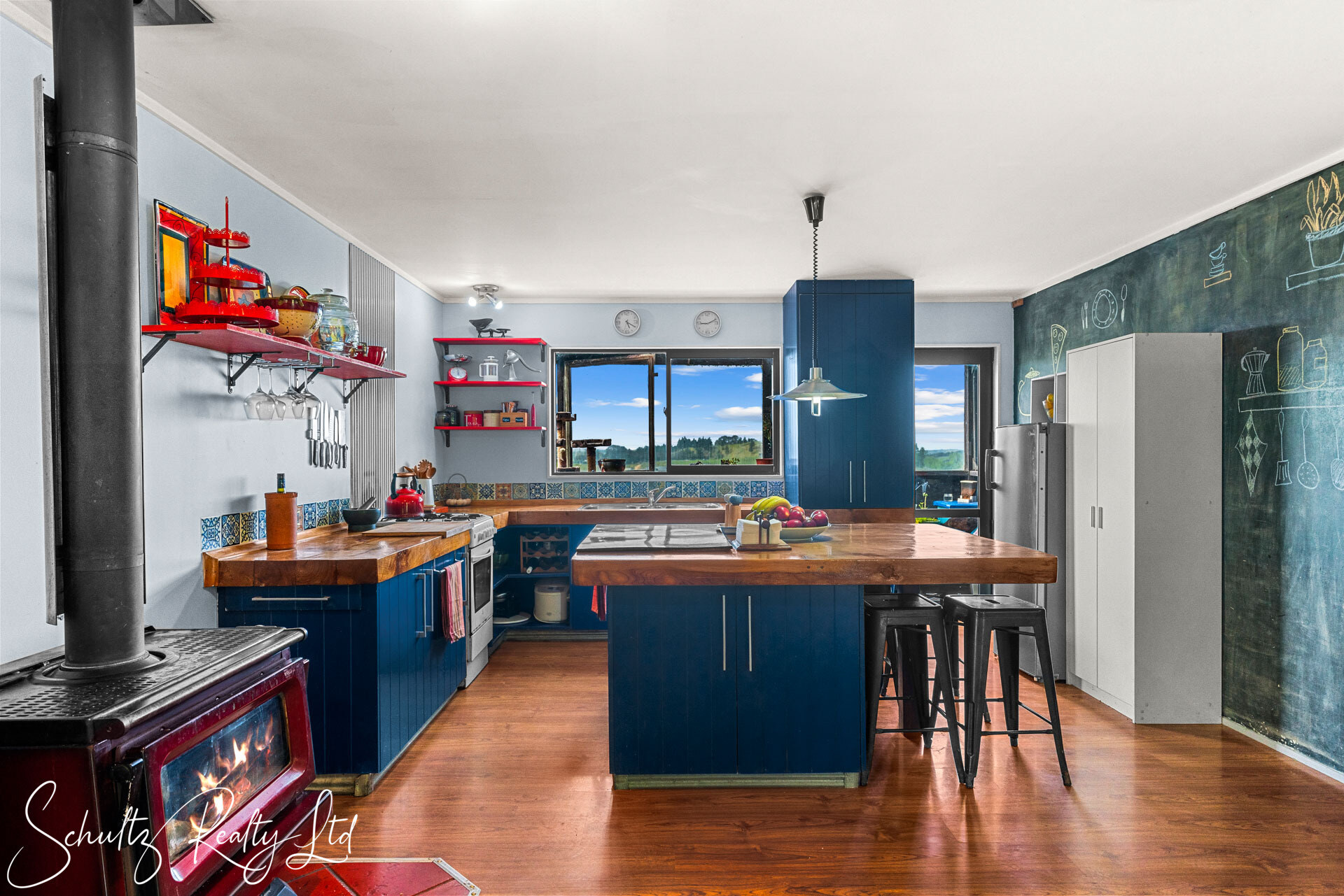 macrocarpa countertops, gas cooking, and a wood burner for cozy evenings. Sliding doors open to a wrap-around deck, partly