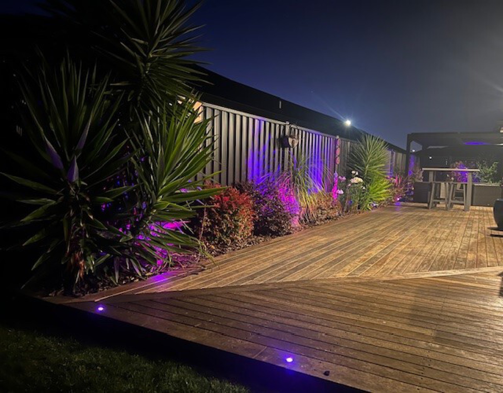 * Large entertainment decking with customisable lighting, louvre roof system and firepit