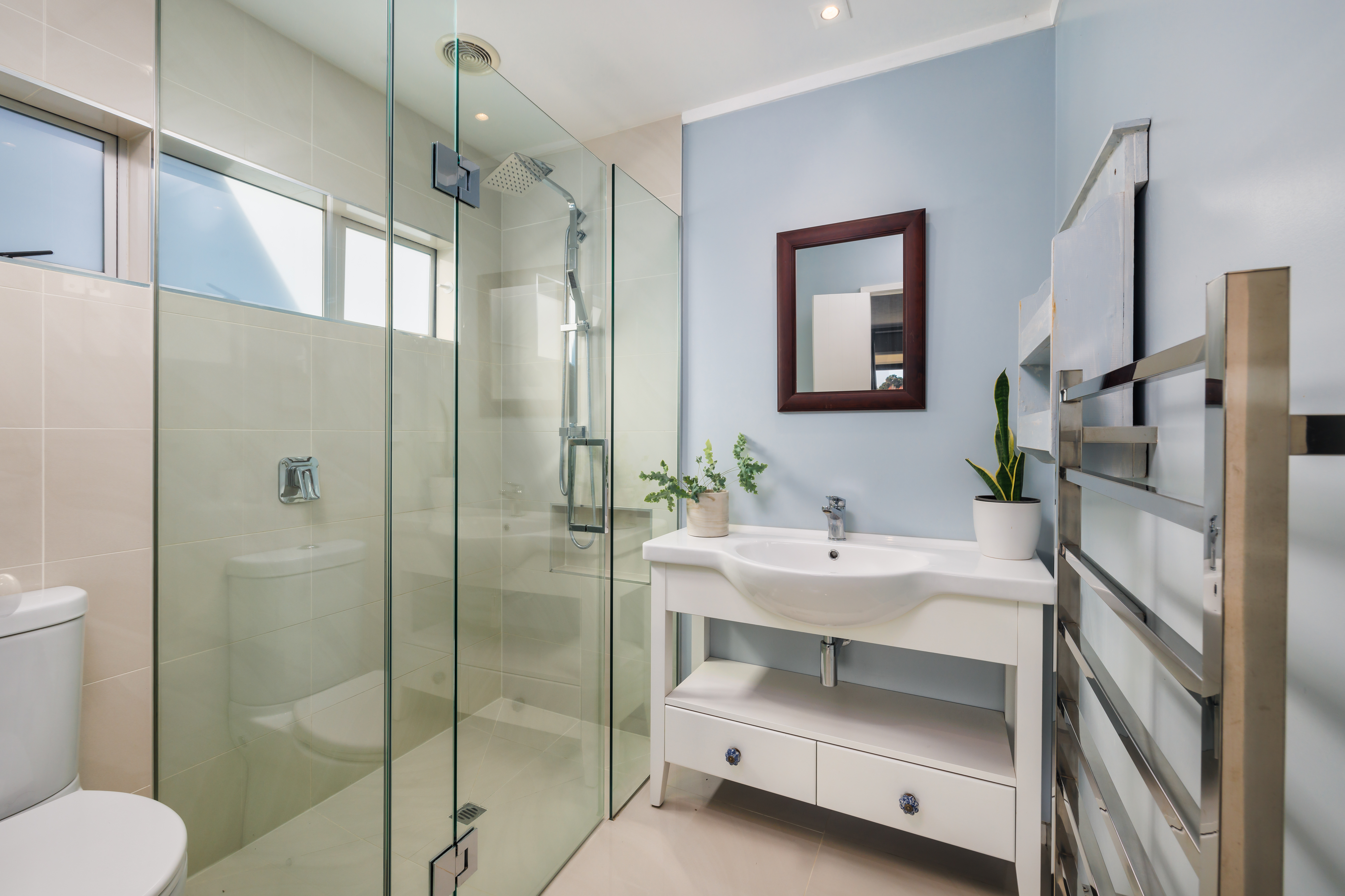 The master bedroom is a spacious, light filled space and has a walk-in wardrobe and tiled, ensuite bathroom with dual head shower and heated towel rails.