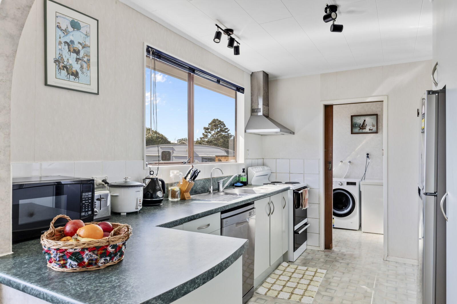 Step inside and you'll discover a three bedroom home bursting with potential, showcasing some incredible 70s features such as arched doorways and amber windows. Natural light pours into the living spaces which flow through from one room to another seamlessly through the archways, creating a sense of openness and connection. The kitchen is practical and well laid out, ideal for everyday living, while the bathroom includes a full sized bath, with a separate shower room for added convenience. There's also a modest laundry space to meet your daily needs. The freestanding fireplace in the dining room ensures warmth, with the additional benefit of an heat transfer system.