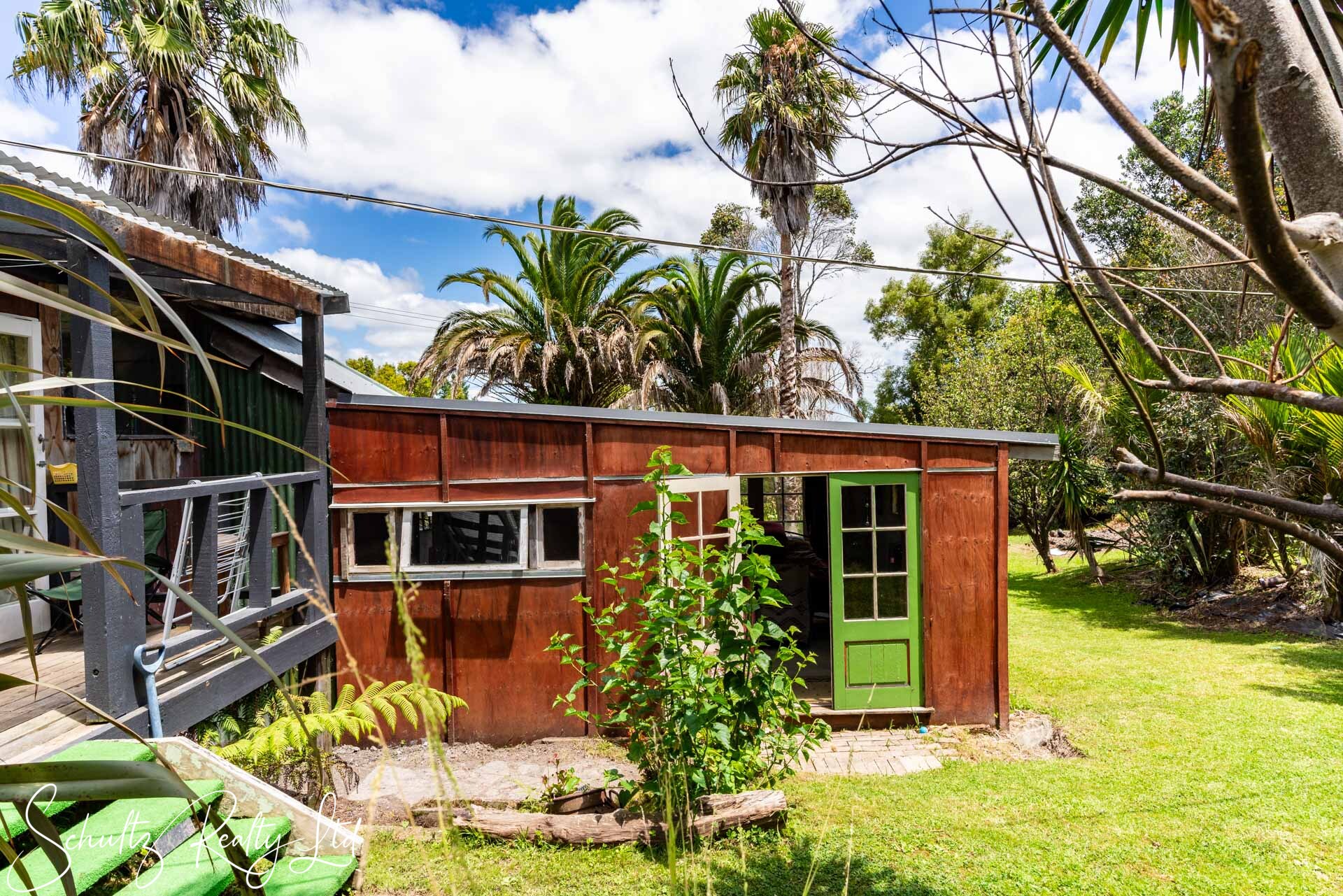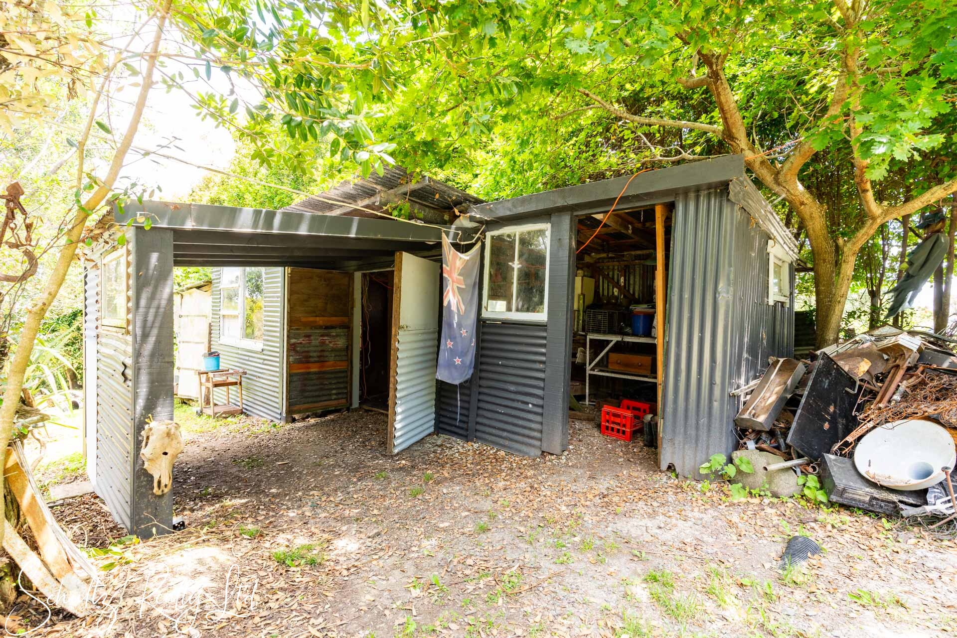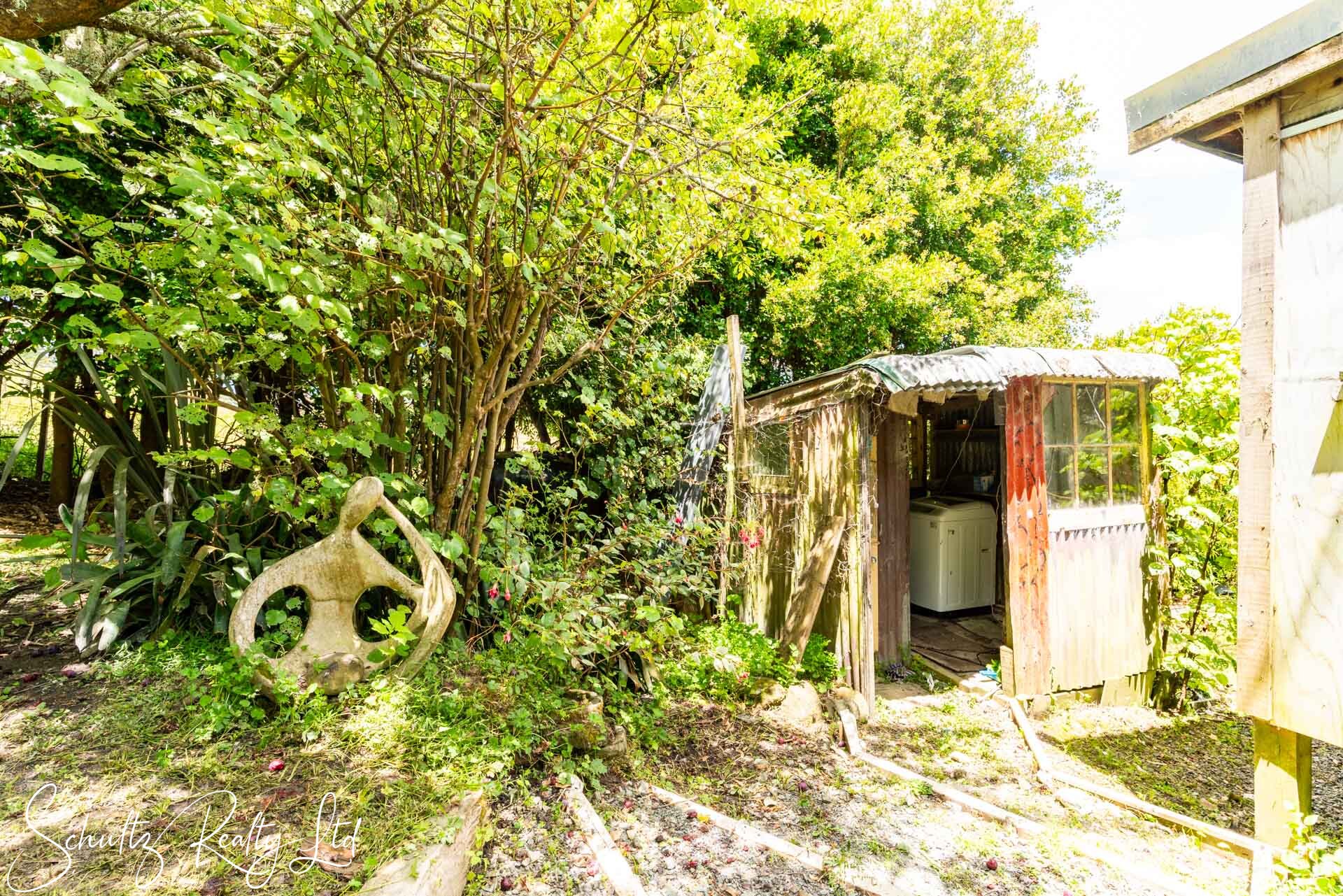 Currently requiring attention, the property lacks proper consents from the council. Although power installation has been certified, the wood burner and home remains unconsented. The dwelling includes a covered deck that extends seamlessly from the living area, offering a pleasant outlook. Additionally, the laundry is situated outside, while the home is equipped with a gas califont for hot water and gas cooking. A shed featuring a workshop and a single-lined room provides valuable extra storage and potential accommodation for family and friends.