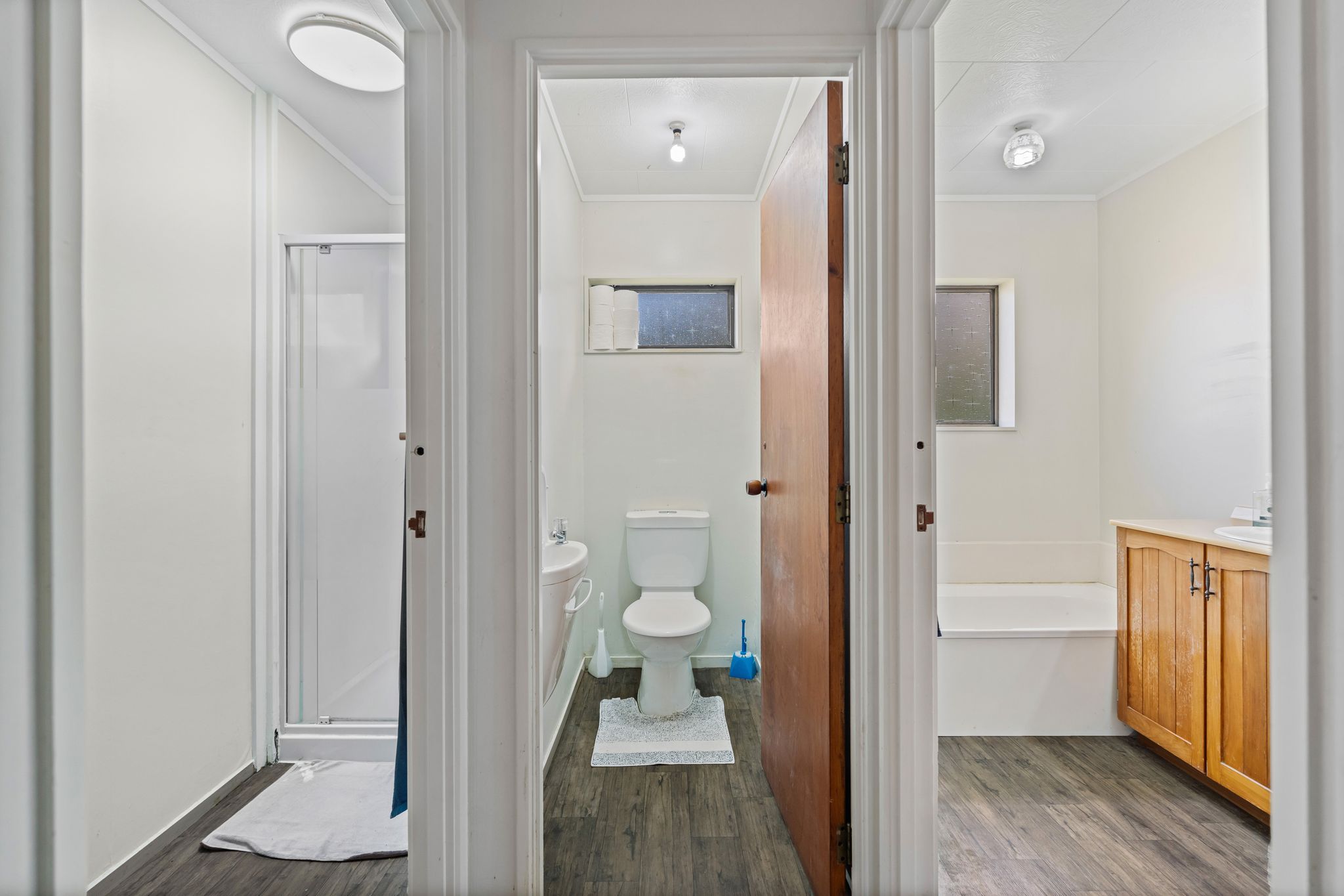 The open plan kitchen, dining & lounge have ranch-sliders to the covered front deck and there is a large, wood paneled, second lounge/rumpus/media room. There is a bathroom with double vanity and bath, separate WC and separate shower - convenient for busy family mornings. The master bedroom opens to the deck and there is a sunny, fully fenced rear garden - with enough space for the kids to kick a ball but manageable for a retiree.