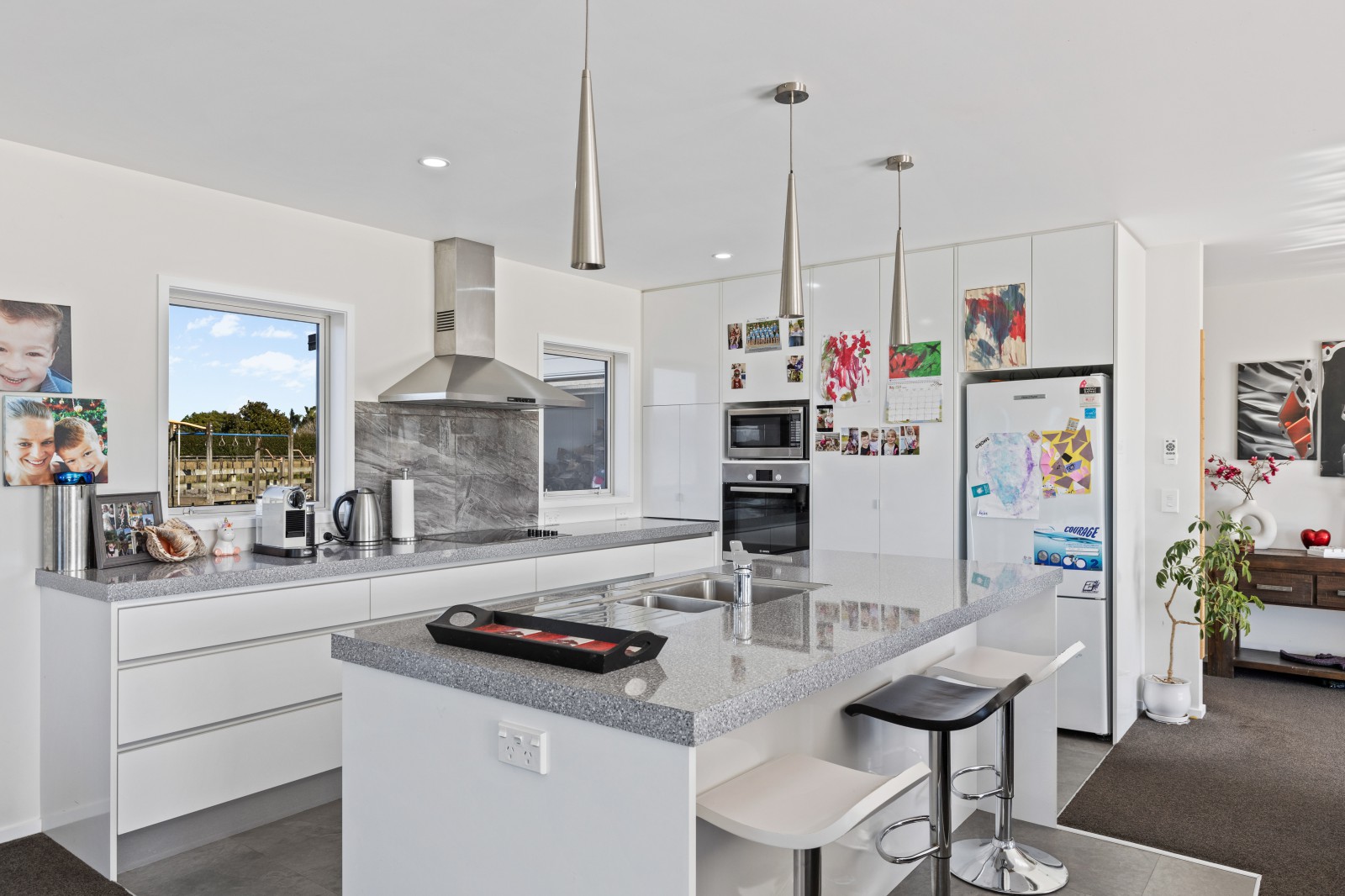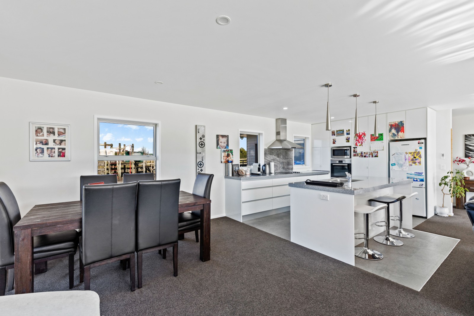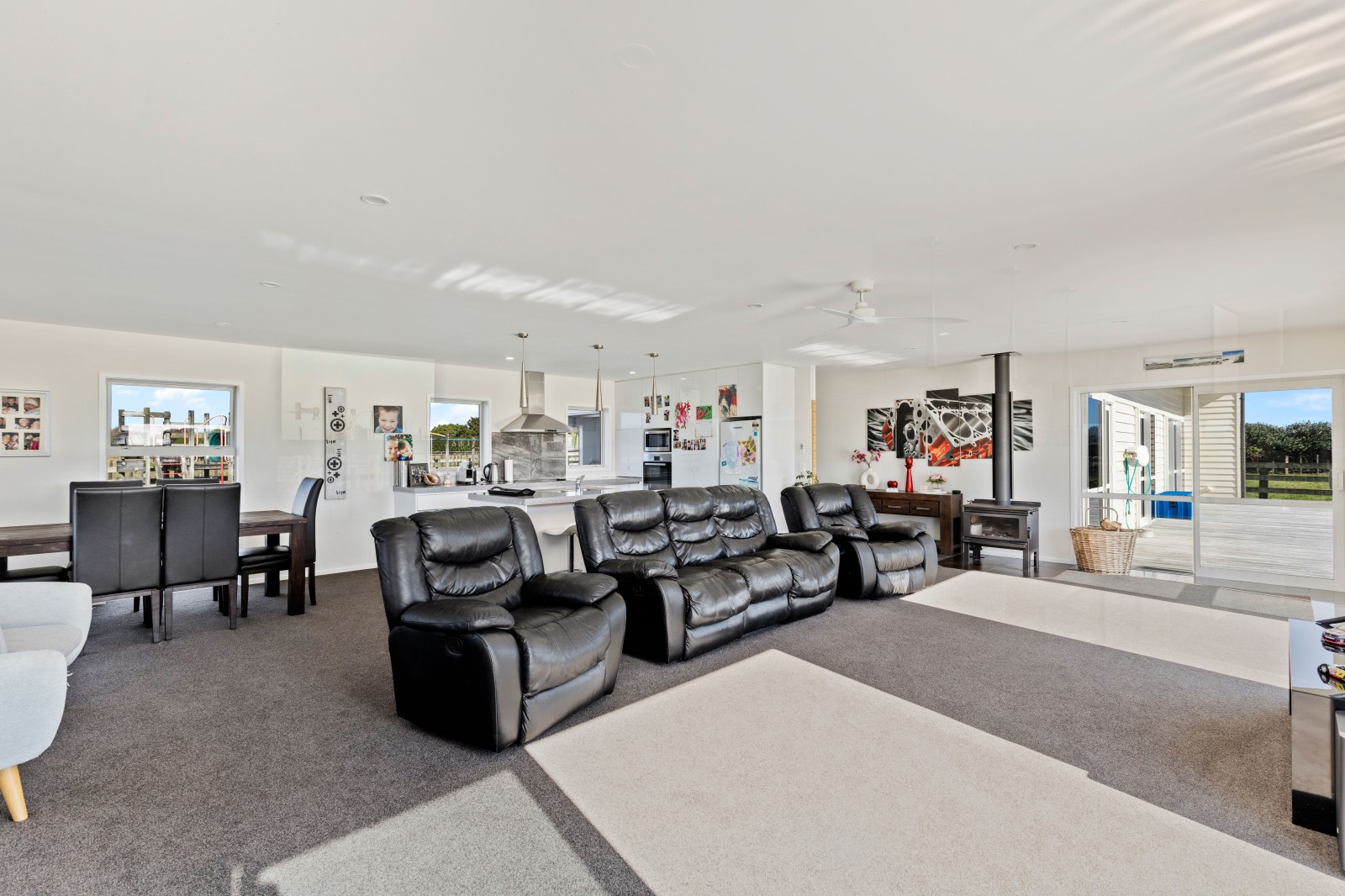 As you drive down the fenced, concrete driveway, you'll be greeted by the charming linea weatherboard home. Inside, expansive open-plan living areas await, highlighted by a stunning kitchen boasting generous space, an island bench doubling as a breakfast bar, and ample sleek storage solutions. The dining area seamlessly transitions into the living room, extending outdoors to the deck, offering the perfect spot for al fresco dining in the sunshine.