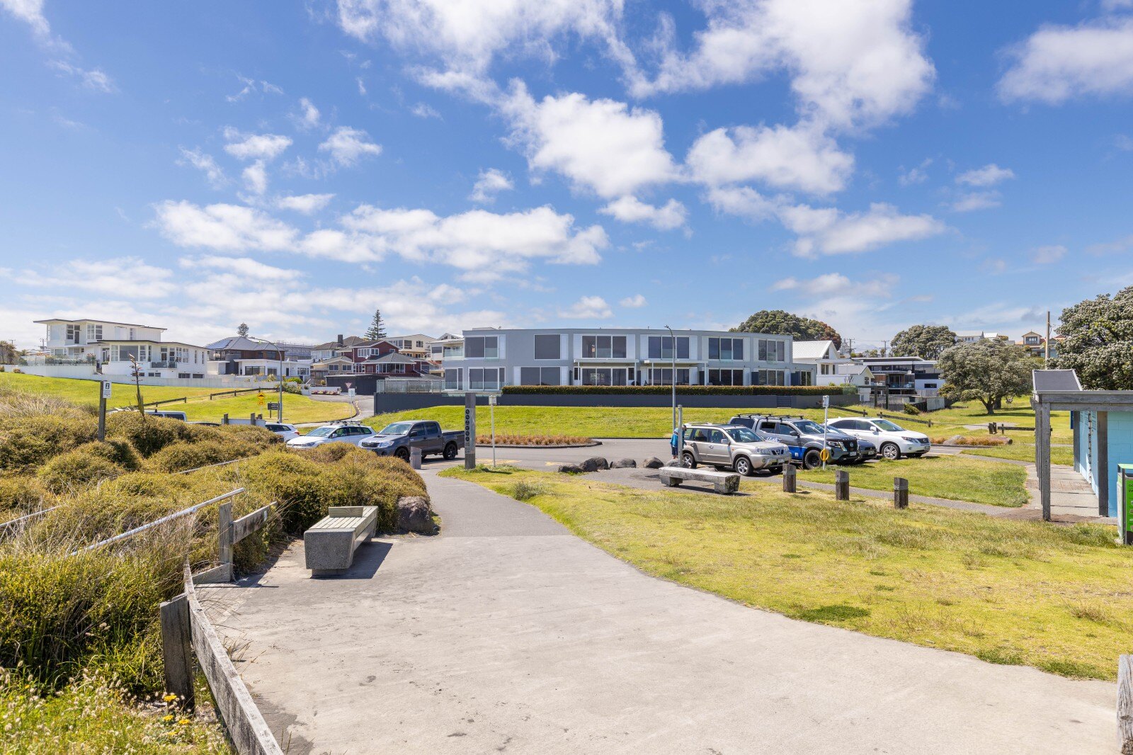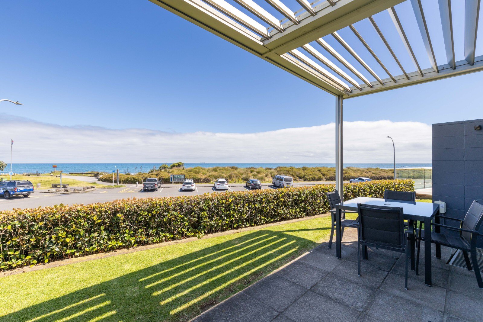 The open plan kitchen, dining, living space seamlessly flows onto a charming outdoor patio and grass area, ideal for soaking up the panoramic beach views or watching the vibrant activity of East End Reserve. The upper level boasts a master bedroom with awe inspiring ocean vistas, a generous second bedroom, and a spacious, modern tiled bathroom. Downstairs, a versatile third bedroom or office awaits, complete with an additional bathroom, laundry, single garage, and ample storage space. An internal lift provides smooth access to all levels, ensuring ultimate convenience.
