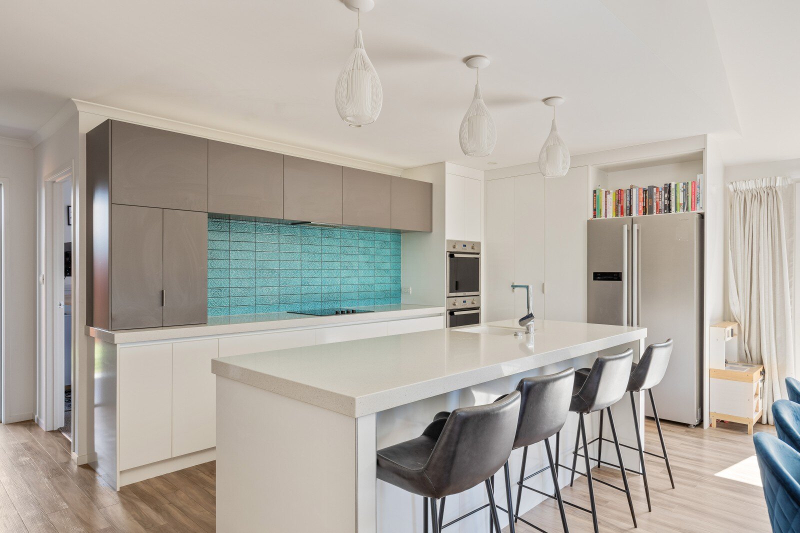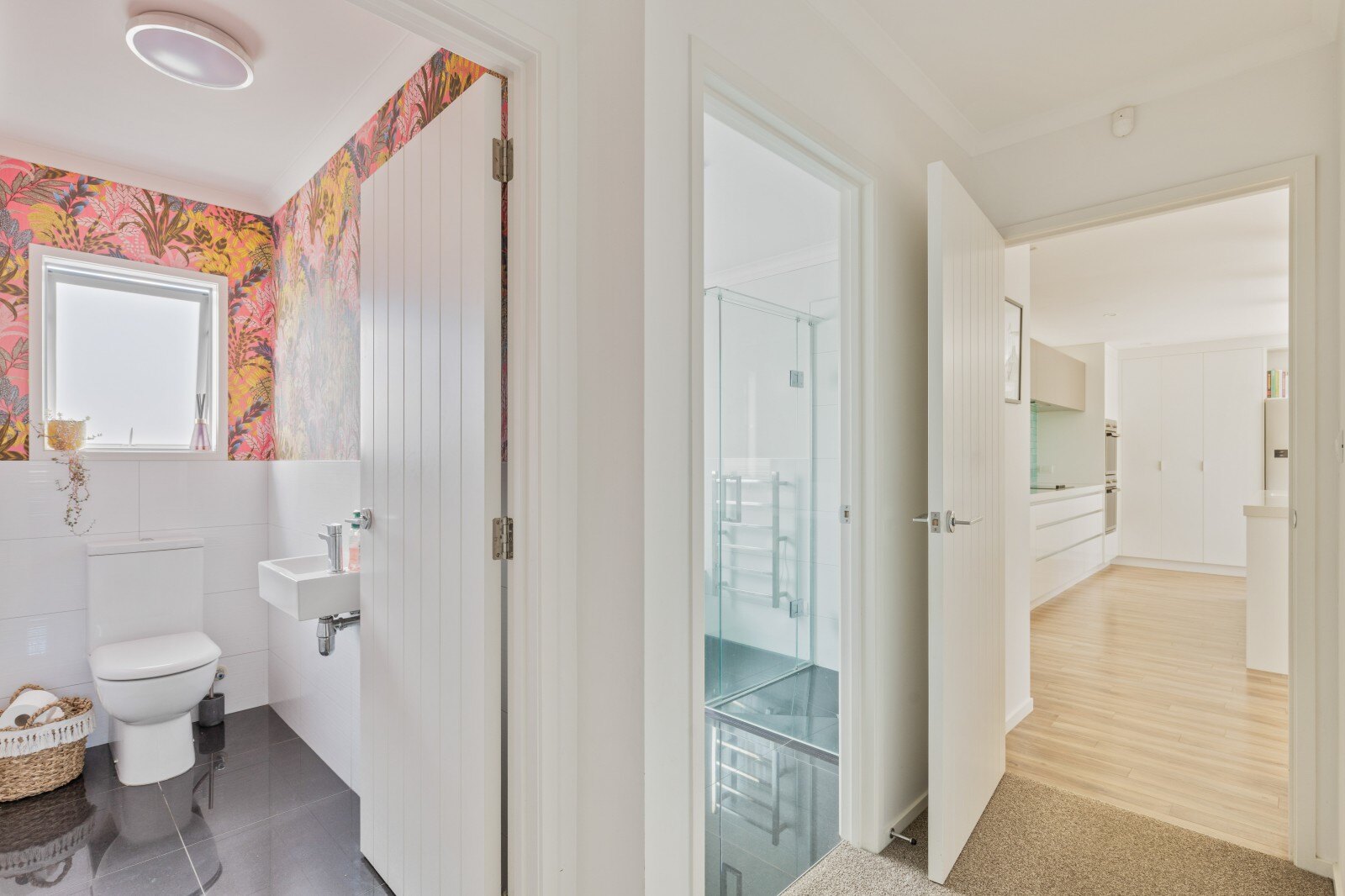 At the heart of the home, the stylish kitchen is a true standout. Featuring sleek stone benchtops, two premium wall ovens, and a spacious double door fridge, it seamlessly connects to the open plan living area, where high raked ceilings enhance the sense of space. Expansive sliding doors on either side invite natural light and fresh air, creating a seamless indoor outdoor flow. In summer, enjoy the gentle evening breeze, while in the cooler months, stay warm with multiple heating options, including ducted heating and cooling, and underfloor heating in the bathrooms for added comfort.
