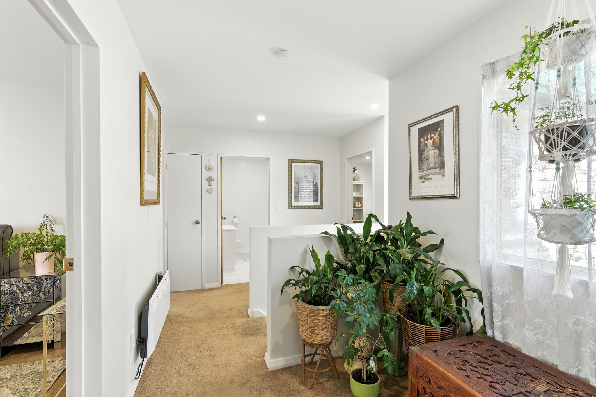 The garage, with its insulated door, is currently used as an art studio-an adaptable space that could easily suit a hobby, home gym, or additional living area.