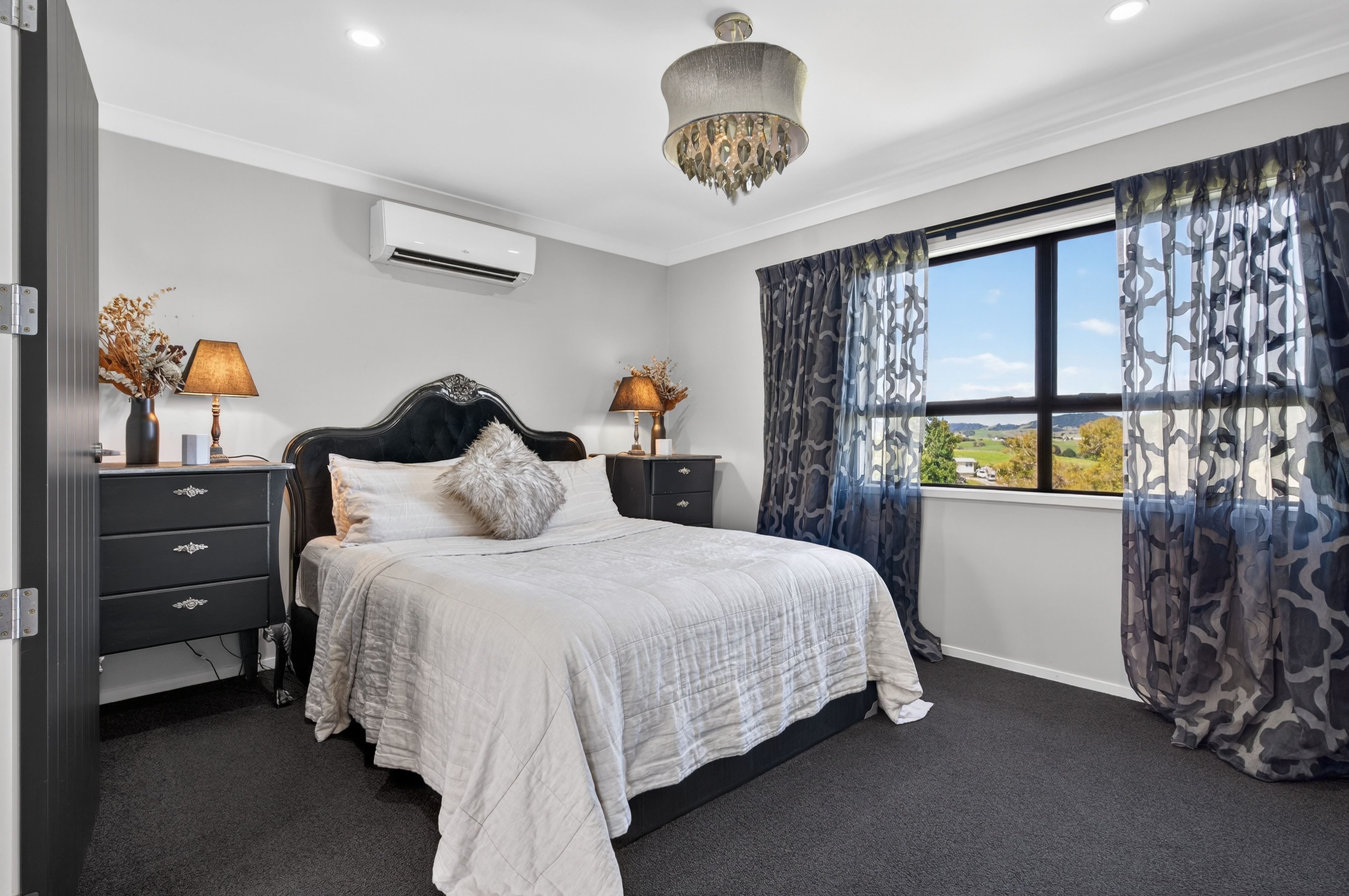 The kitchen is the heart of the home, designed for easy living with high-gloss cabinetry, engineered benchtops, soft-close drawers, and double-glazed joinery. Two ovens, a bar fridge, and generous space for a large fridge make entertaining simple, while large doors open straight onto the deck for seamless indoor-outdoor flow and countryside views. A separate lounge with a striking fireplace creates a cosy place to relax.
