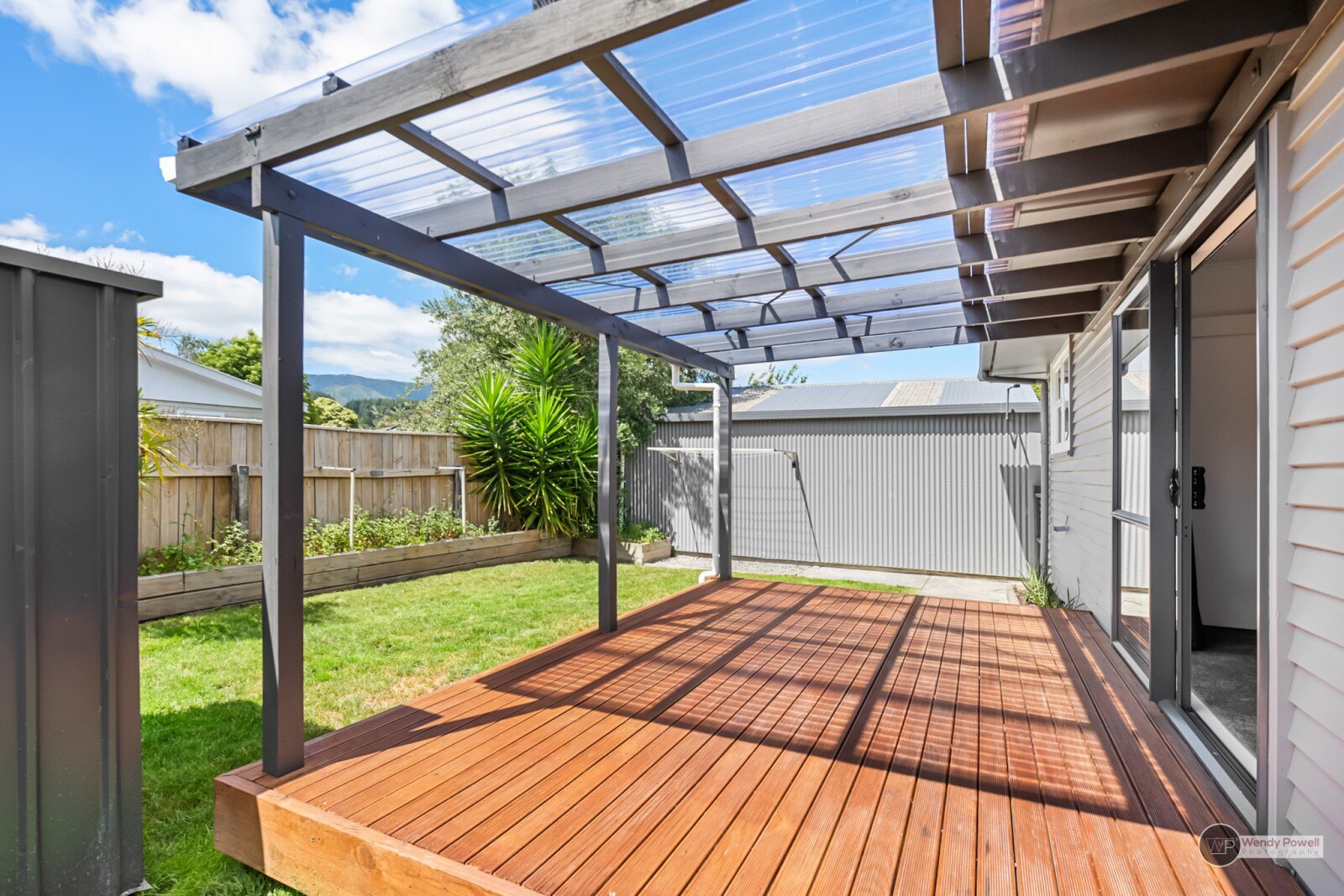 * Seamless indoor-outdoor flow with large slider doors opening onto a covered deck