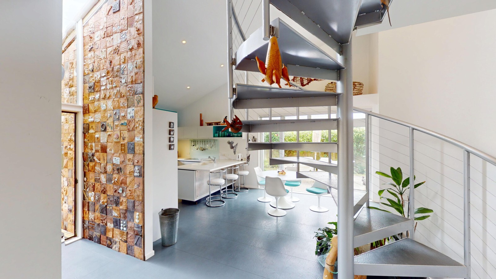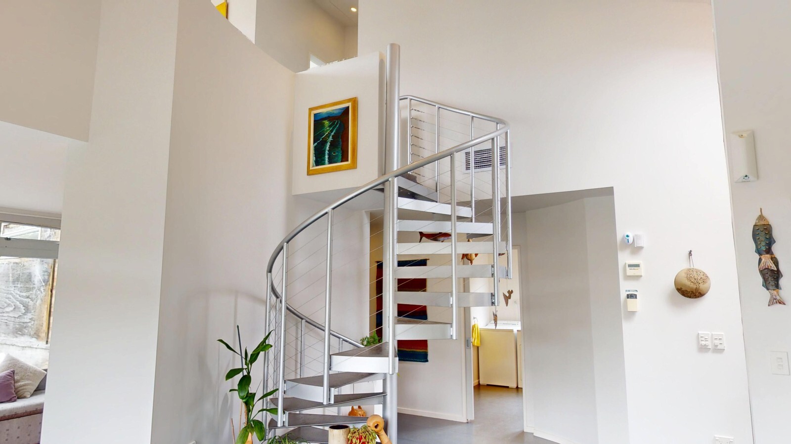 Upstairs, a striking spiral staircase leads to a second living space with a hard-wearing rubber tile floor, private deck, and lovely eastern views. The property is fully fenced and features well-designed gardens to both the east and west, plus a welcoming driveway leading to a double garage.