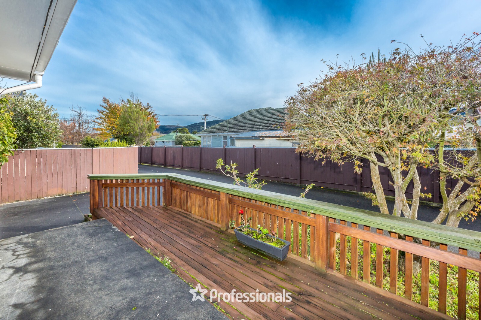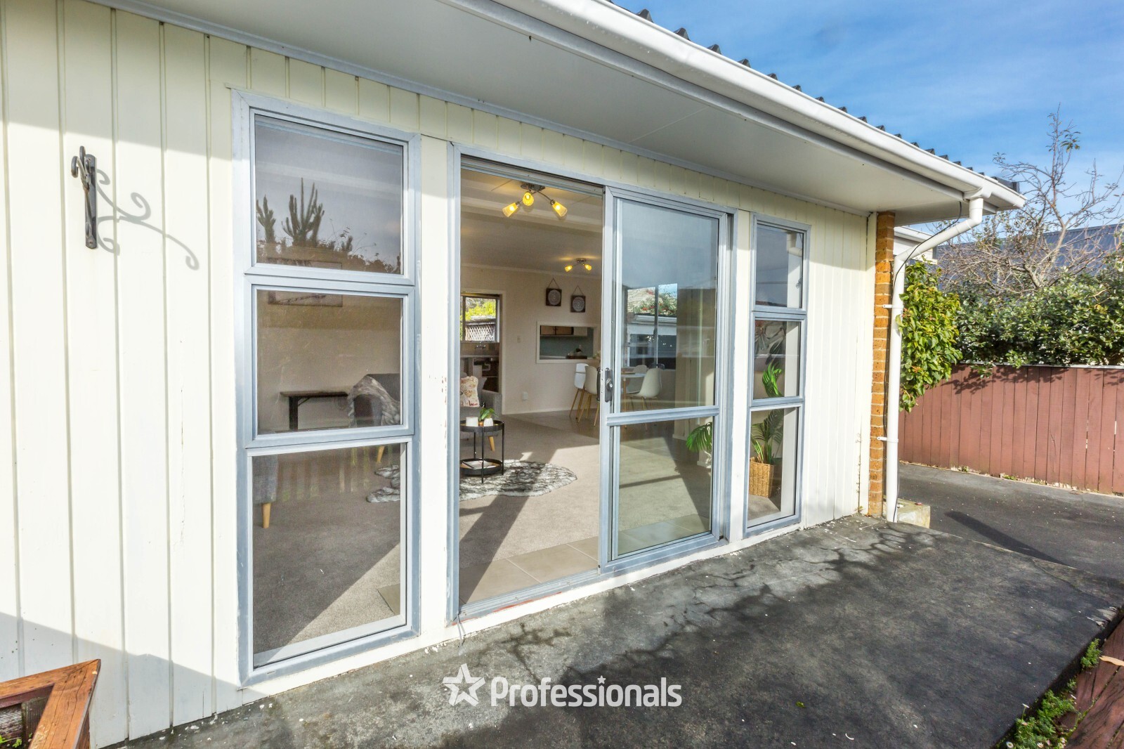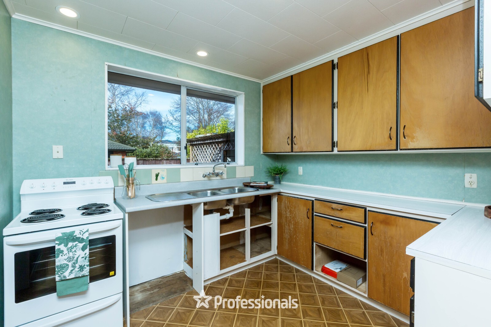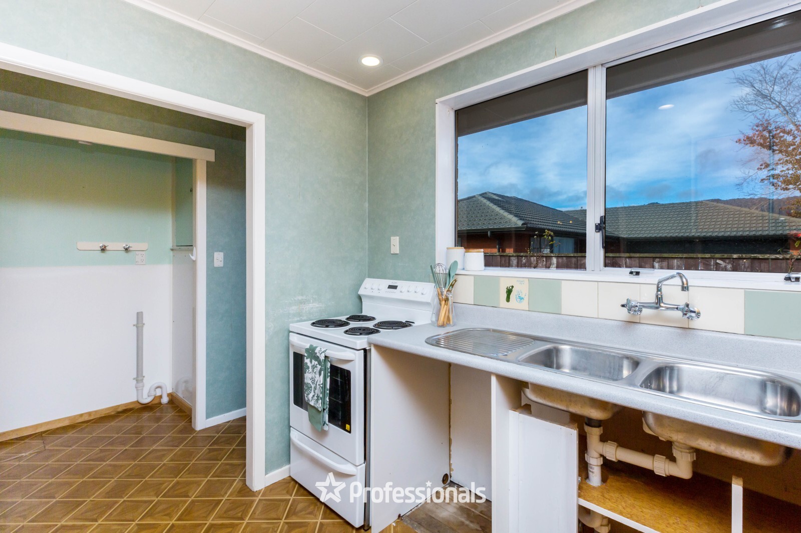 The open plan living and dining area features a modern heat pump, tiled entry and ranch slider door to a sunny patio and decking. The standard kitchen is functional but ready for an upgrade, offering clear potential to modernise and add value.