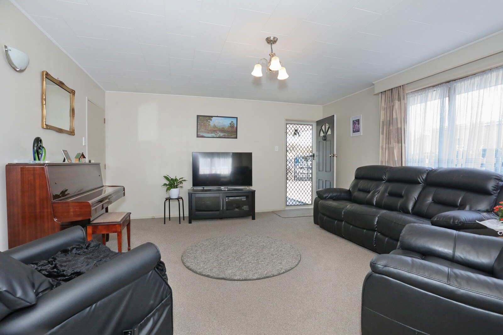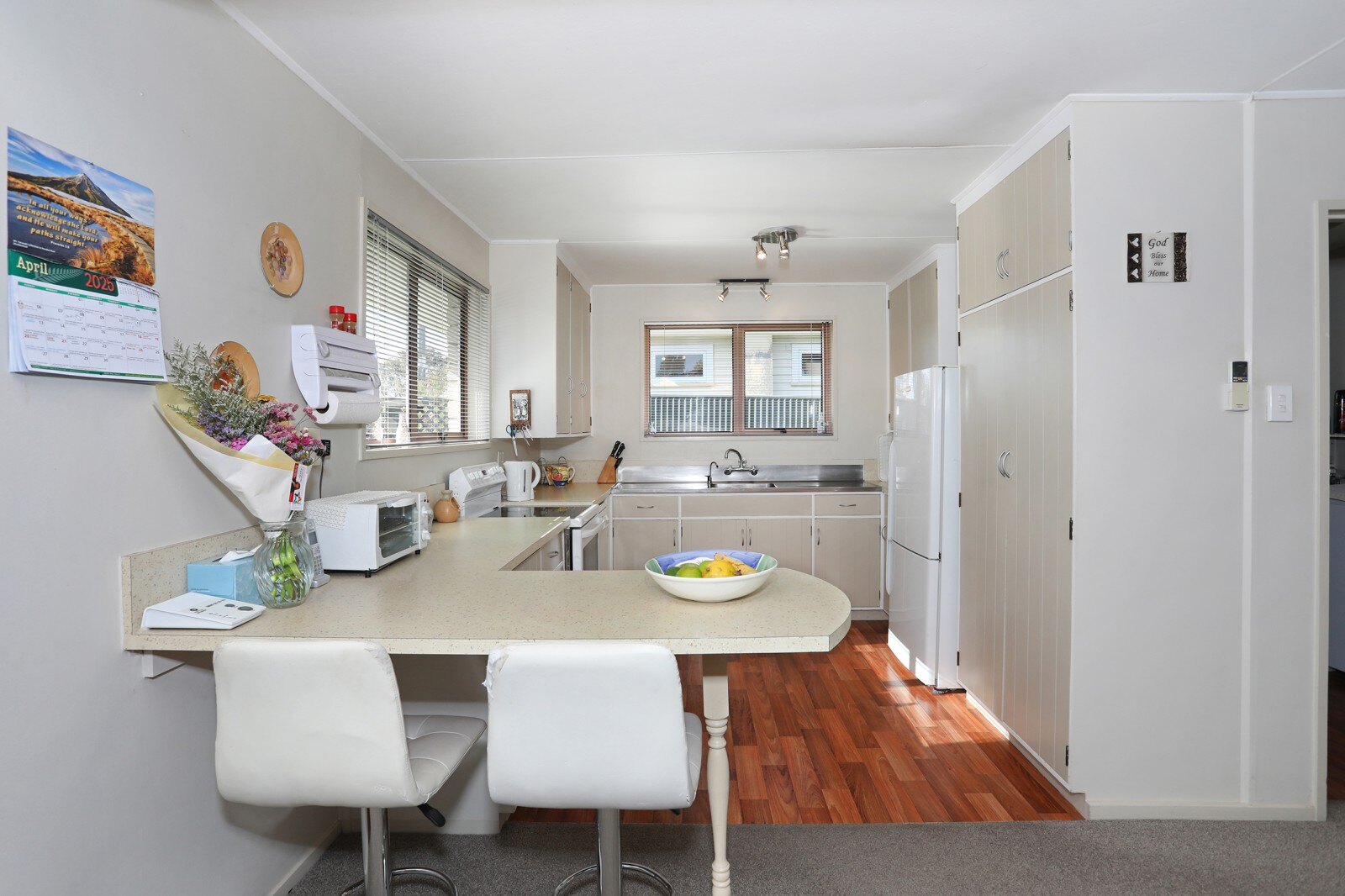 Watch the world go by from this location, a generous, neutrally decorated home, well suited to a couple, having a large living area with a heat pump plus three double bedrooms - two have double wardrobes and the third room would even make a perfect hobby room or workshop. There is a separate laundry, bathroom has a pedestal handbasin, bath and shower, the toilet is separate.