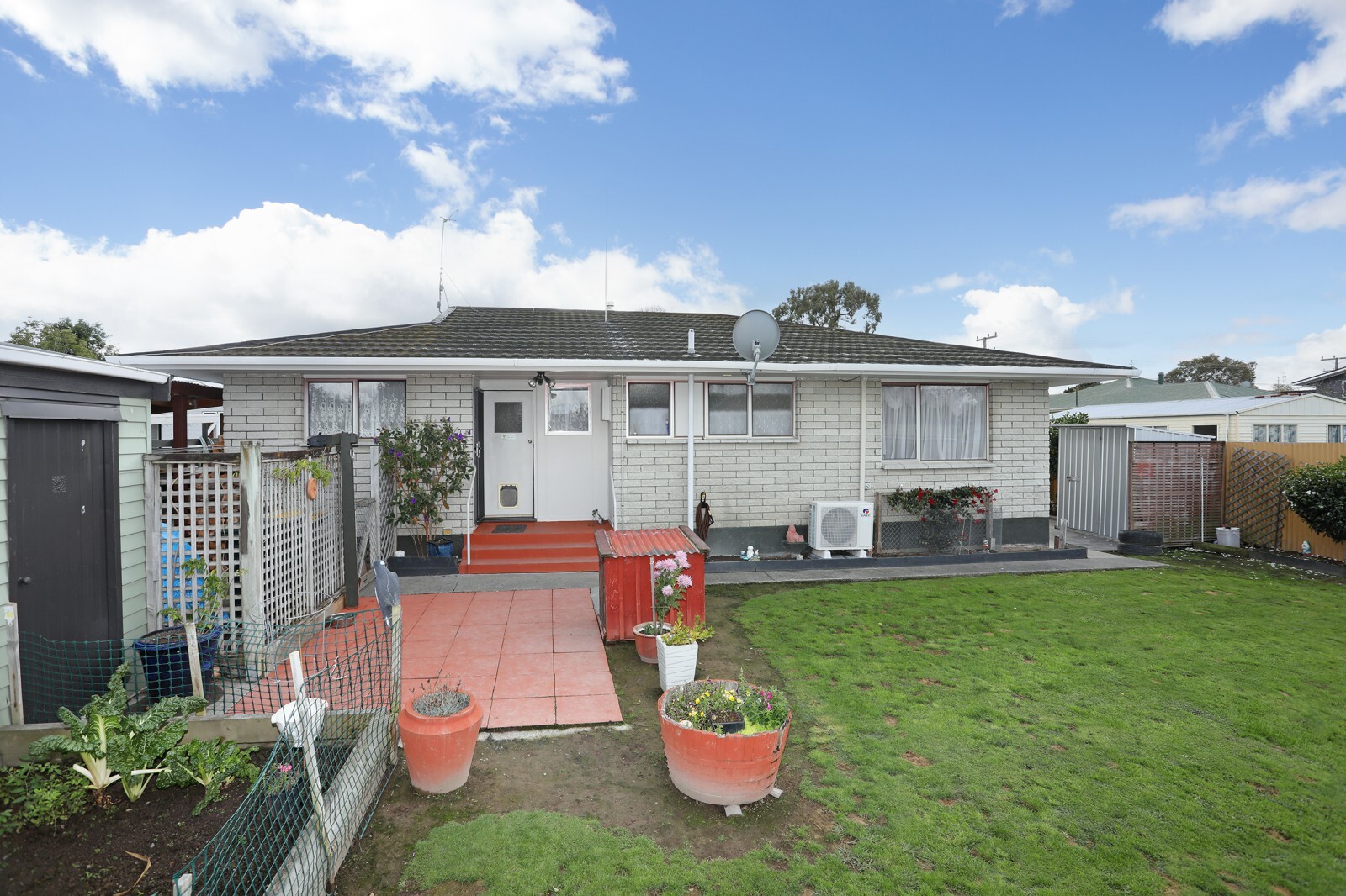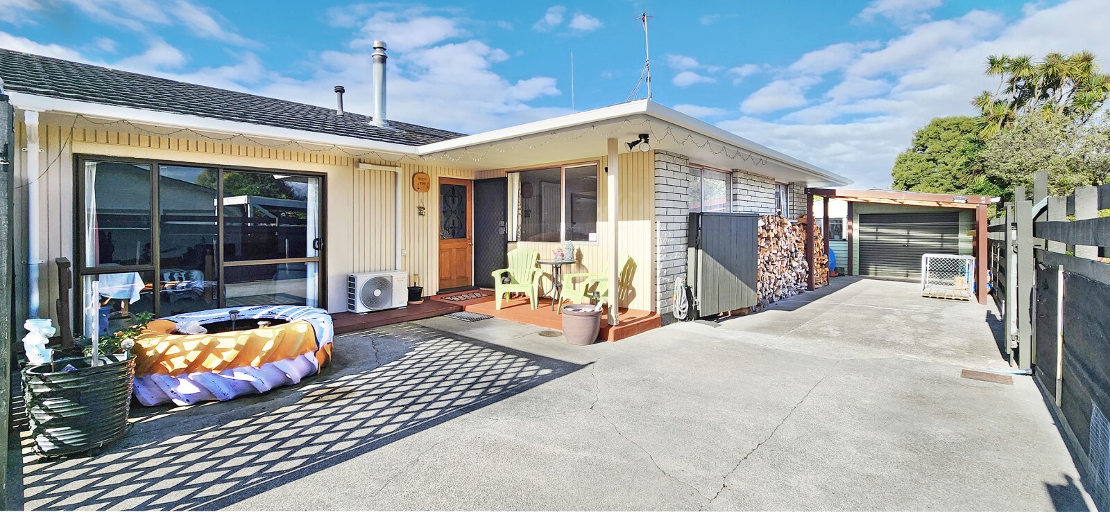 A generous 150m2 (including converted garage) rear brick unit offering three bedrooms and a versatile second living/games room created from the original internal access garage. This space is not consented as a living area but offers great additional utility, complete with heatpump and sliding doors to afternoon sun. There are also three bedrooms, open plan dining/lounge heated with logfire plus heatpump, heat transfer and separate kitchen. The bathroom has a shower, bath and vanity, separate toilet and separate laundry. All this sits on a 610m2 freehold section with lots of concrete, garden shed, separate garage with workshop space, plus a carport, but still grass for the pets and fully fenced.