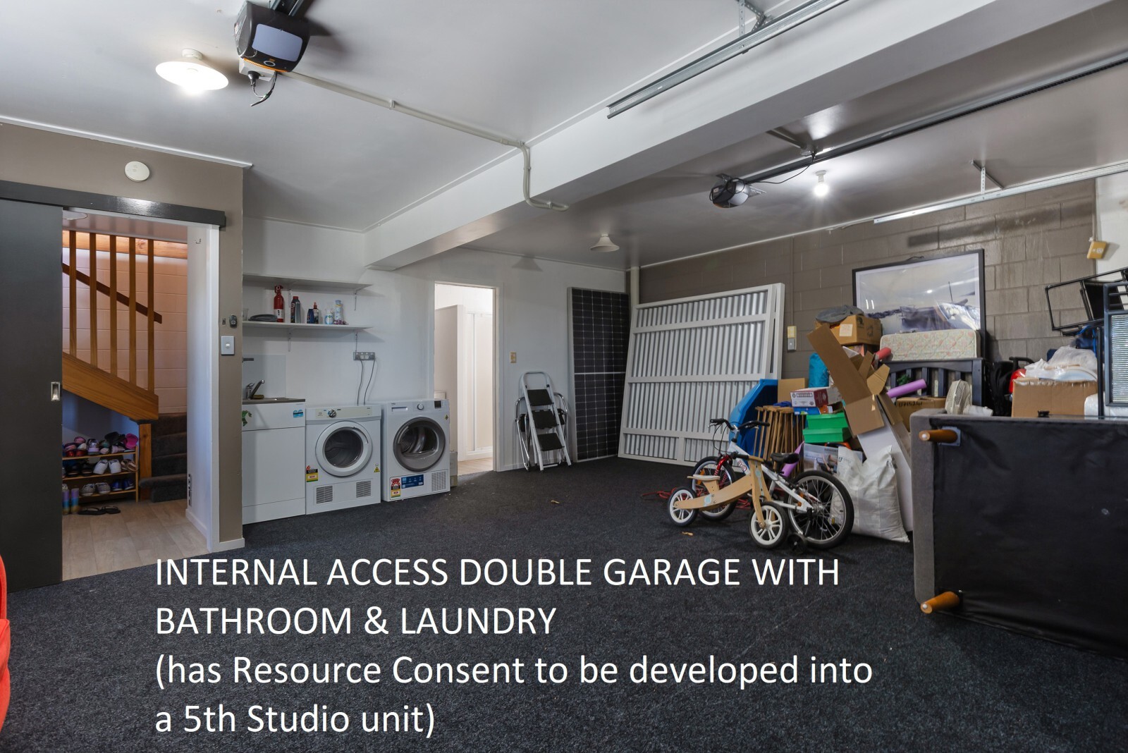 The double lock-up garage that is on the northern side of the building and adjacent to the unit # 4 has extensive storage, laundry and an adjoining bathroom. This area has received Resource Consent to be developed into a 5th studio apartment. If the new owner completed this, there would be a rent expectation of $350/wk (or $18,000/yr)