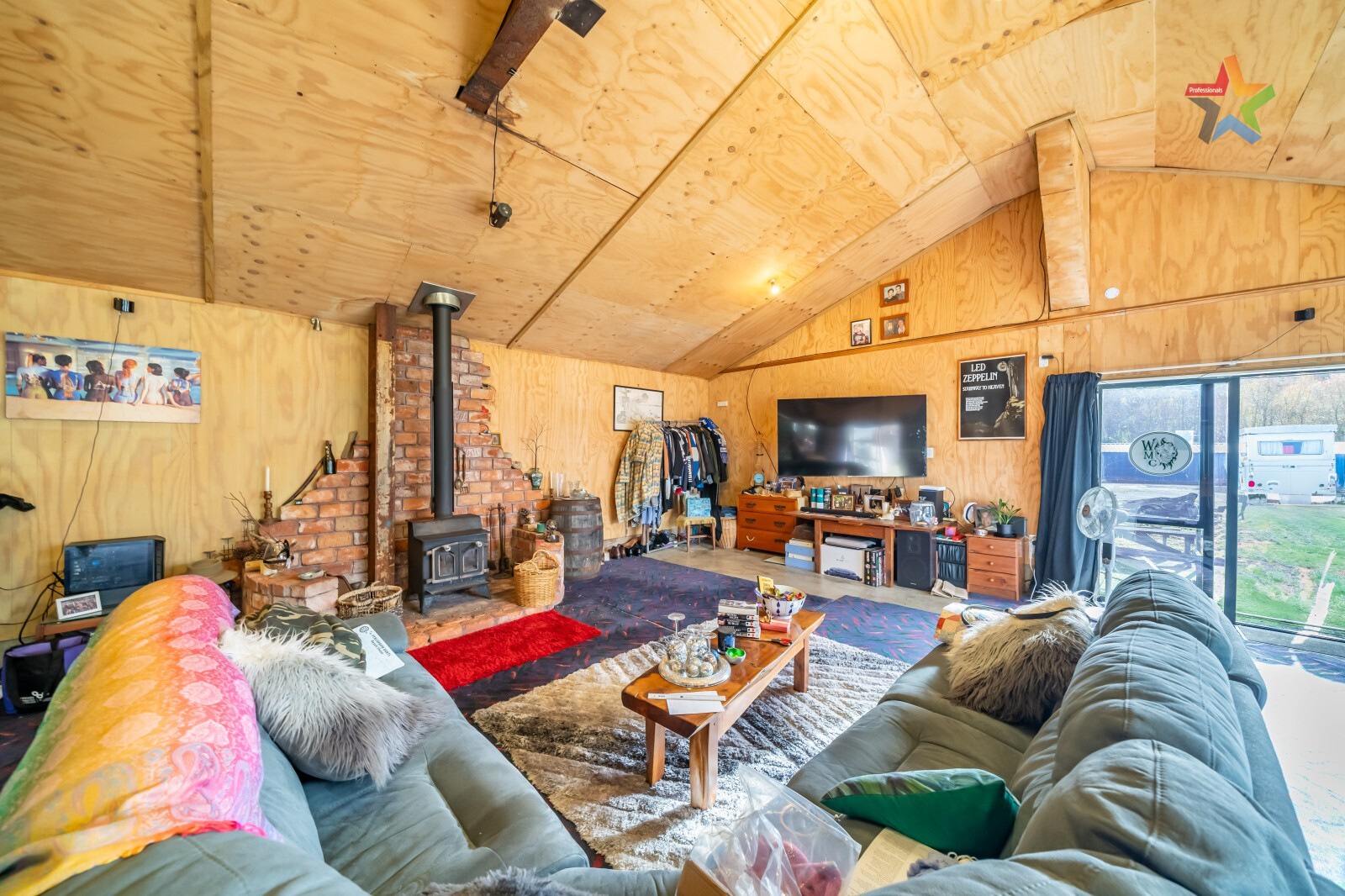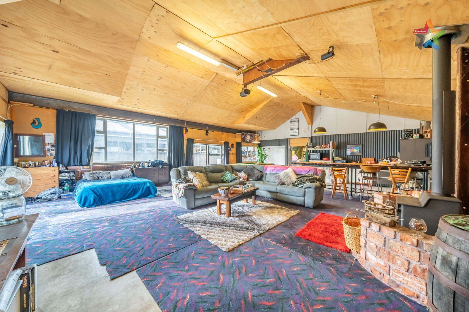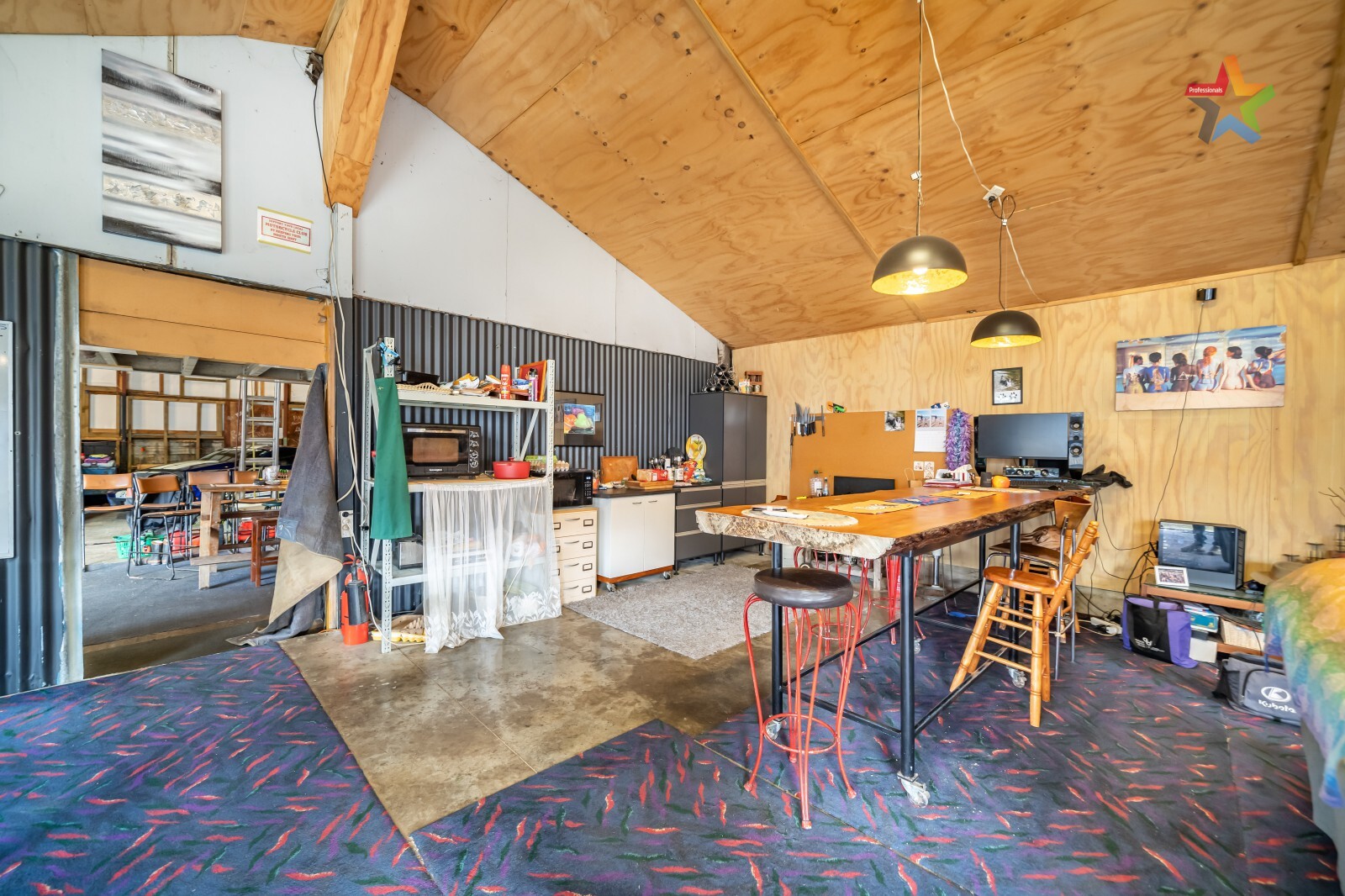 Multi-Use Space: One half features a fully functional workshop with a shower, toilet, and a makeshift kitchen area.