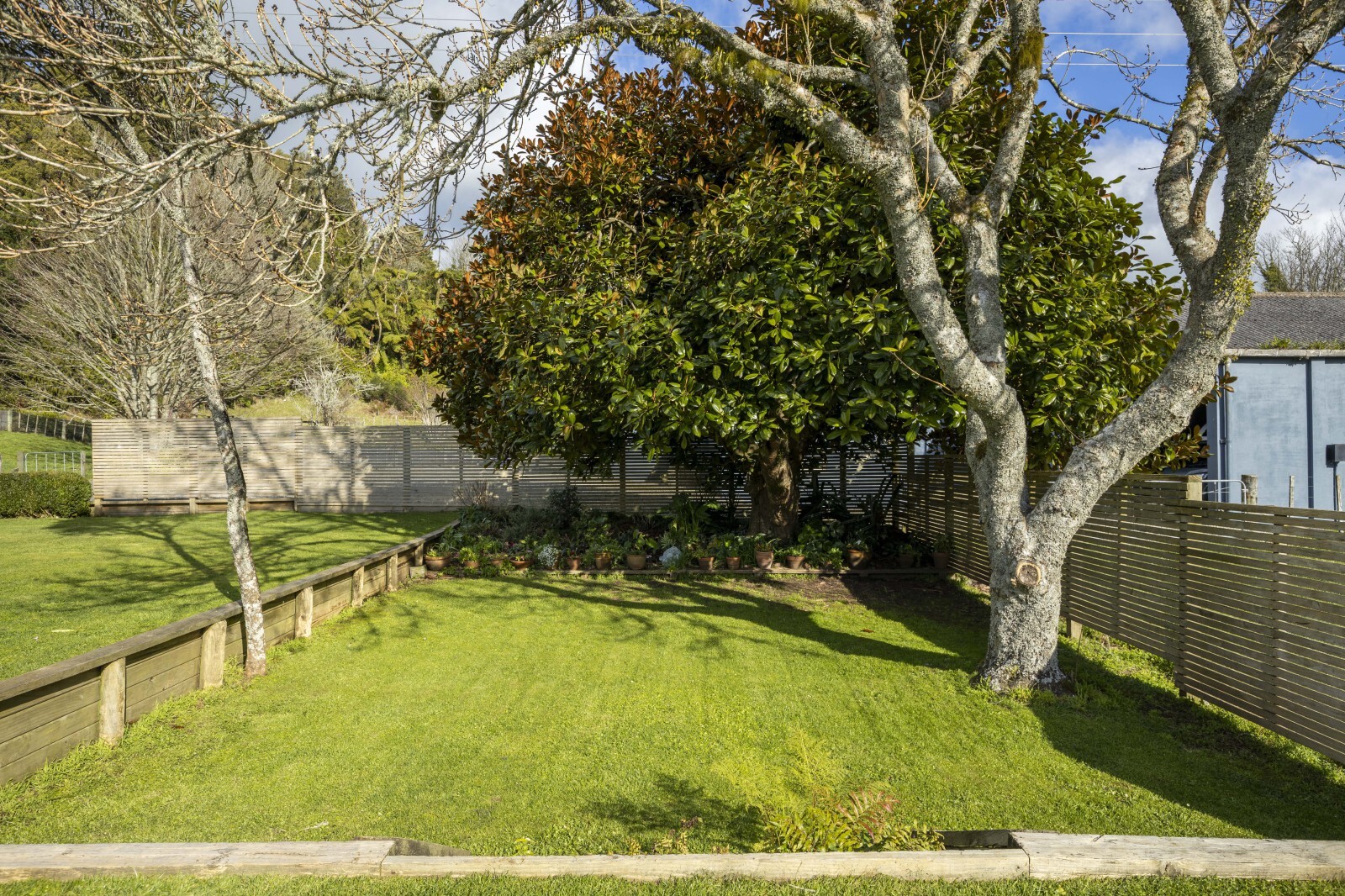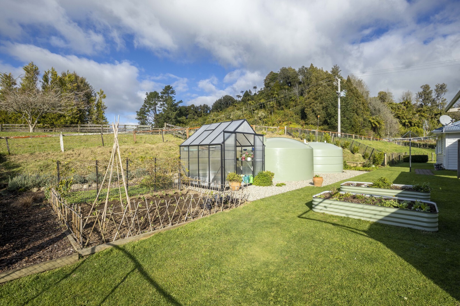 Outside the terraced back lawn leads to a fully fenced paddock with electric fencing and water trough, ideal for the pony or a few sheep. Raised vegetable beds, a greenhouse, and established gardens support a self-sufficient lifestyle.